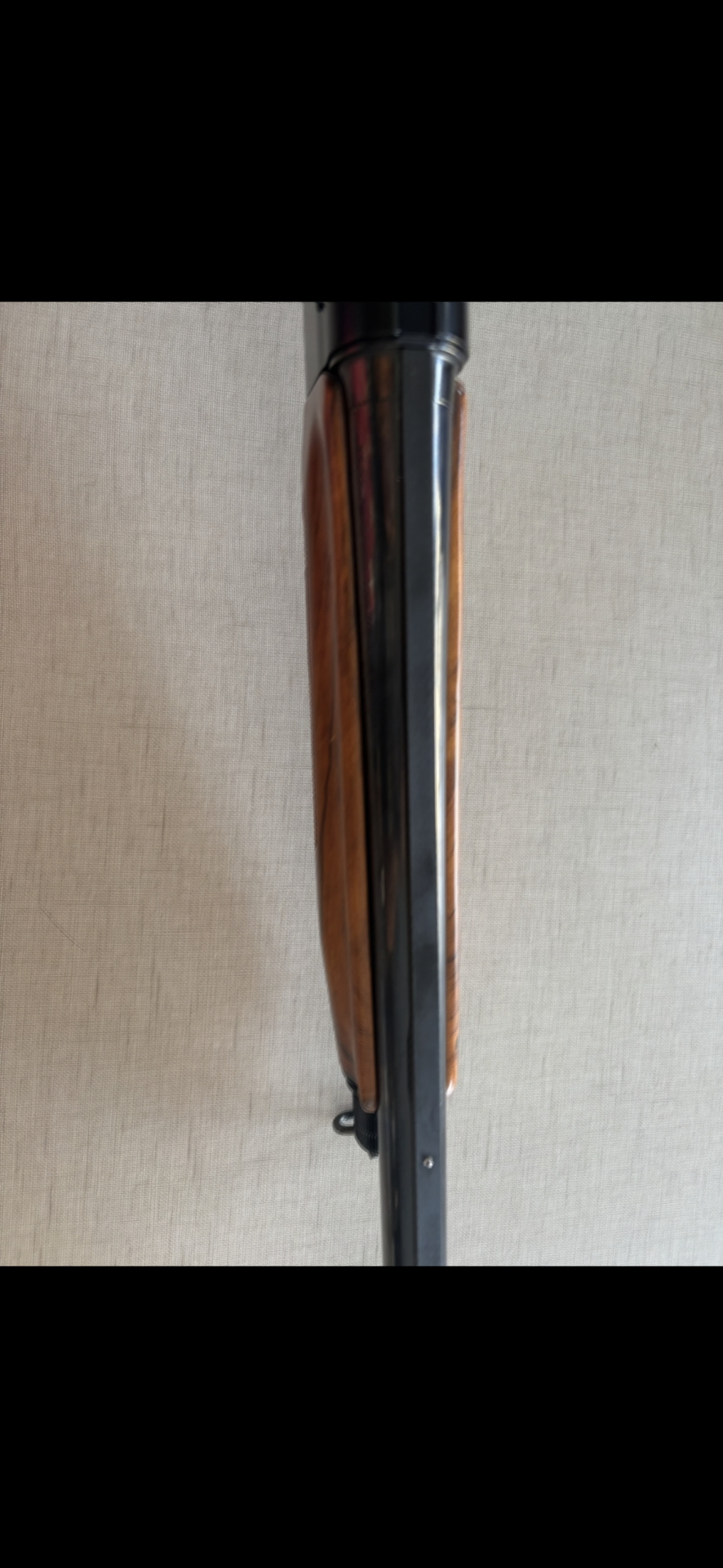 Cano de caçadeira em madeira escura com detalhe antiderrapante e borracha preta