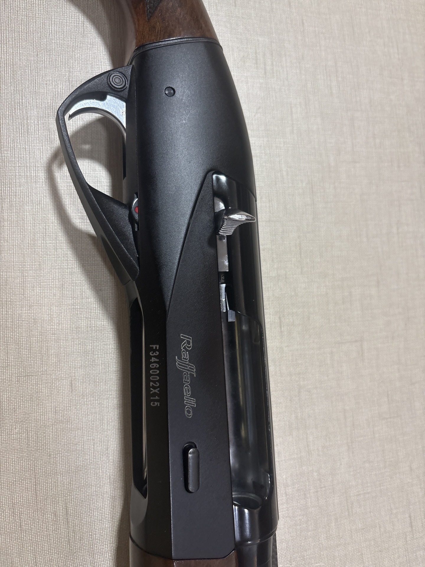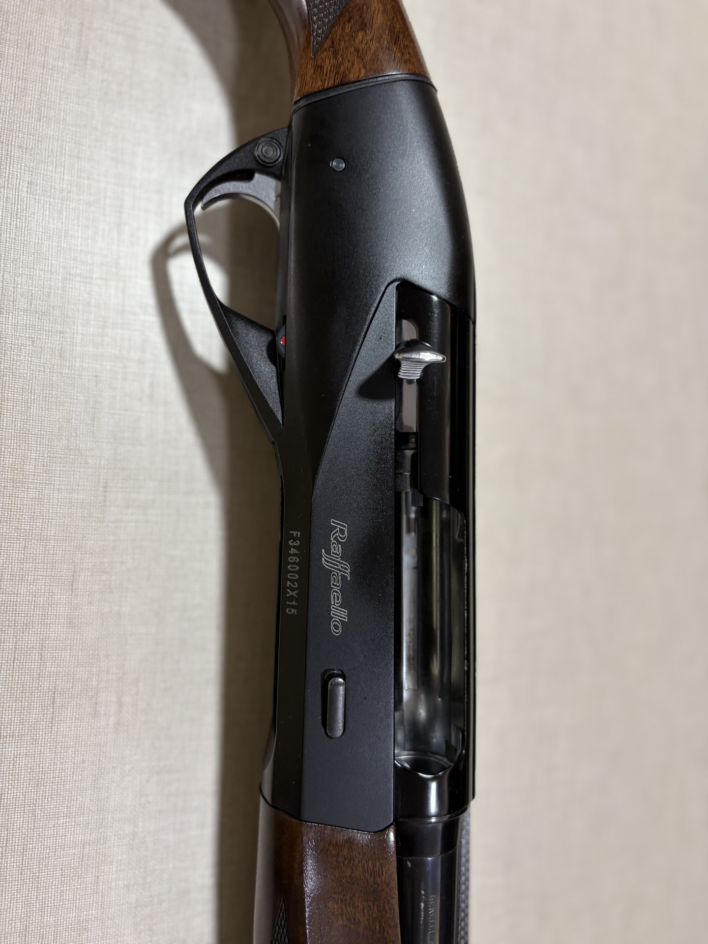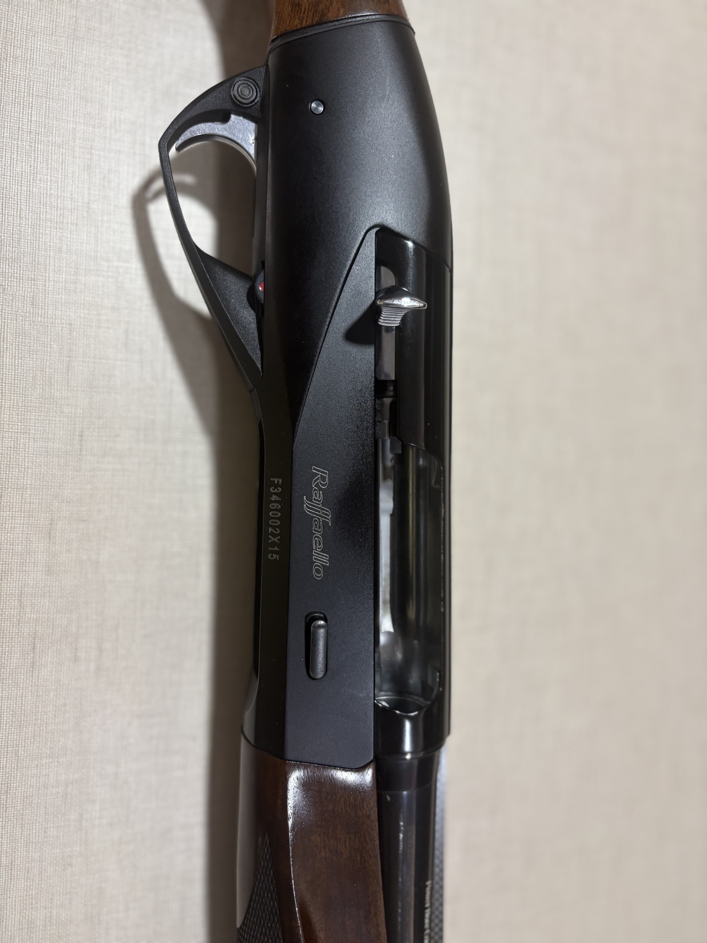 Espingarda Raffaello com coronha de madeira e corpo preto com gravações visíveis.