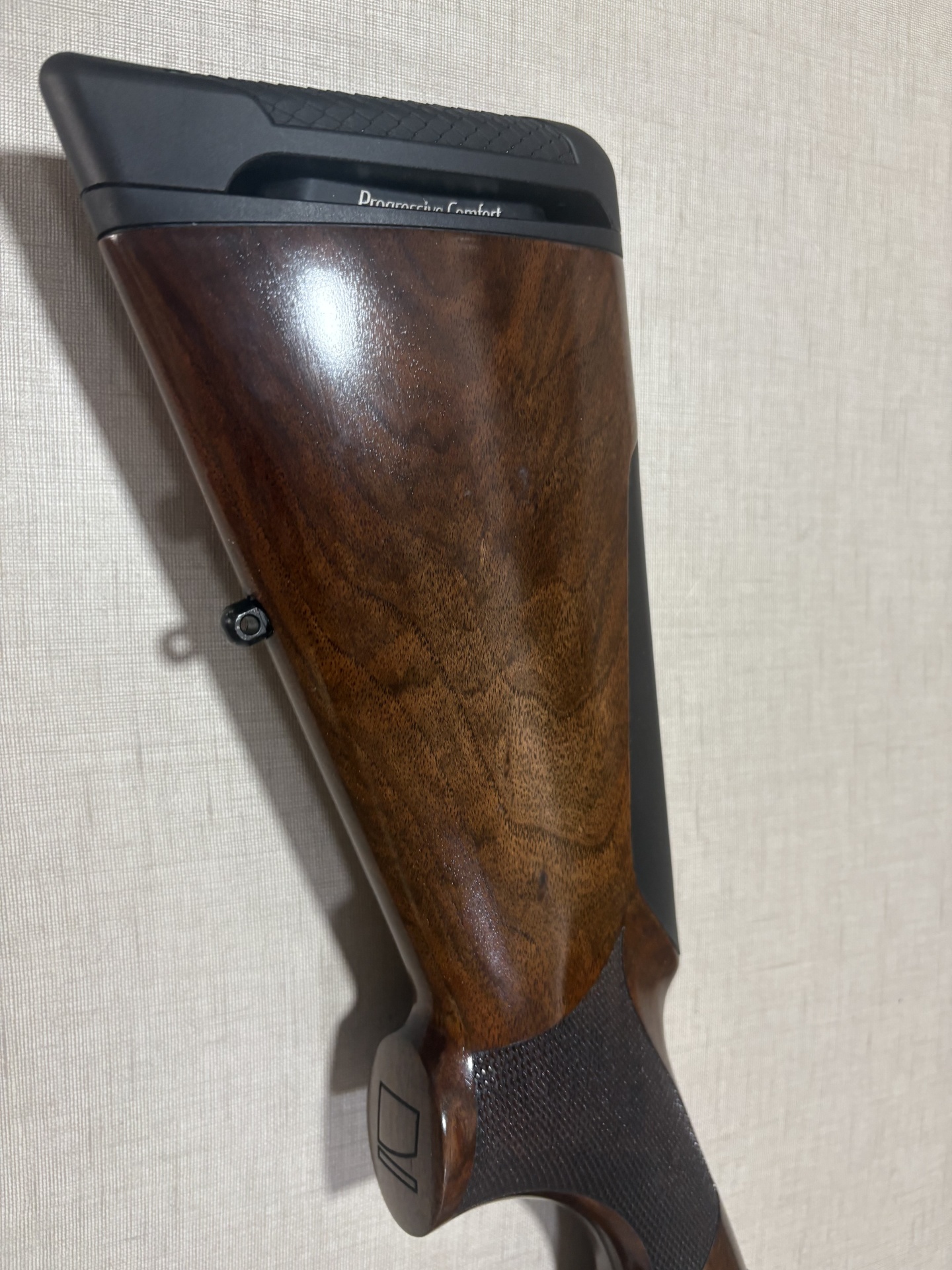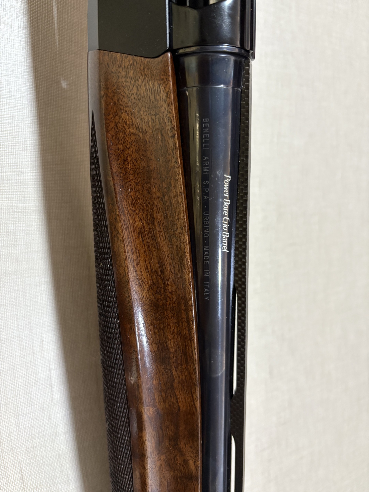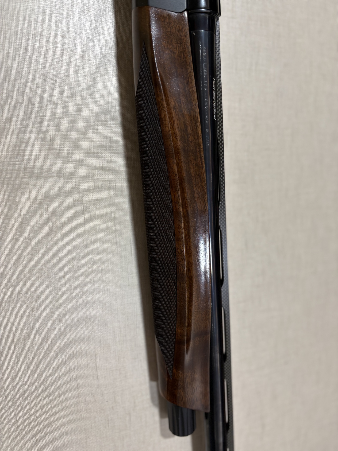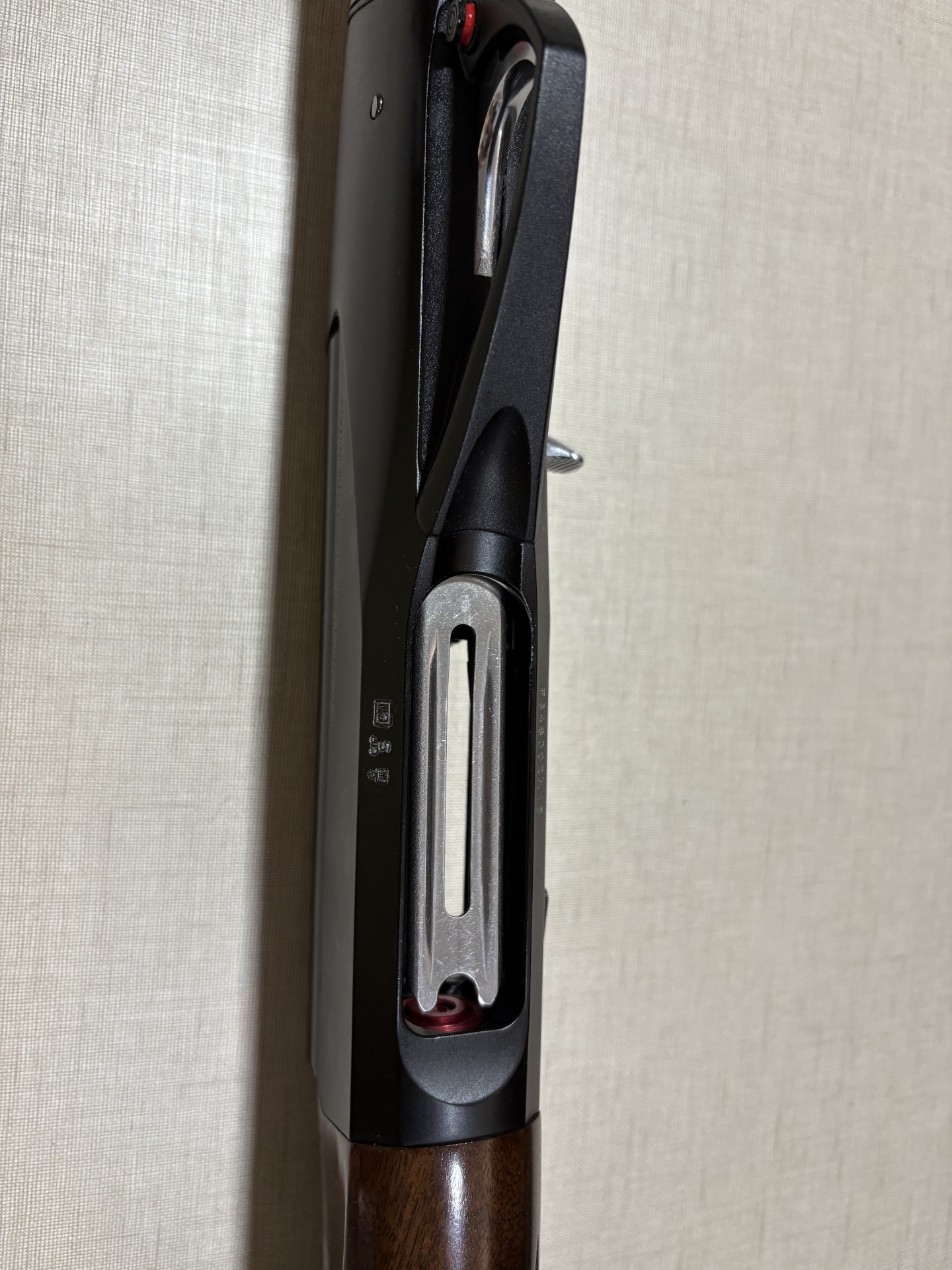 Espingarda Raffaello com coronha de madeira e corpo preto com gravações visíveis.