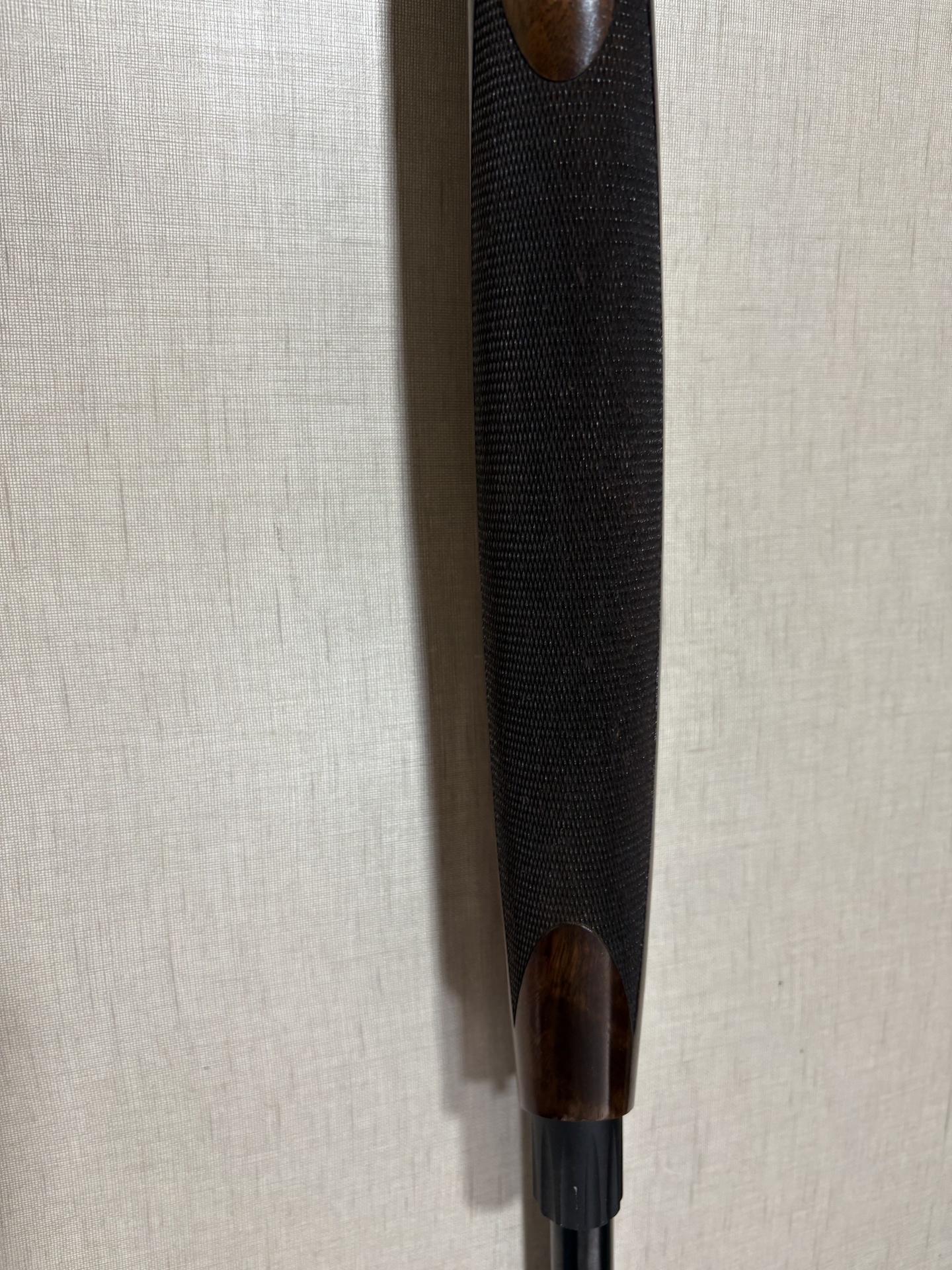 Espingarda com madeira castanha e cano preto encostada numa parede beige.