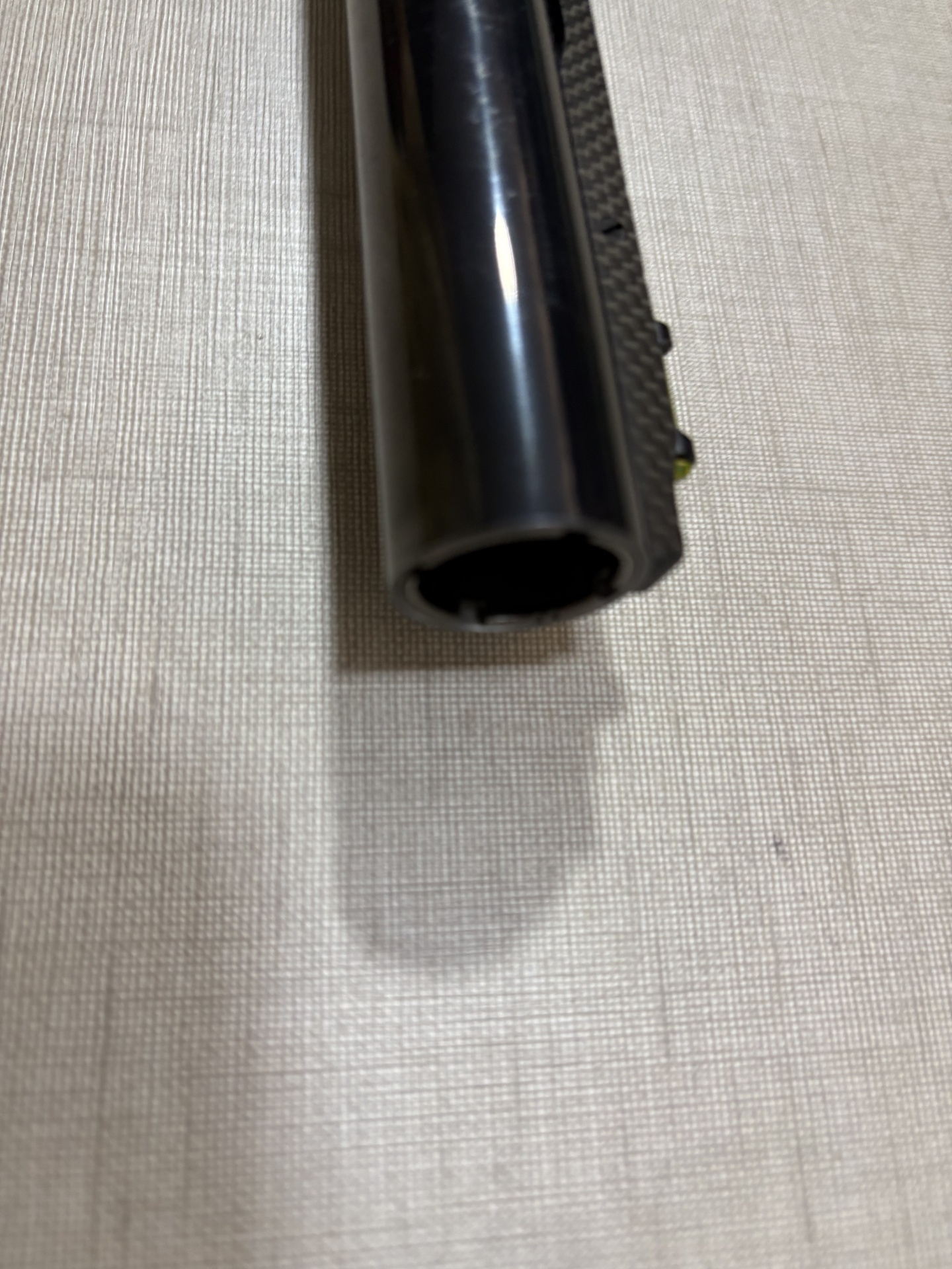 Objeto cilíndrico preto com textura sobre superfície têxtil bege
