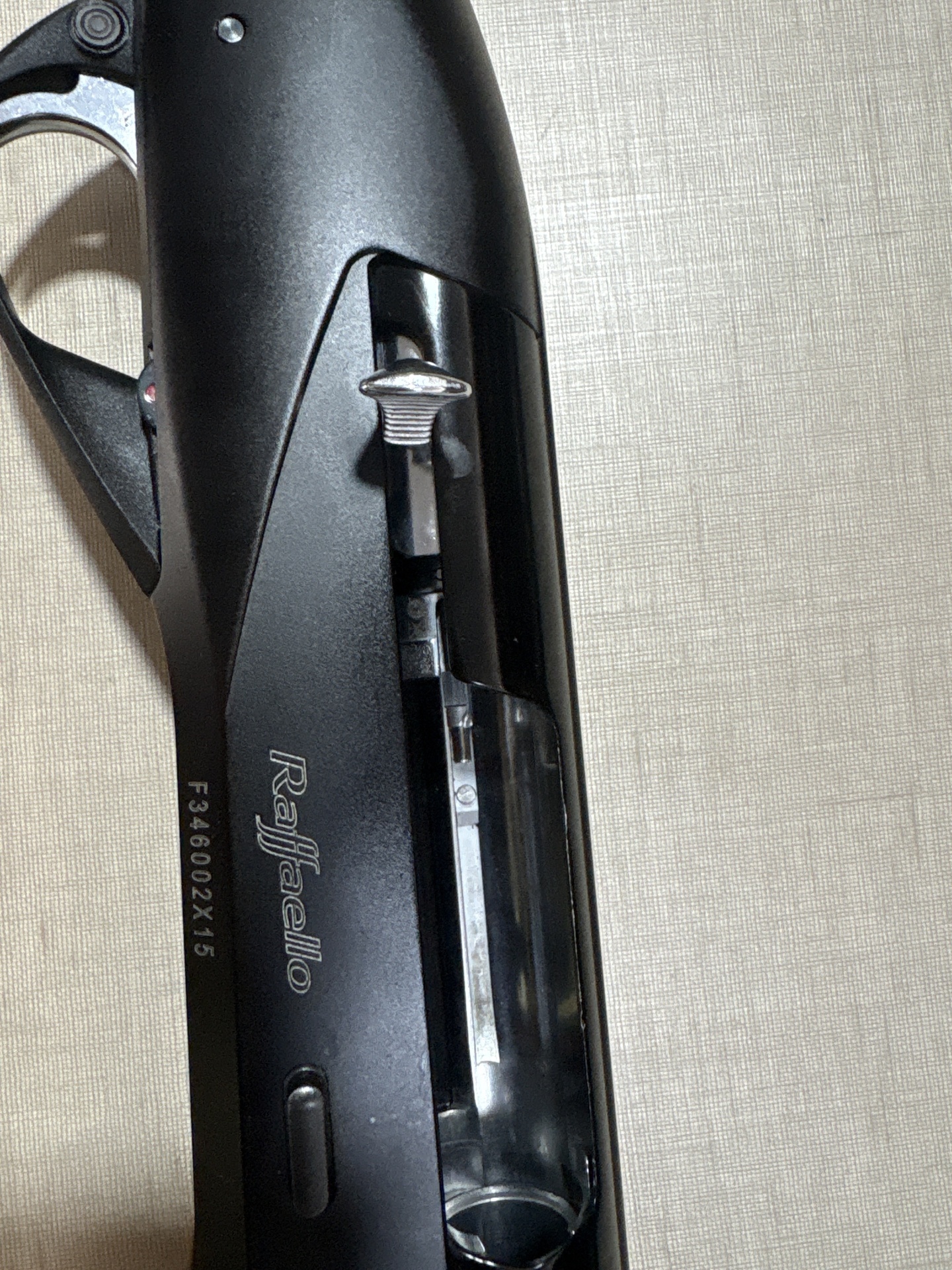Arma de fogo preta da marca Raffaello com texto visível sobre superfície bege.
