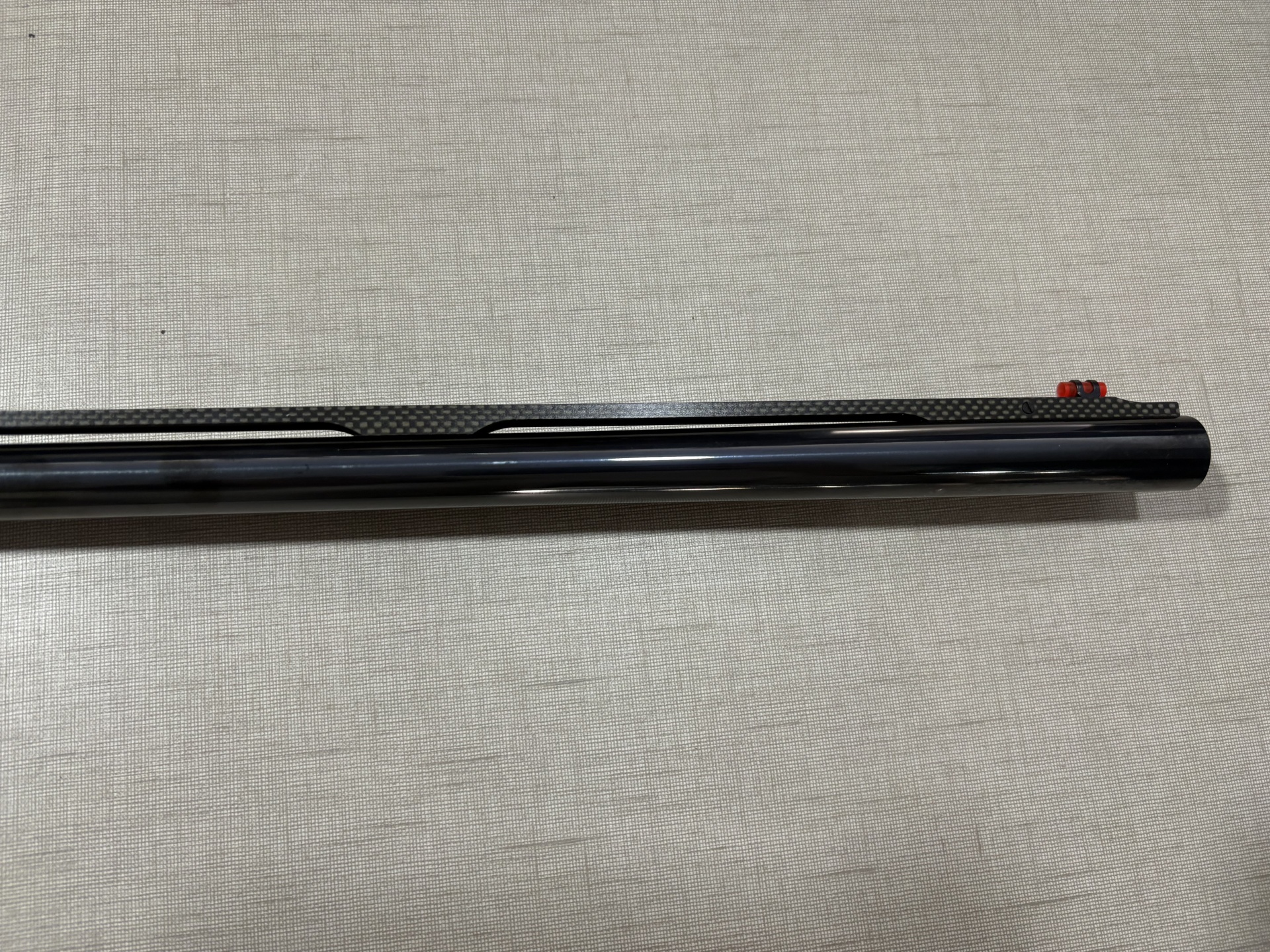 Cano de arma de fogo com acabamento preto e fibra de carbono e mira vermelha