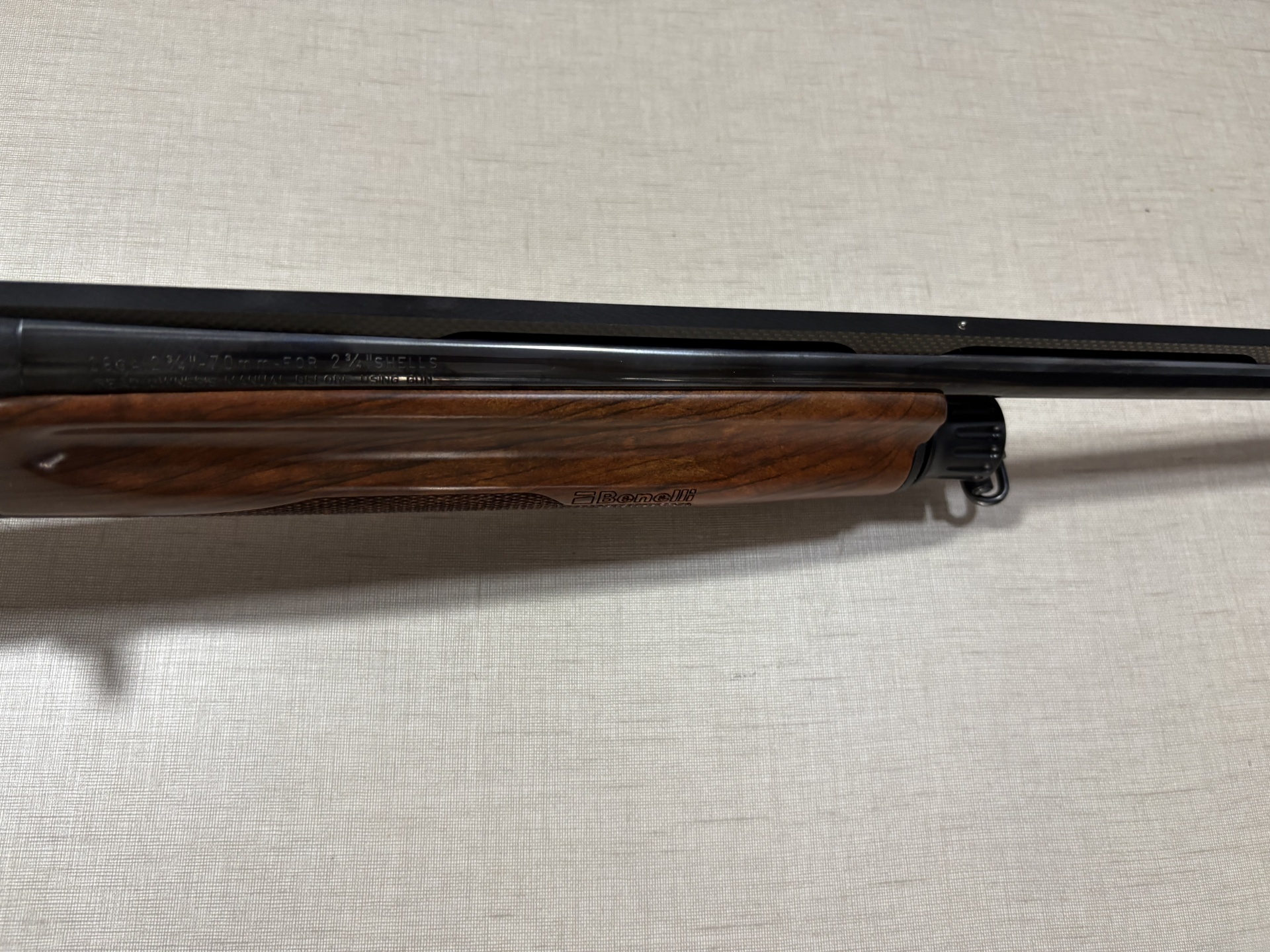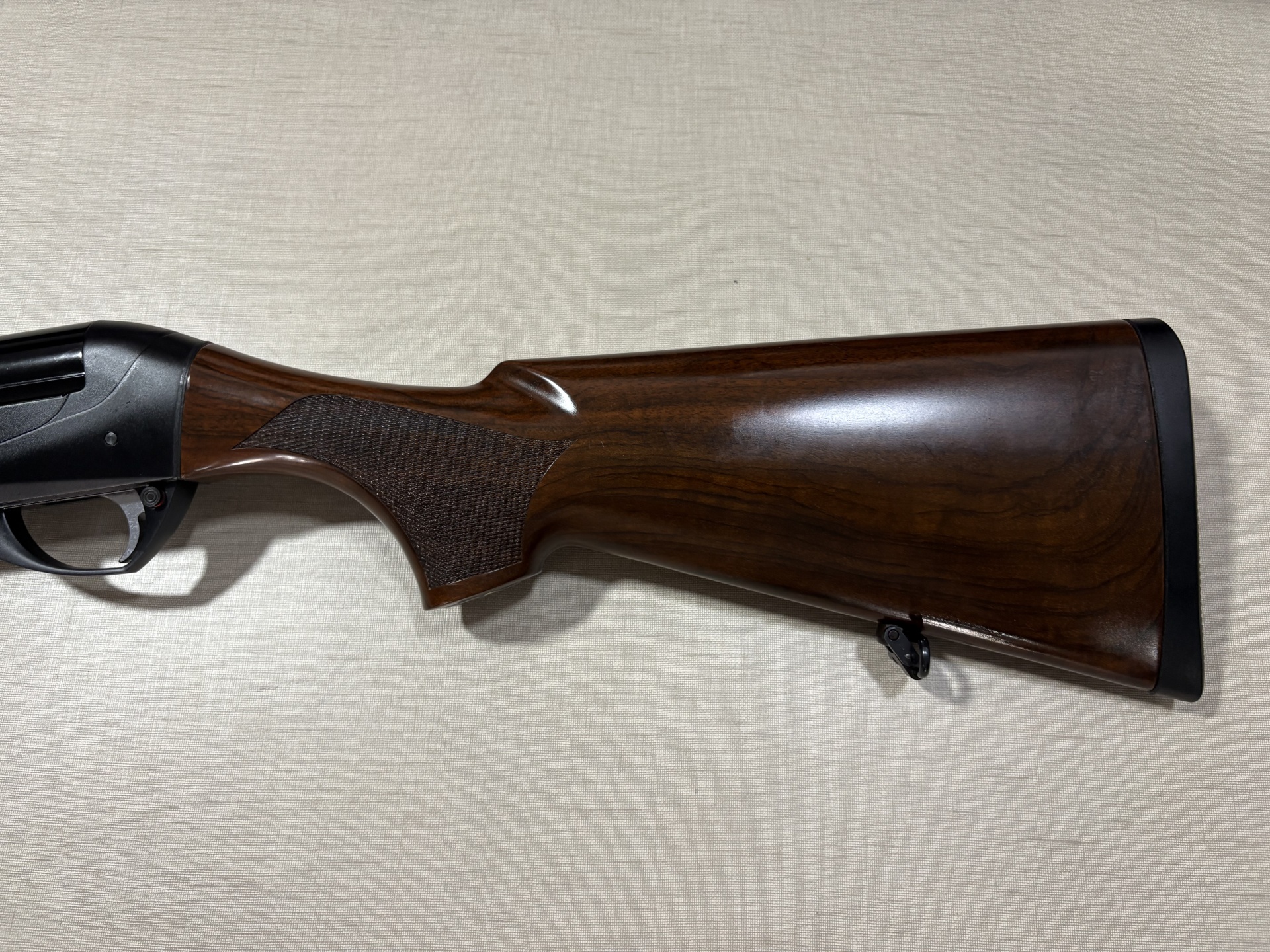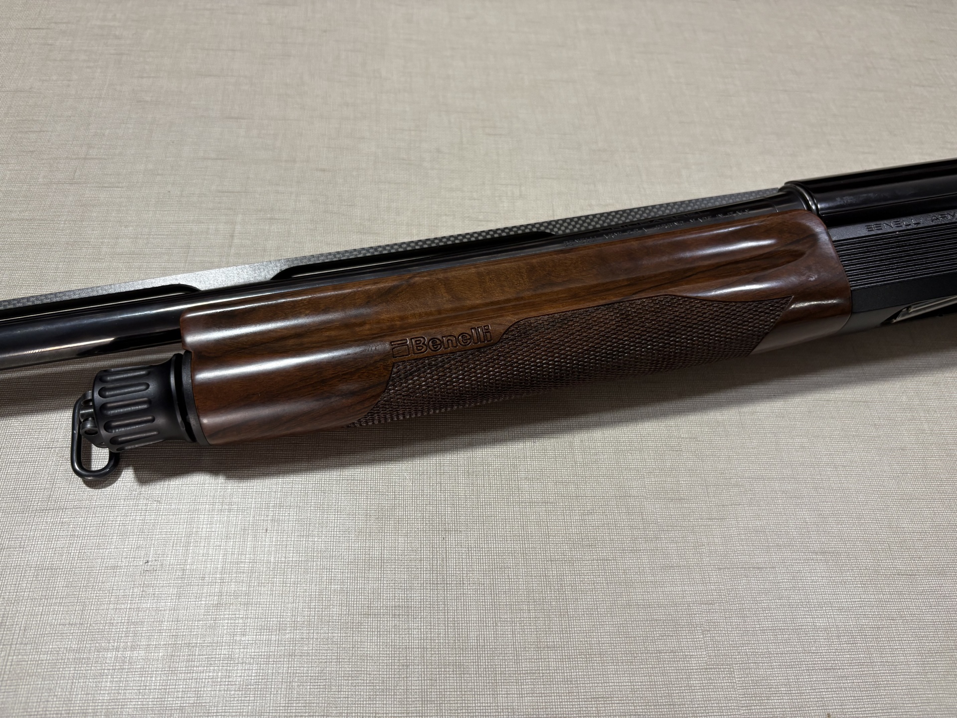 Espingarda Benelli com madeira e metal negro sobre superfície clara.