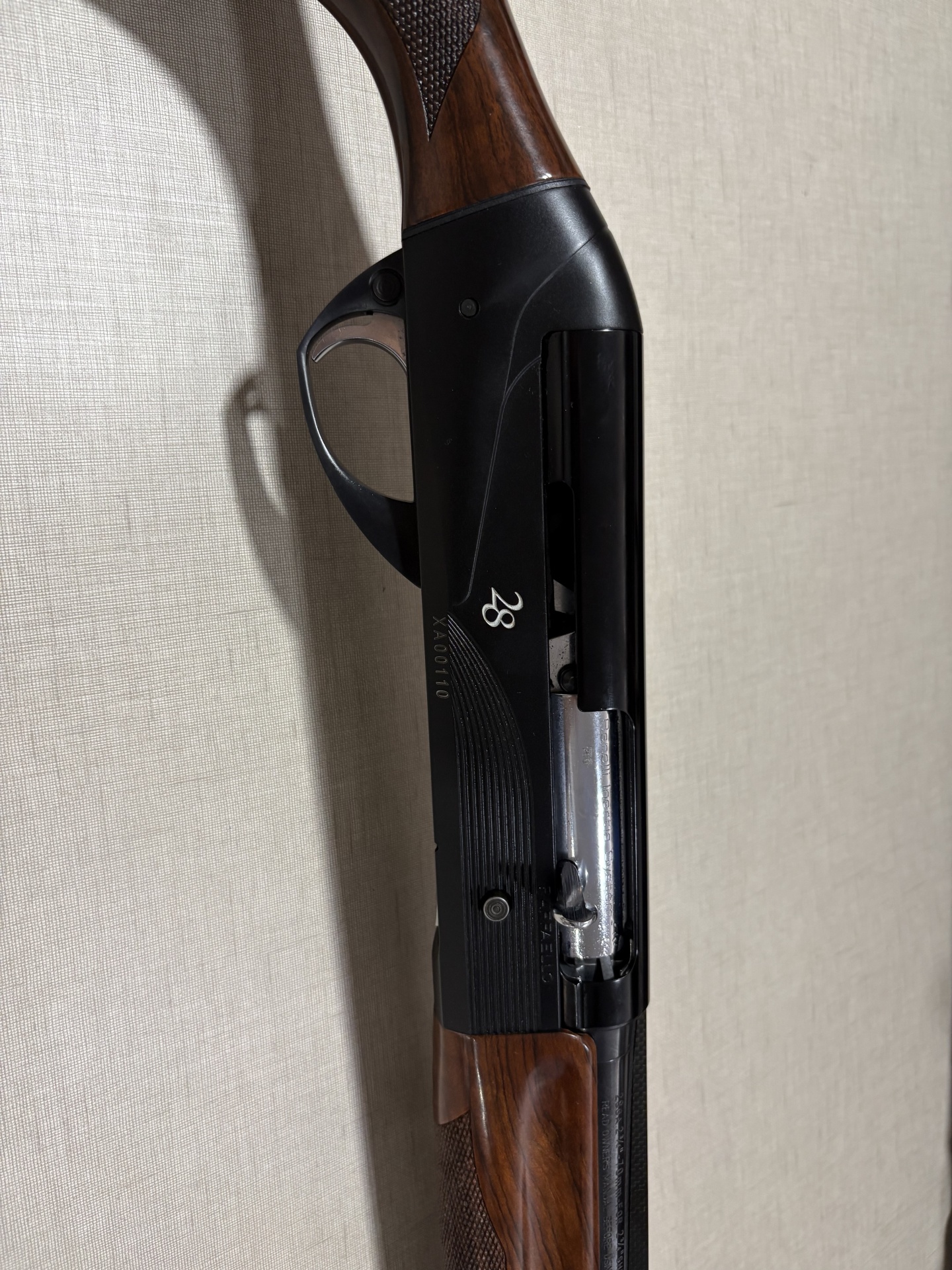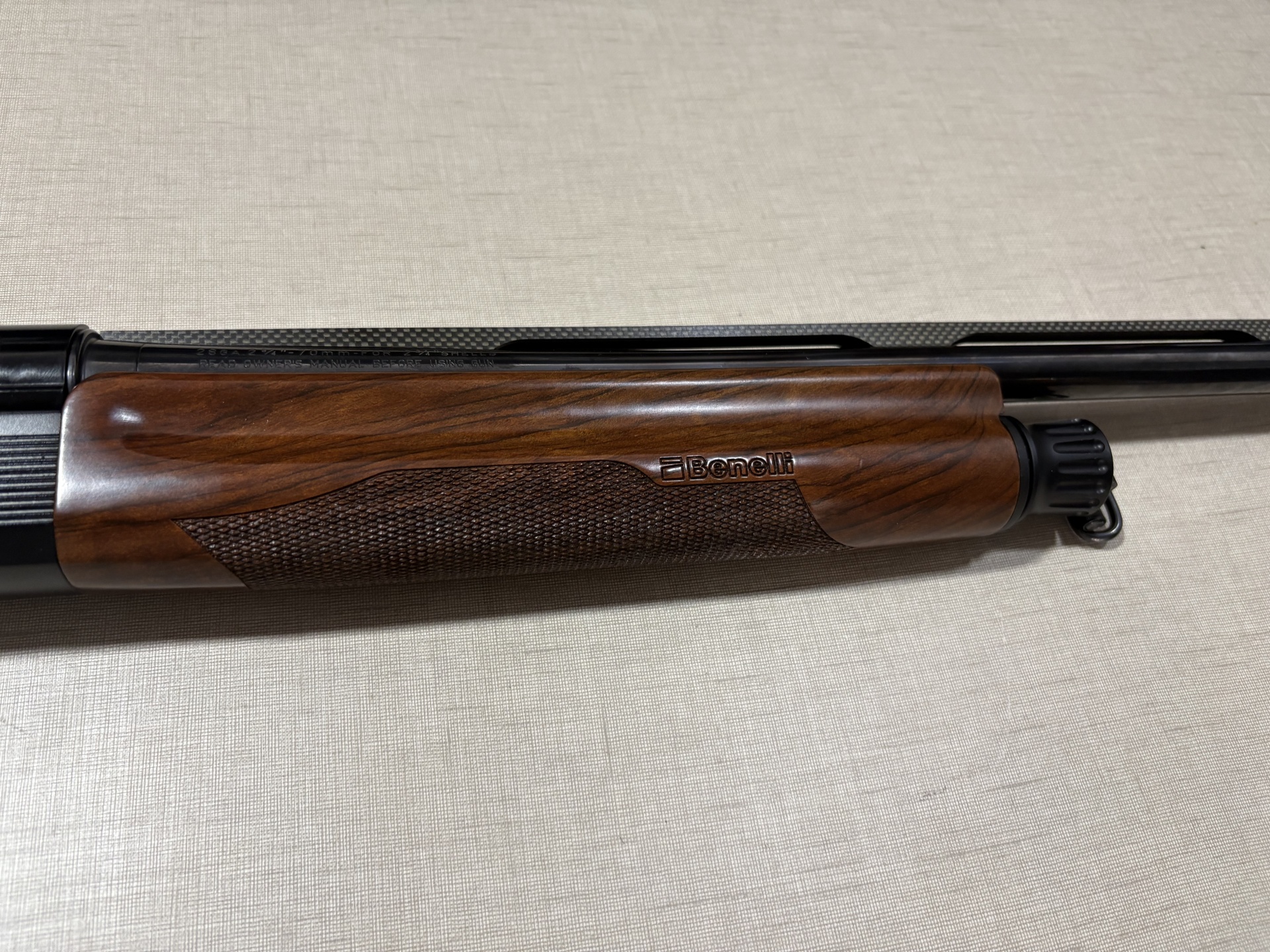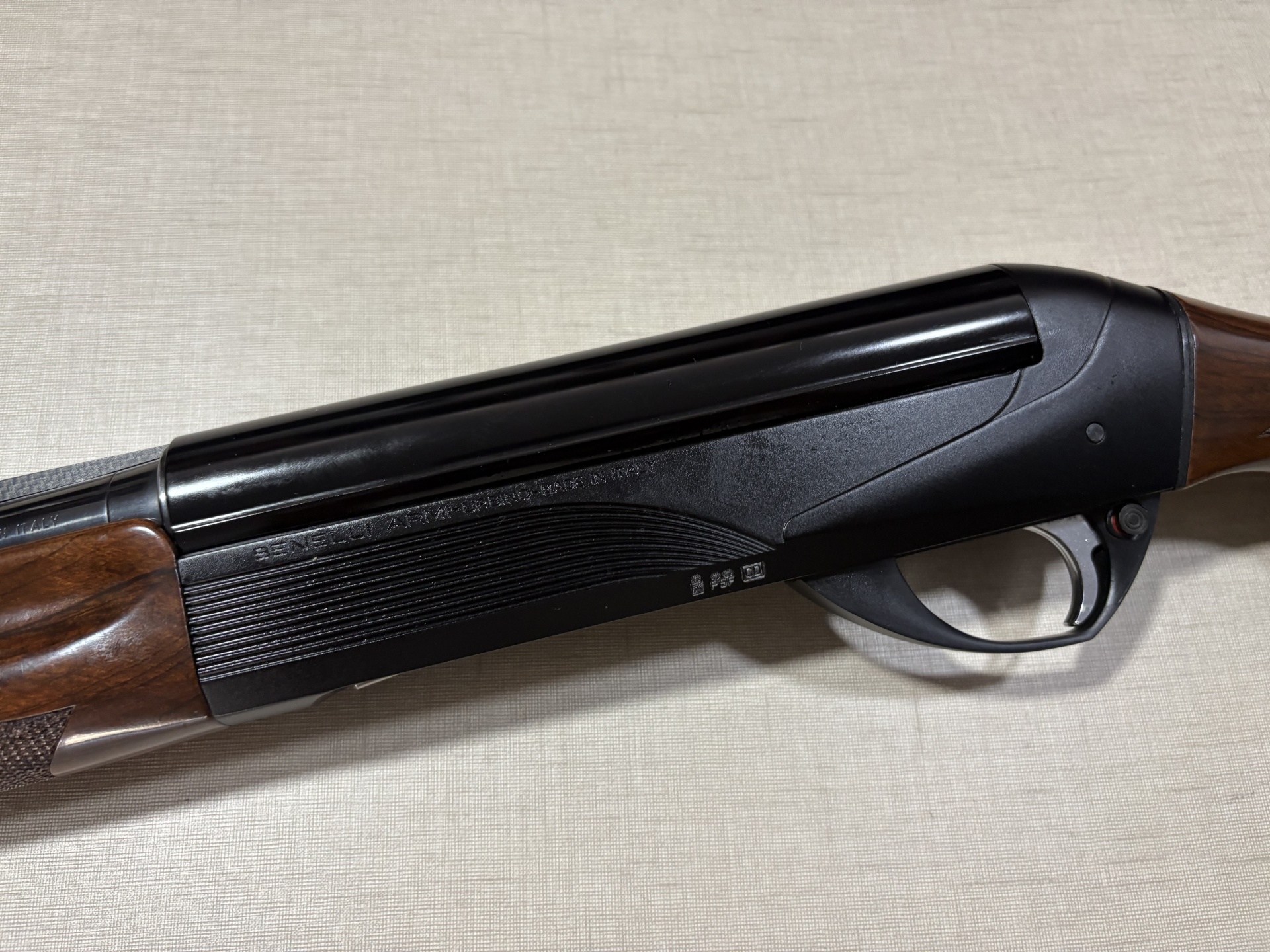 Espingarda Benelli com madeira e metal negro sobre superfície clara.