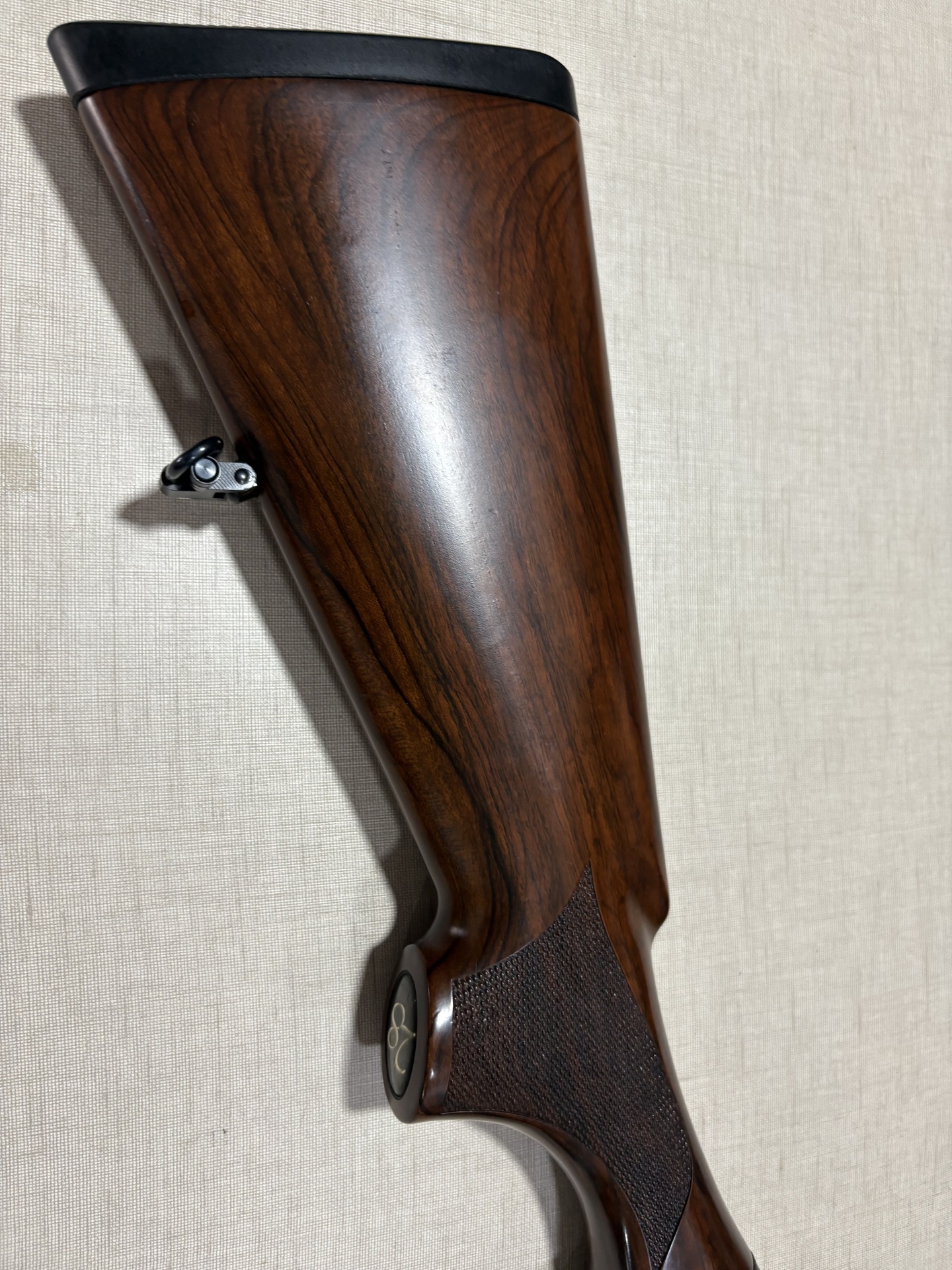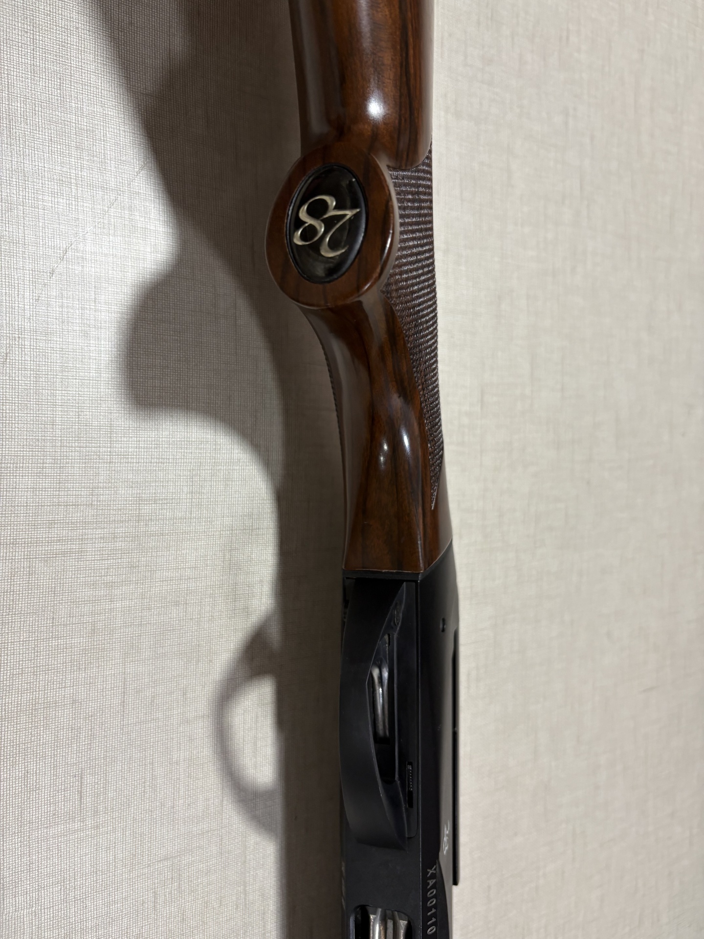Espingarda com coronha em madeira castanha polida com textura na pega
