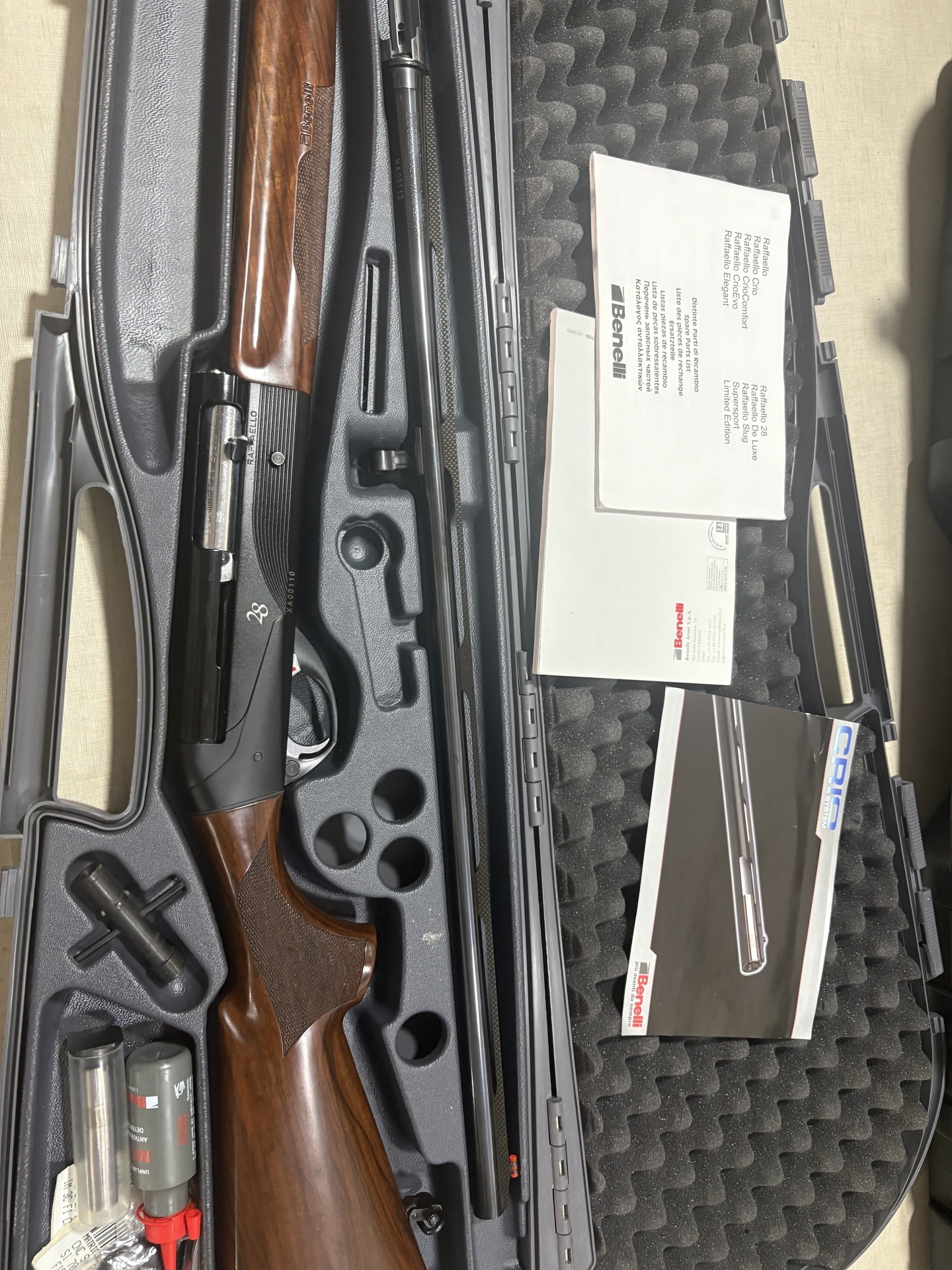 Estojo com espingarda Benelli, acessórios e manuais.