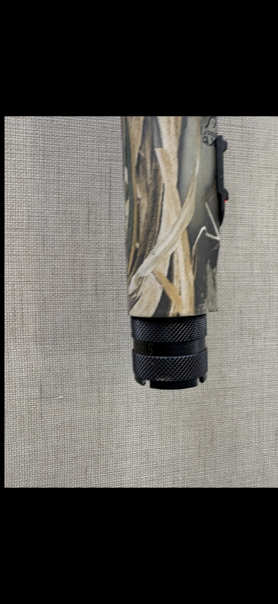 Objeto cilíndrico com padrão camuflado e extremo preto texturizado