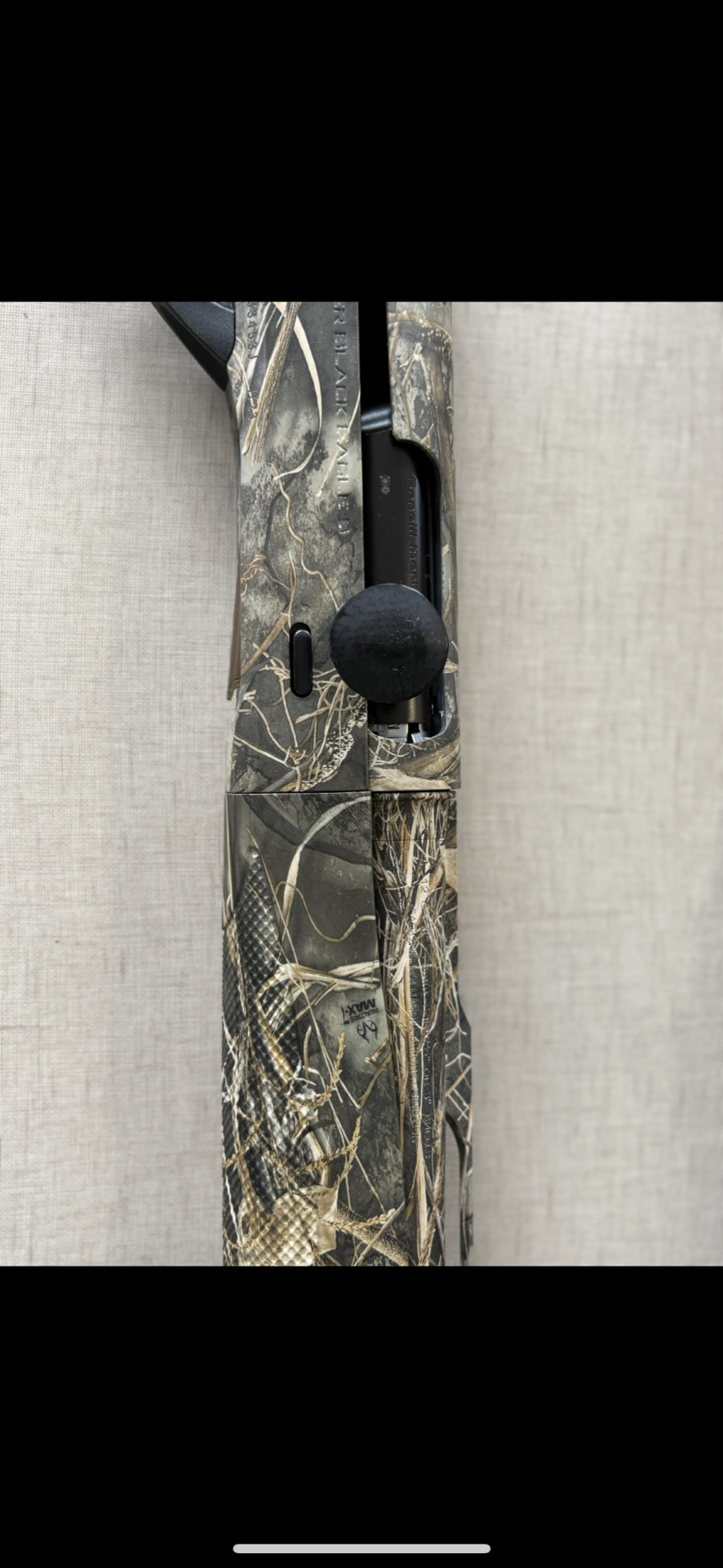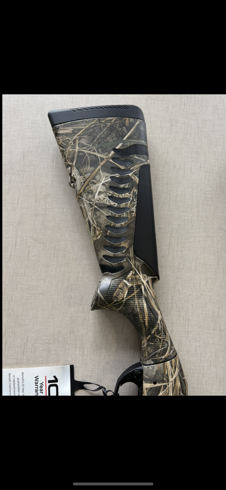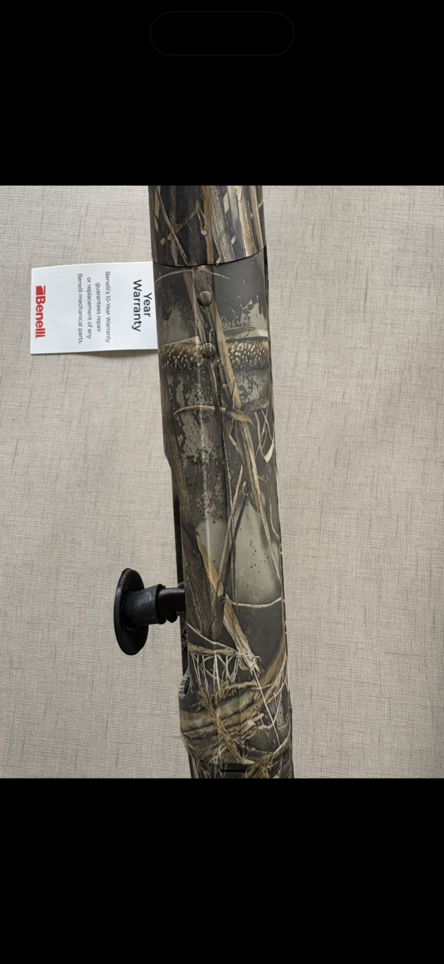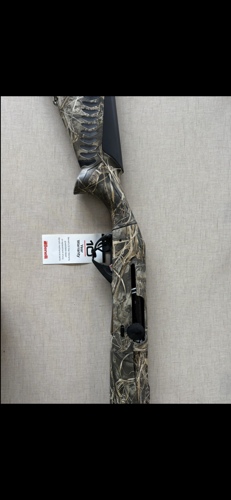 Espingarda de caça camuflada com etiqueta Benelli e garantia 10 anos