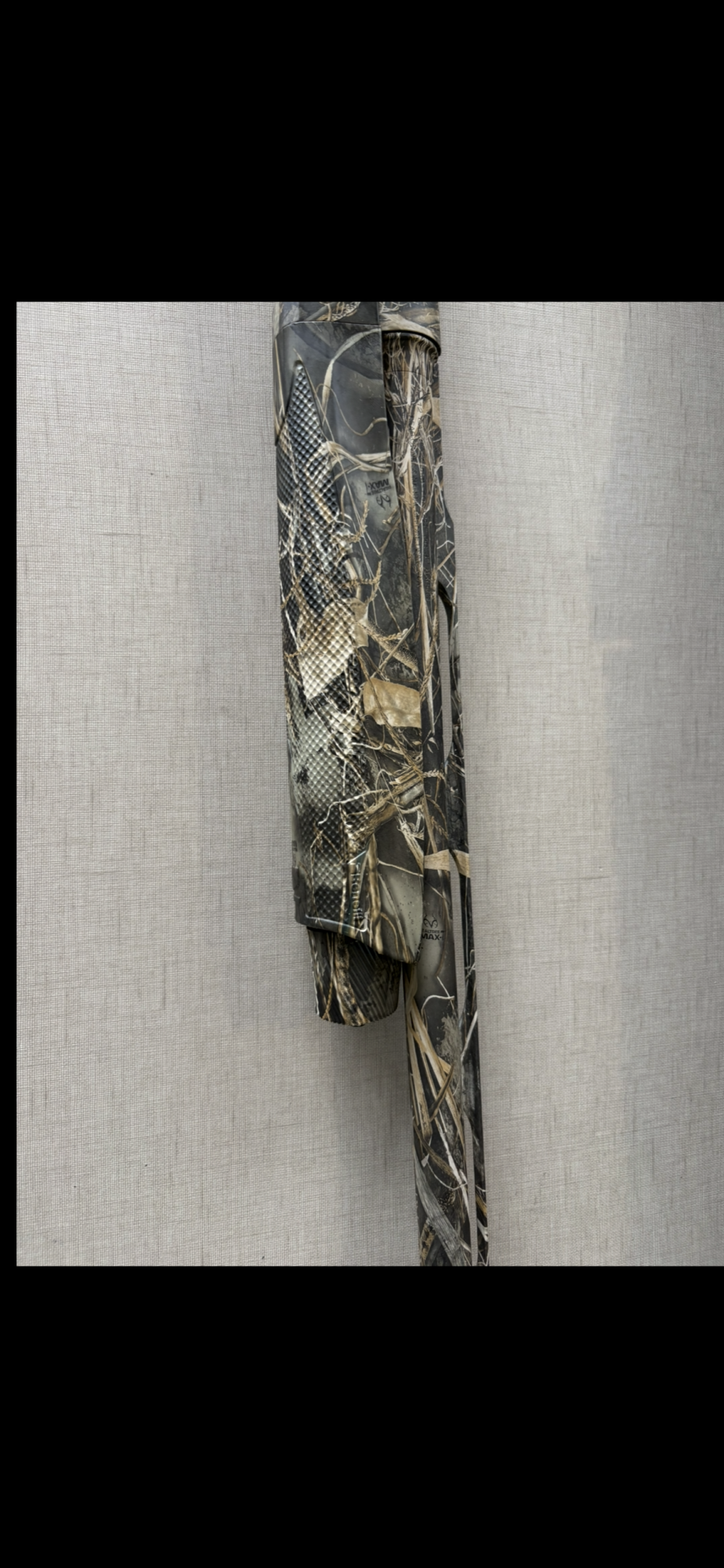 Detalhe de arma com padrão camuflado e texto MAX4