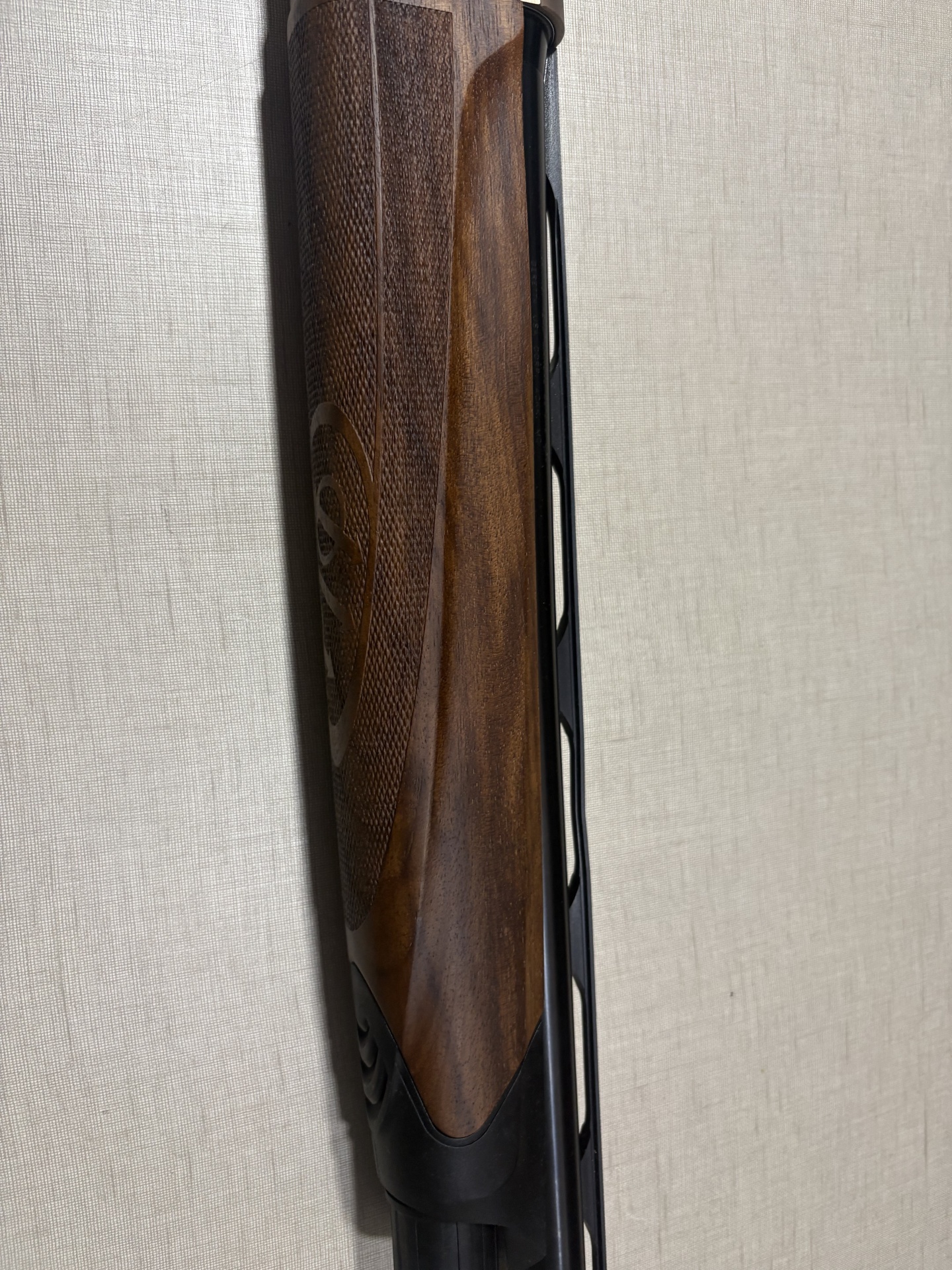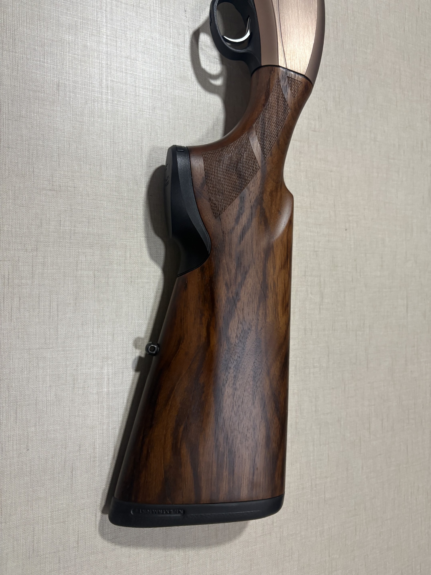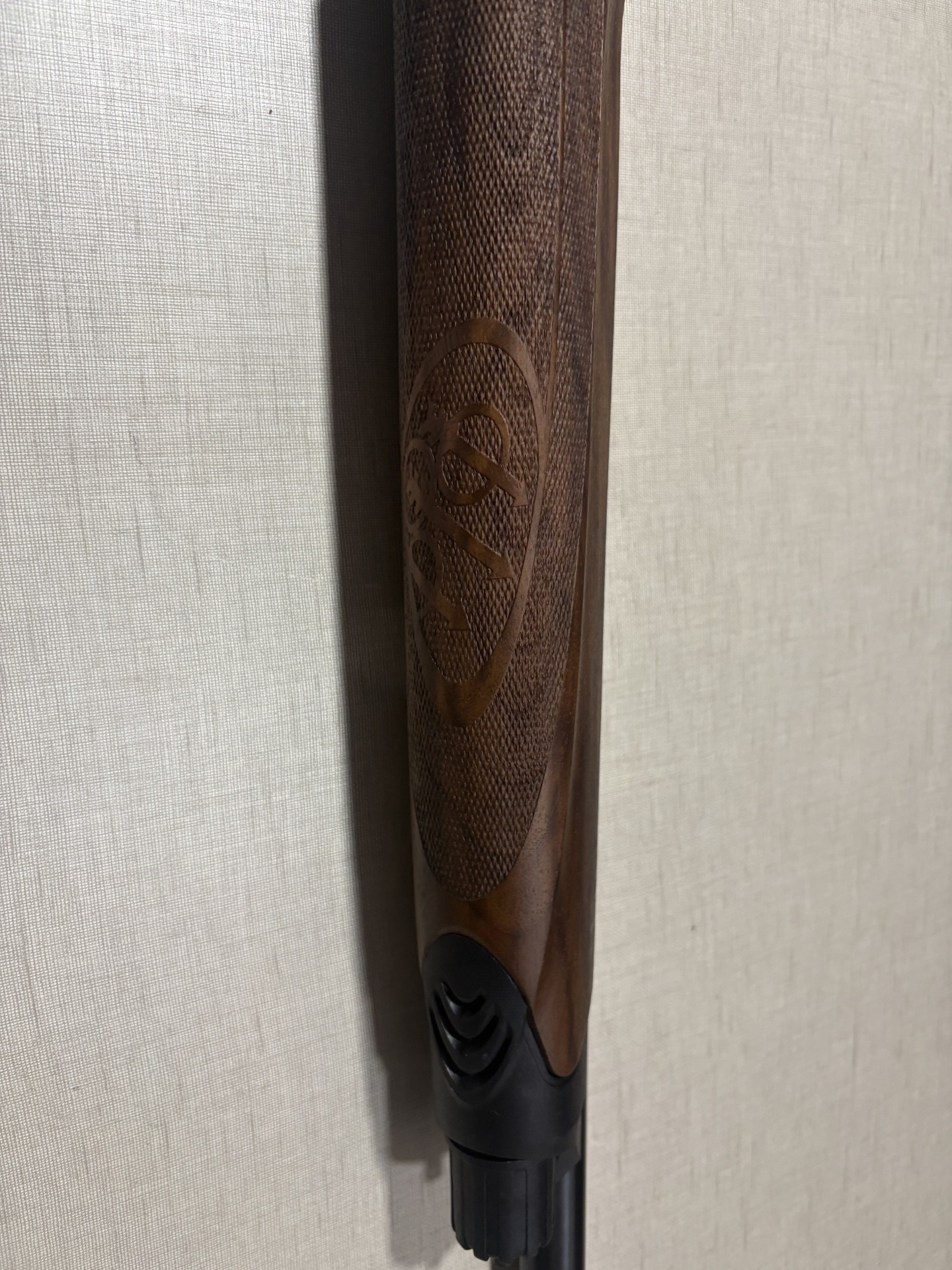 Coronha de espingarda em madeira castanha com punho xadrezado e apoio de borracha