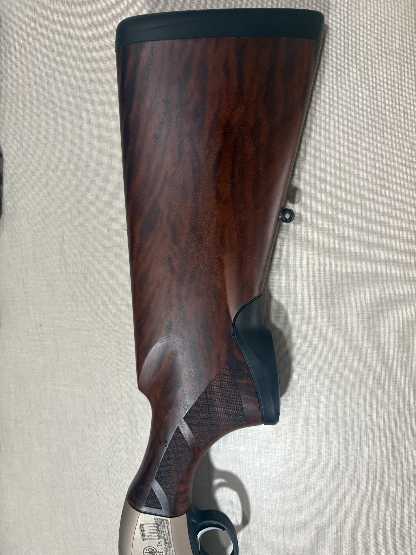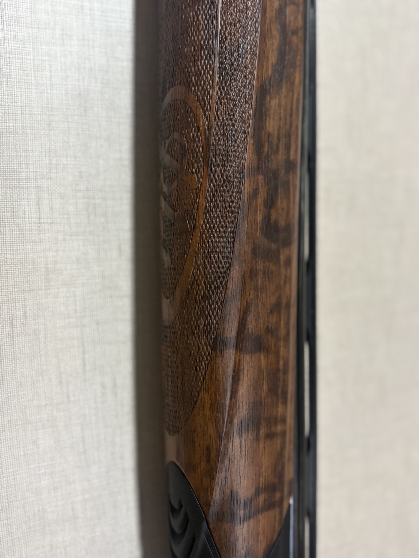 Coronha de arma de fogo em madeira castanha com detalhes pretos e gravação metálica Beretta