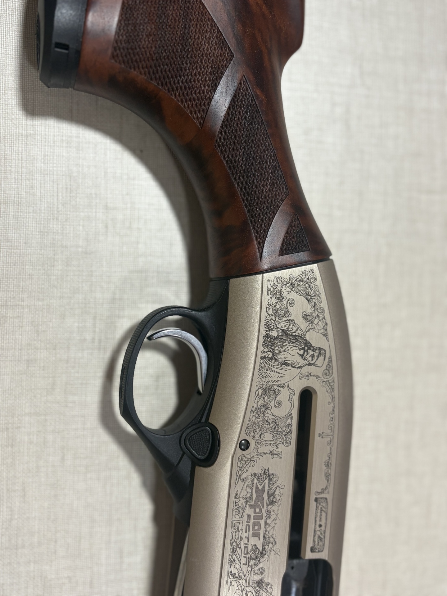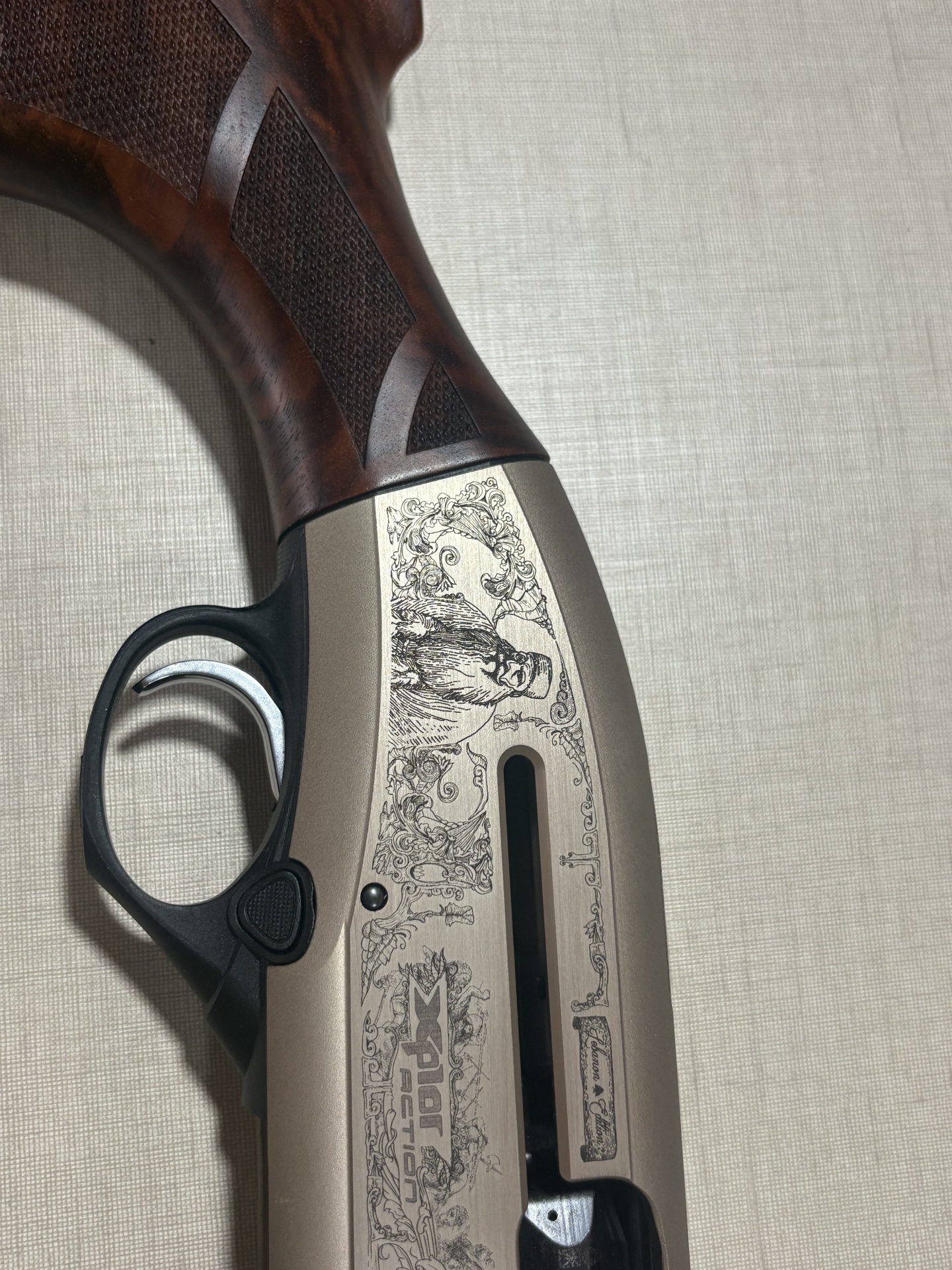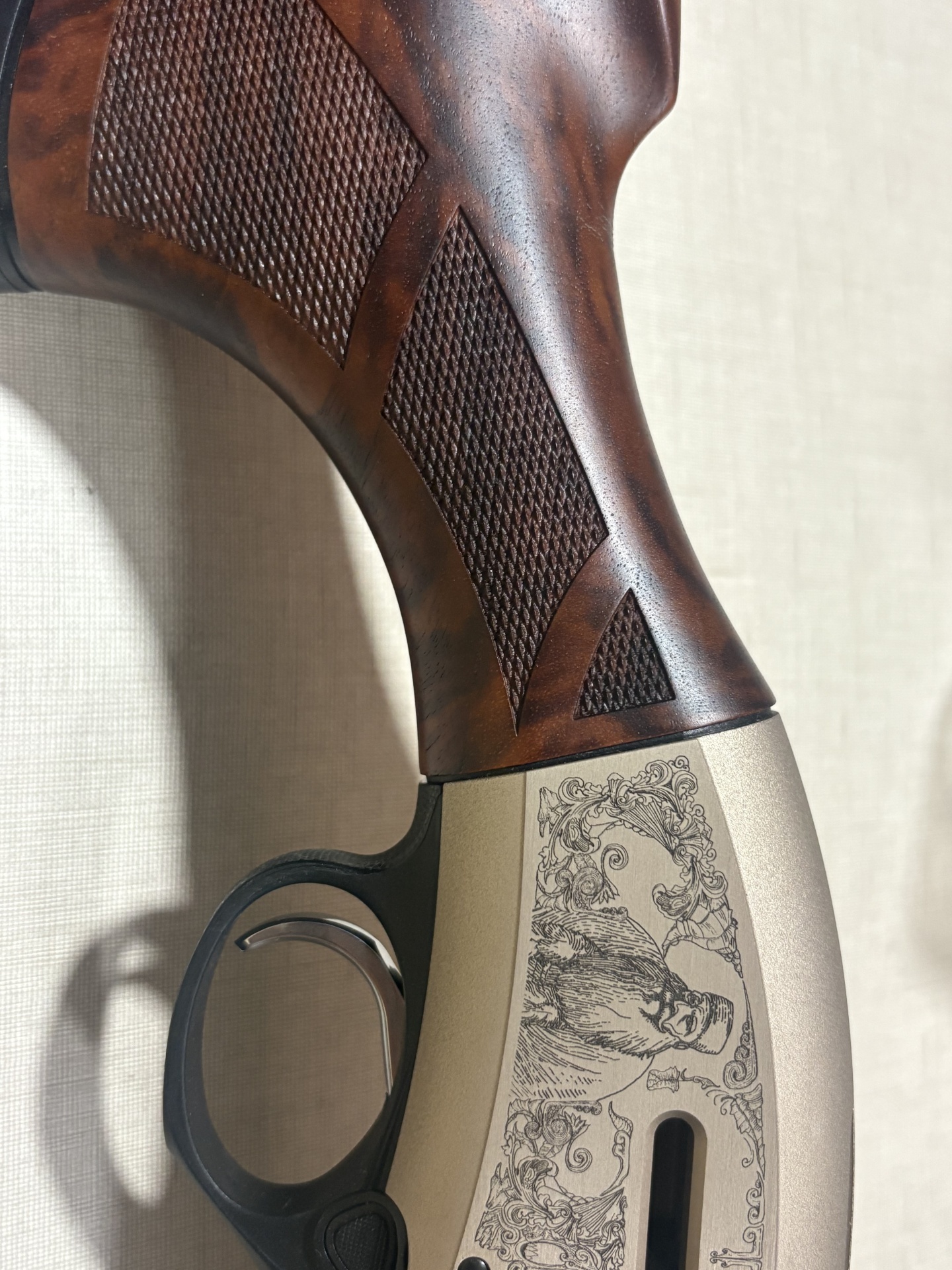 Arma de fogo com empunhadura em madeira castanha, corpo metálico beige com gravações detalhadas e gatilho metálico
