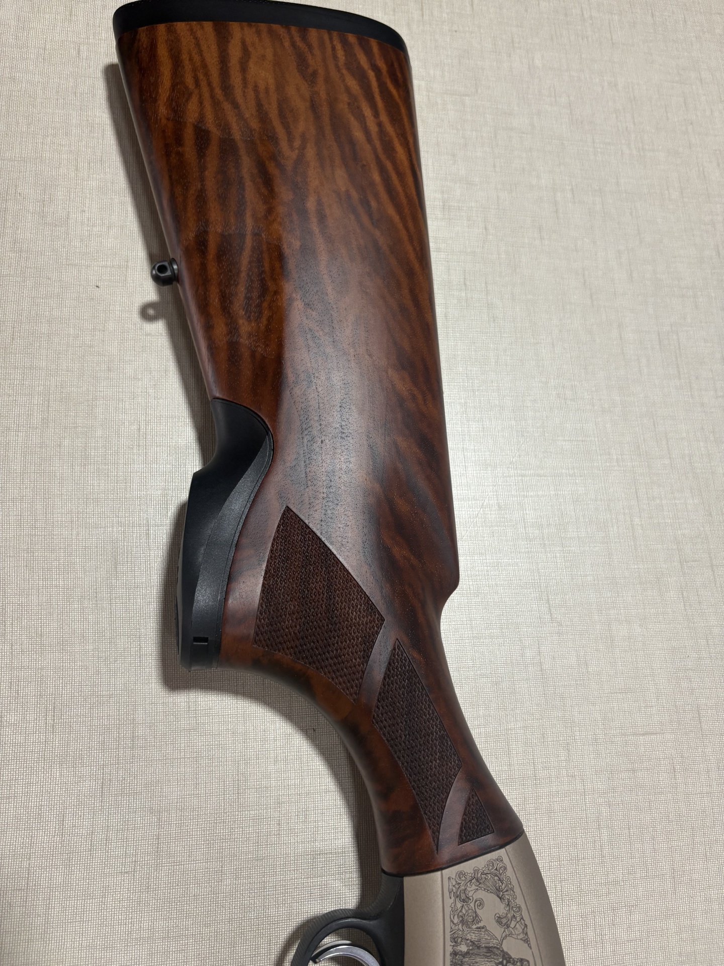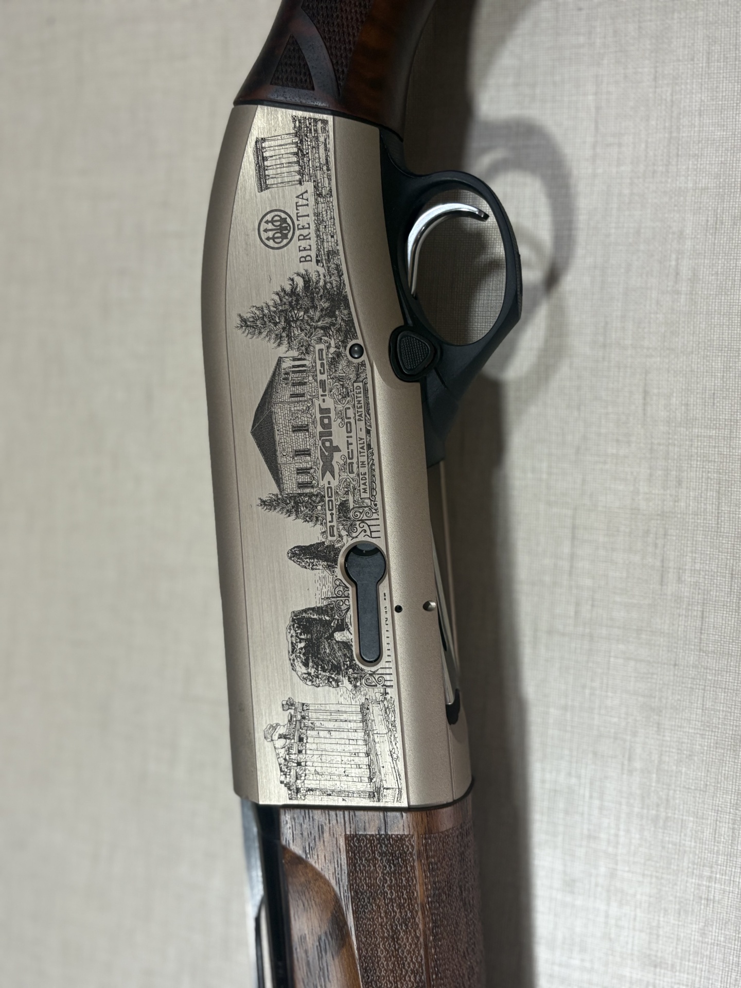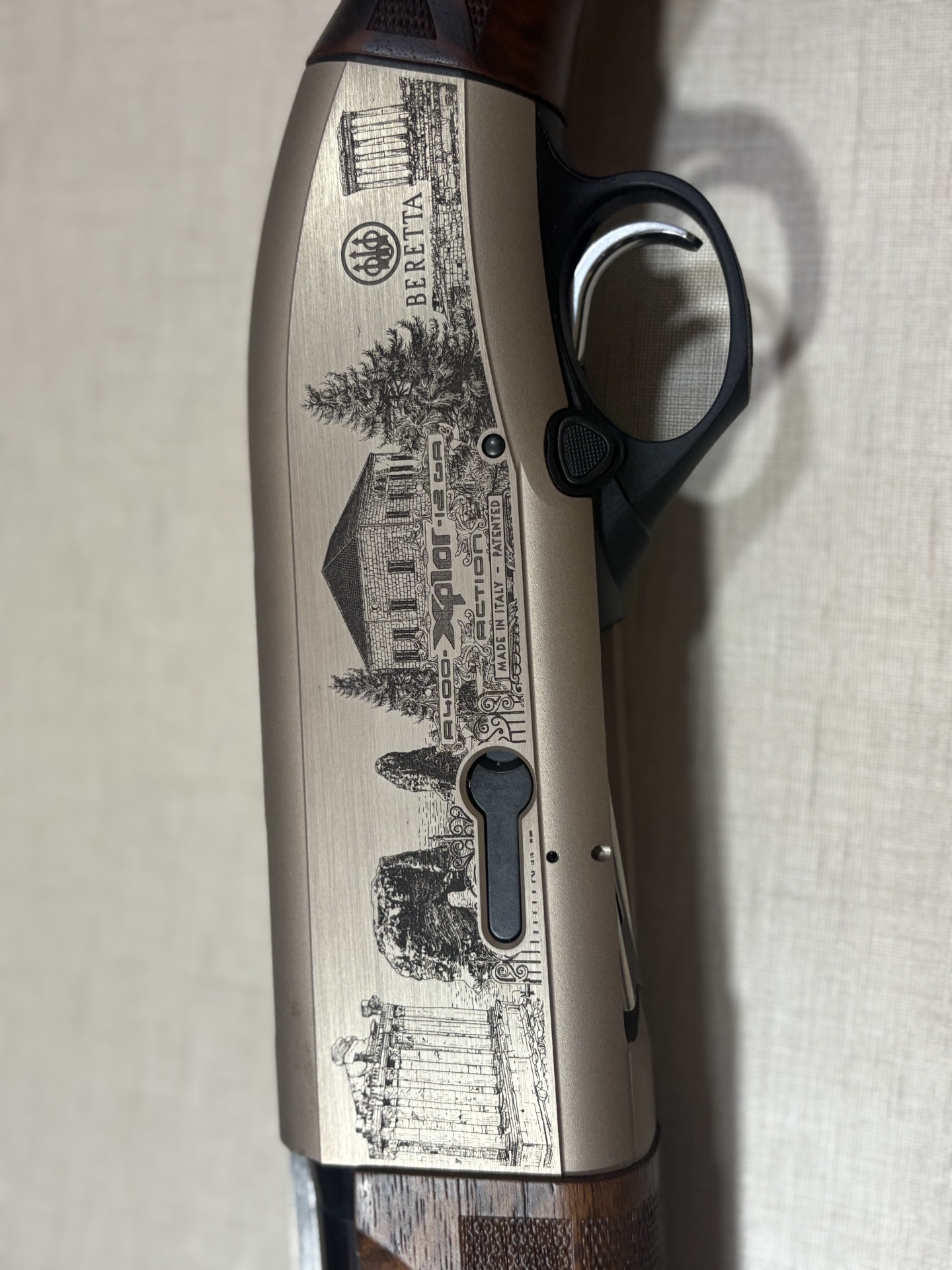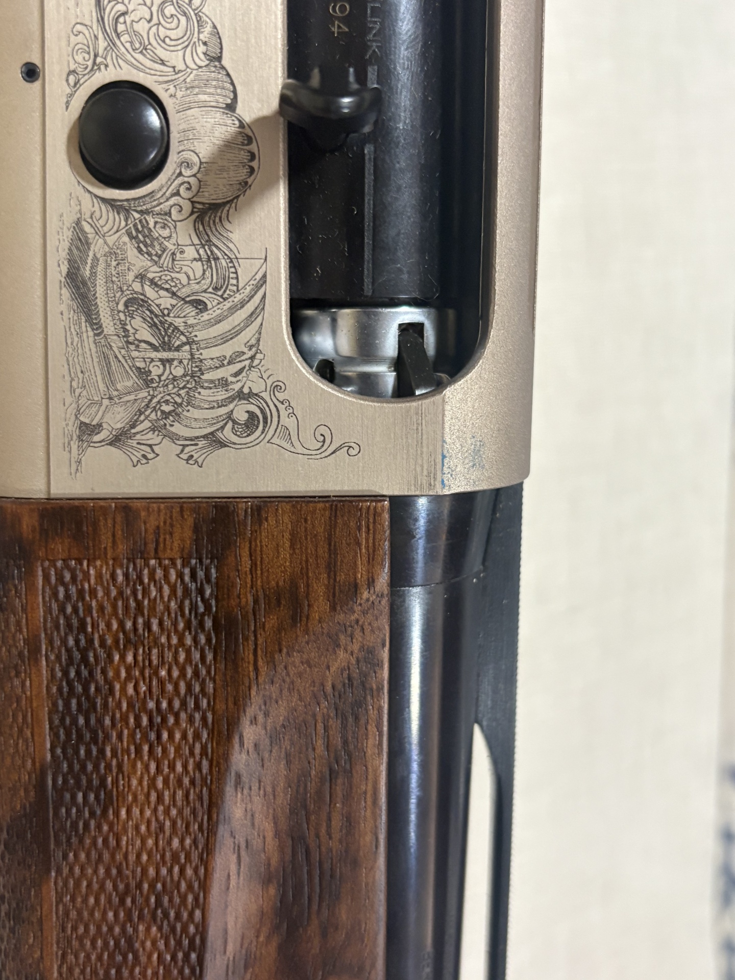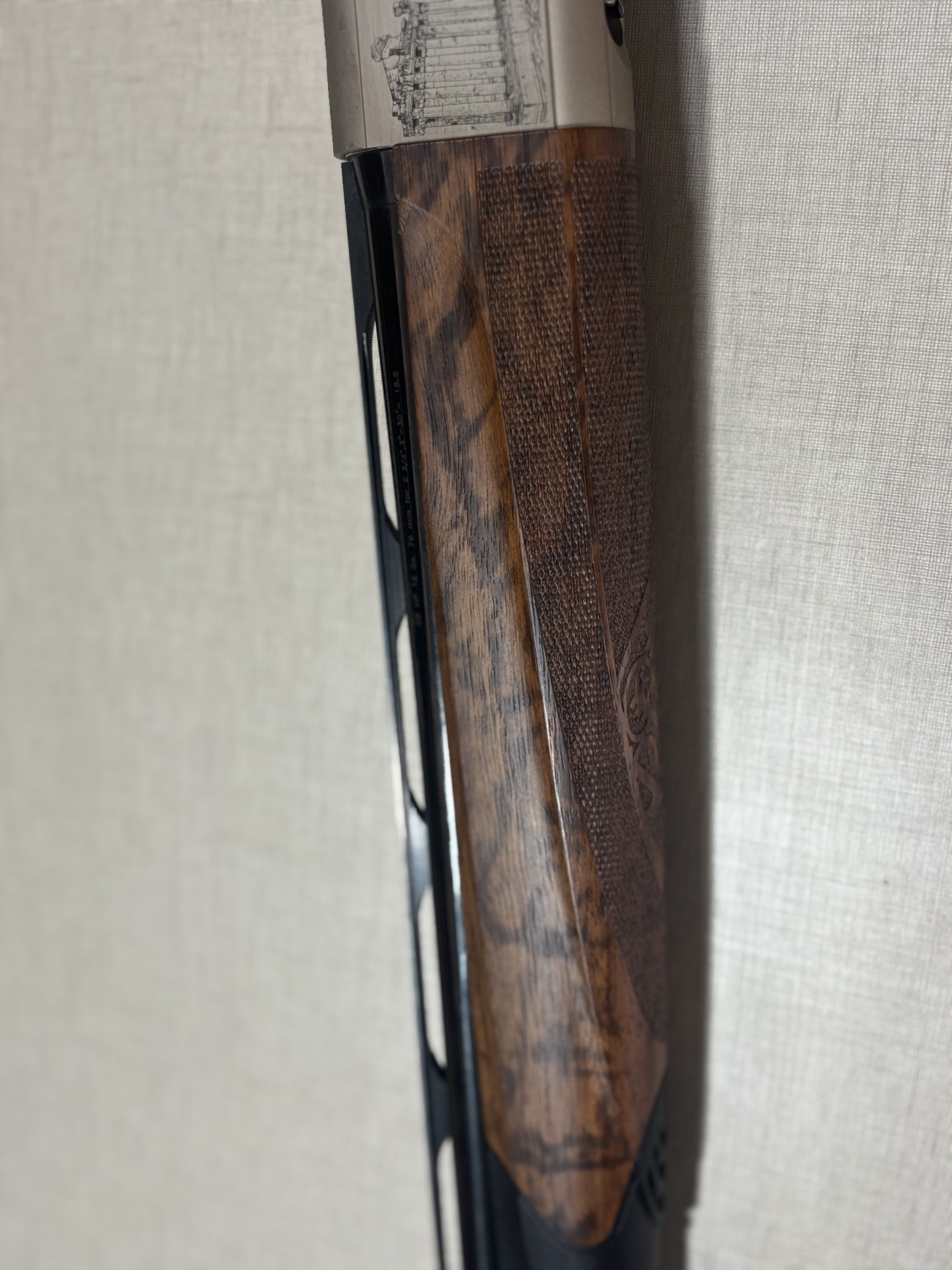 Espingarda Beretta com gravações detalhadas em metal e madeira