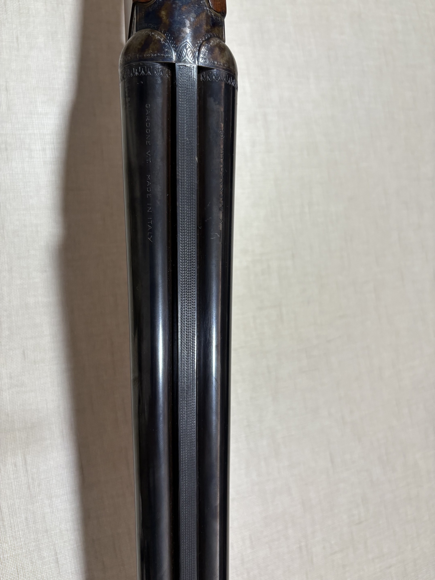 Canos de espingarda dupla de metal com gravuras e inscrições
