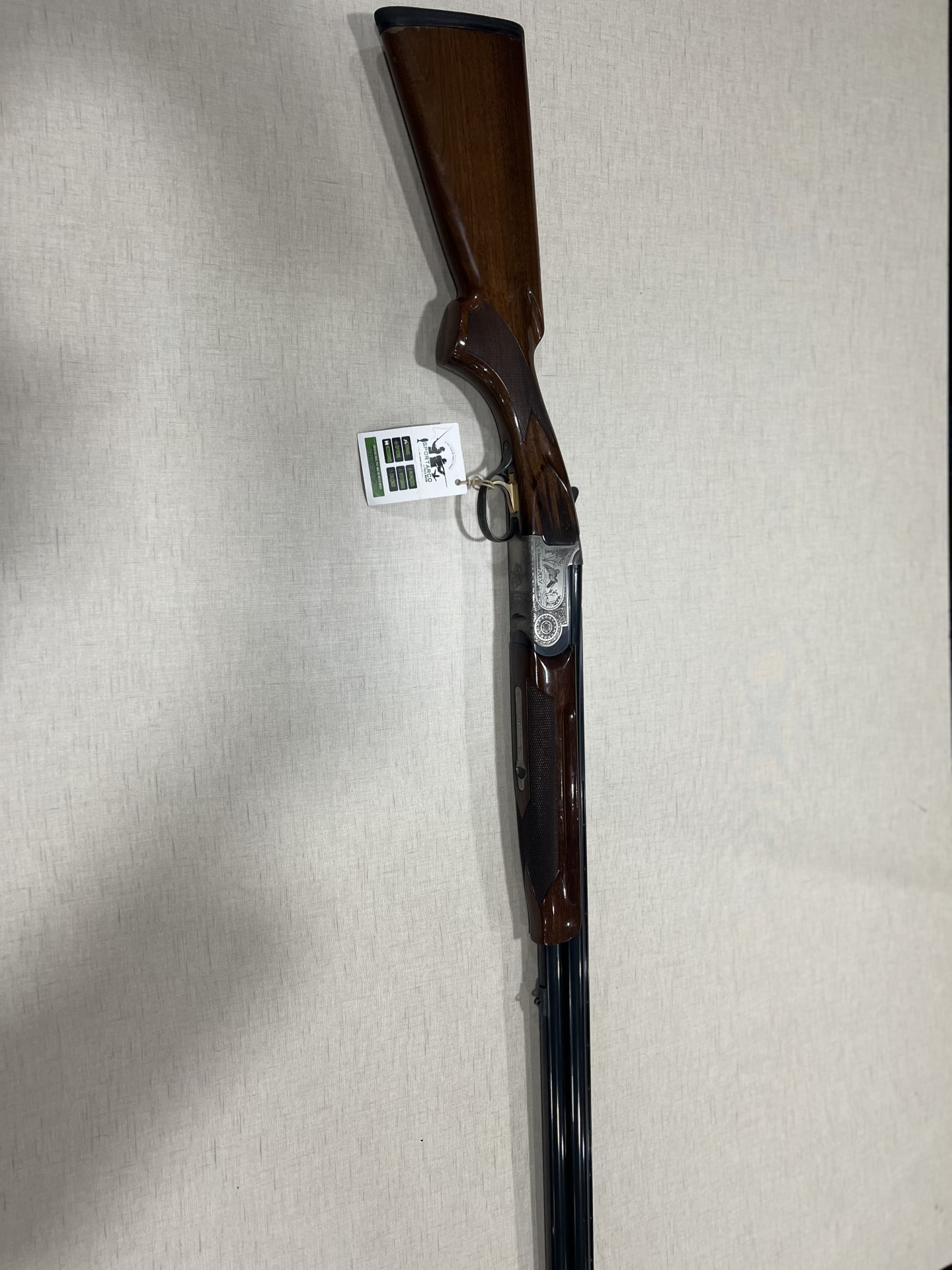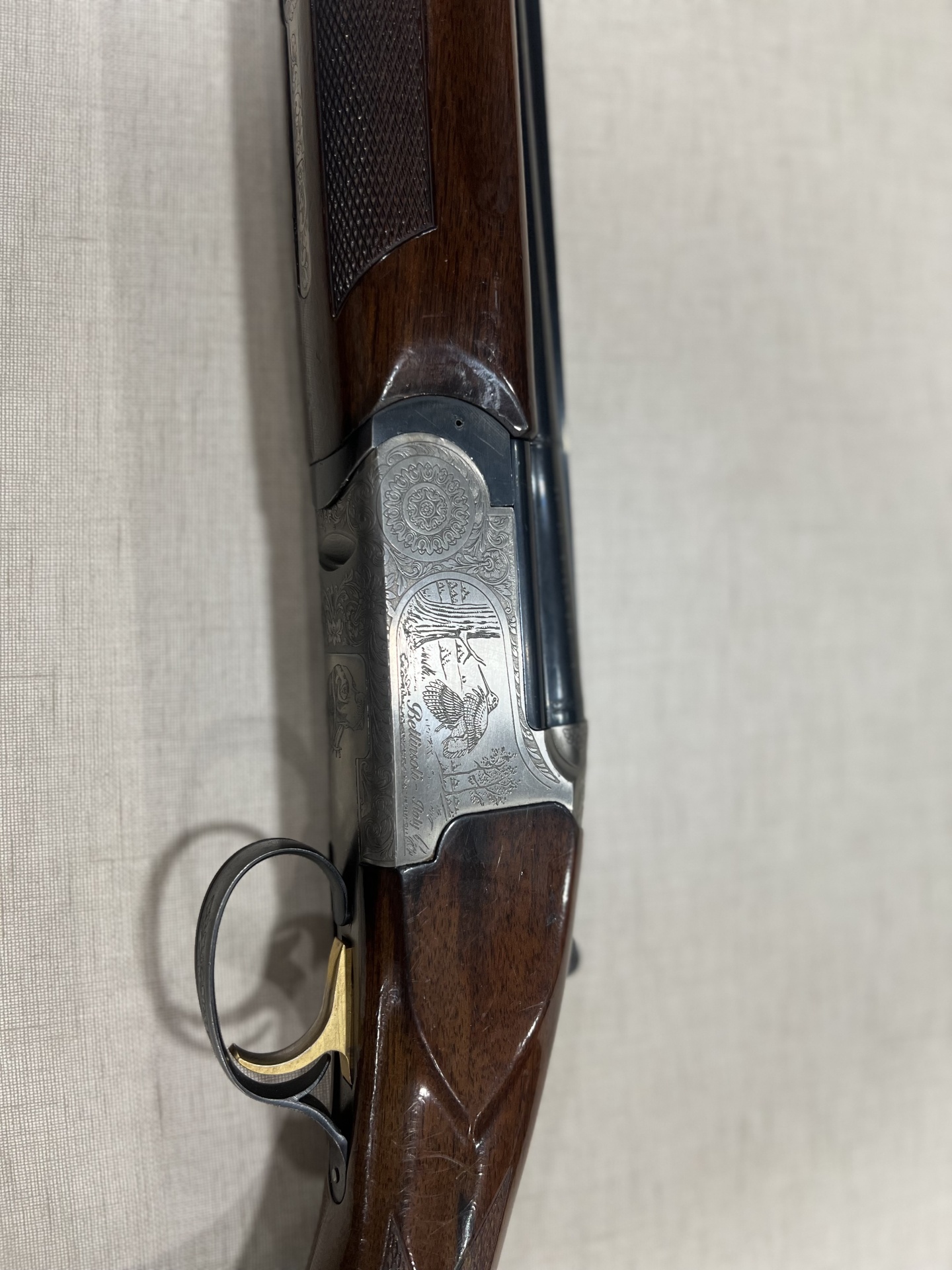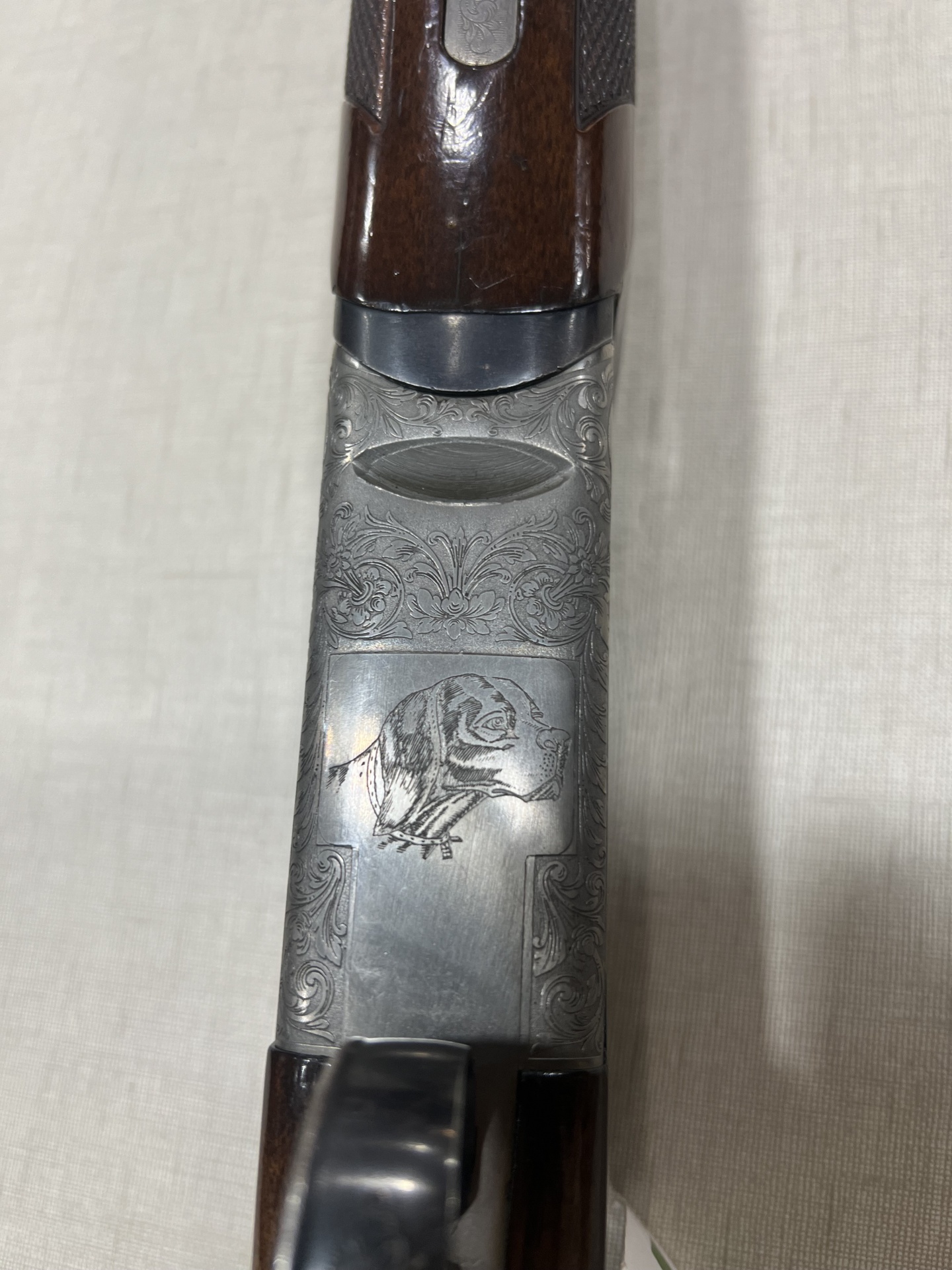 Espingarda de canos emparelhados com acabamento em madeira e metal gravado