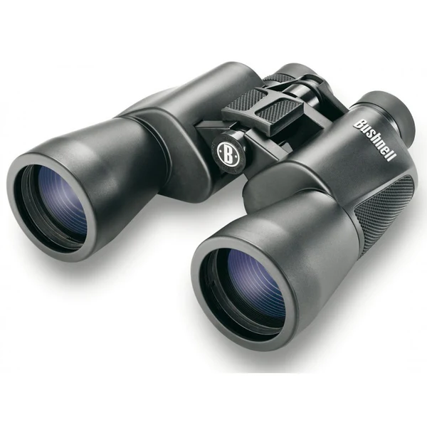 Binóculos pretos com lentes azuis e texto Bushnell