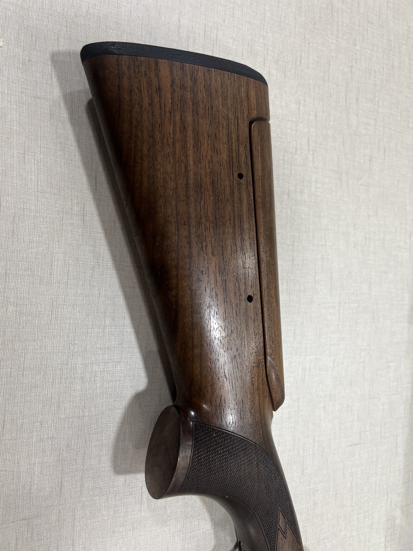 Cabo de espingarda em madeira castanha com punho texturizado e parte superior preta