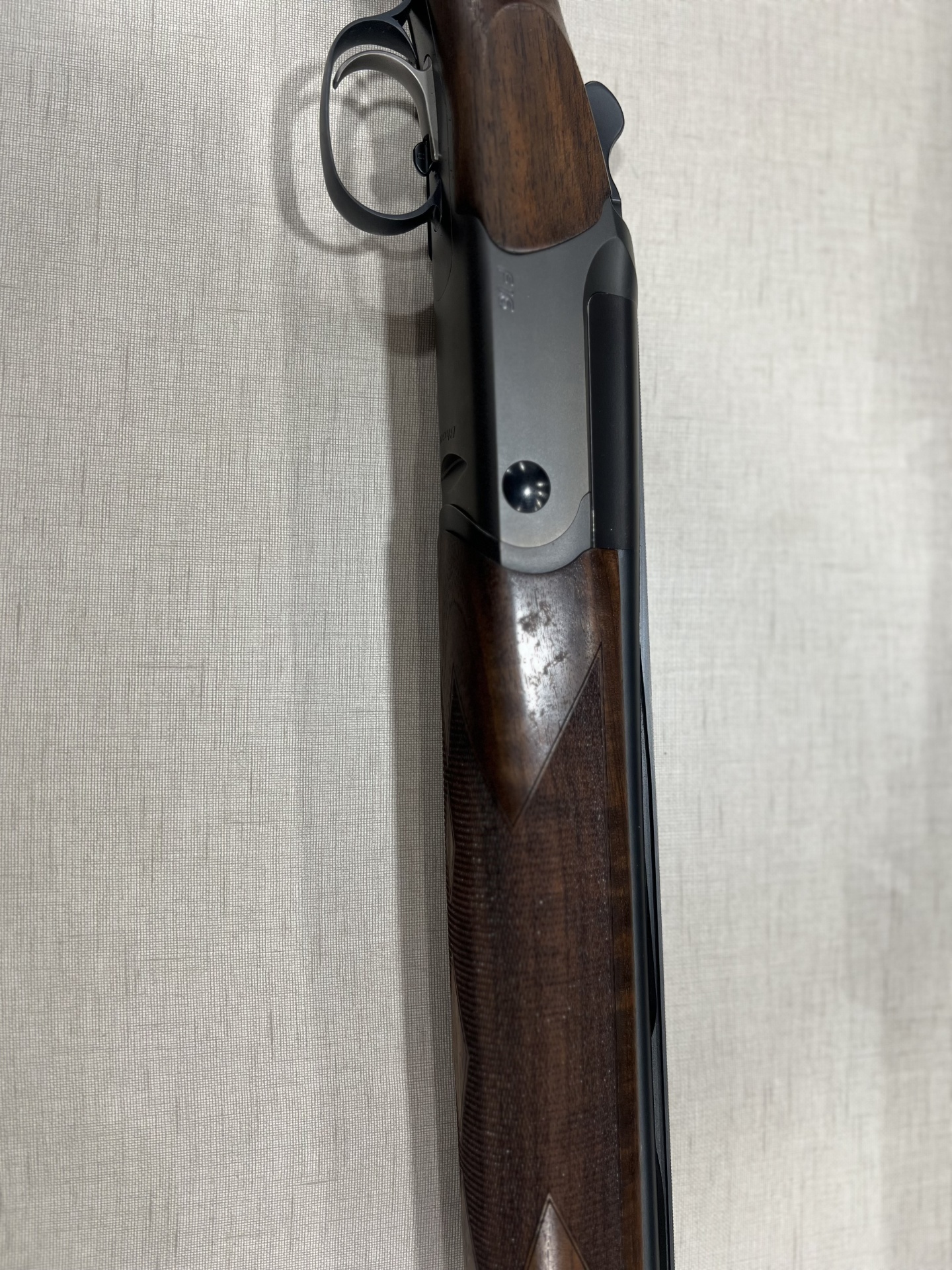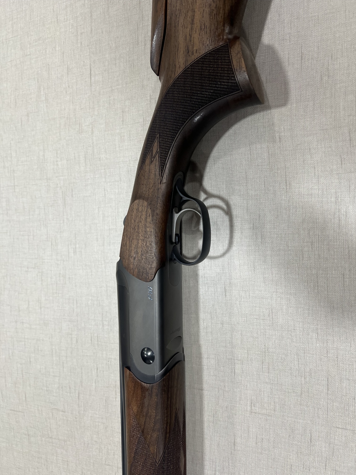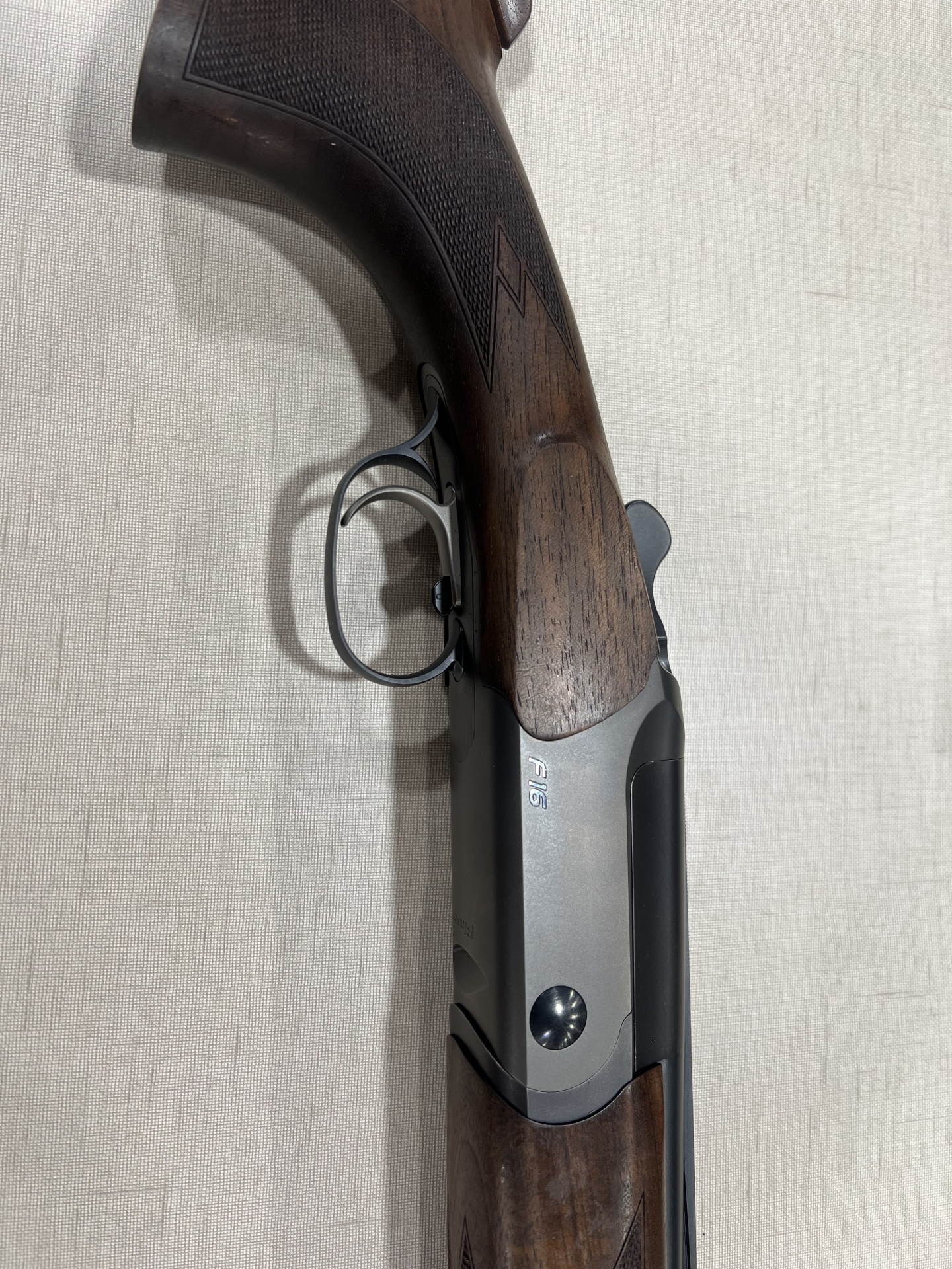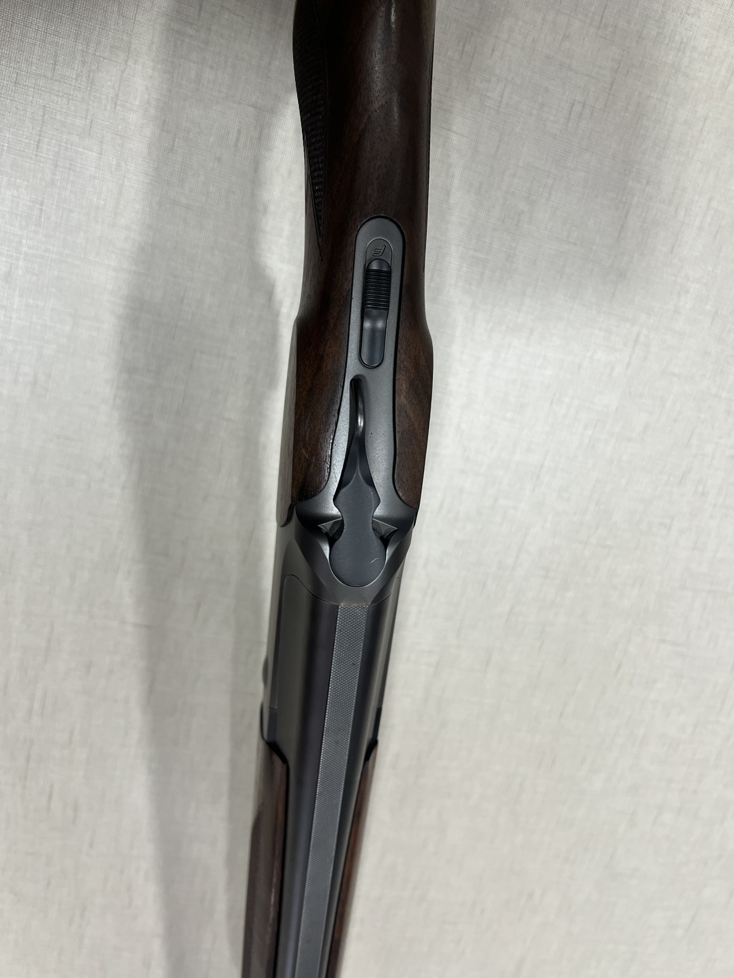 Espingarda de caça com coronha e punho em madeira escura e armação metálica cinza