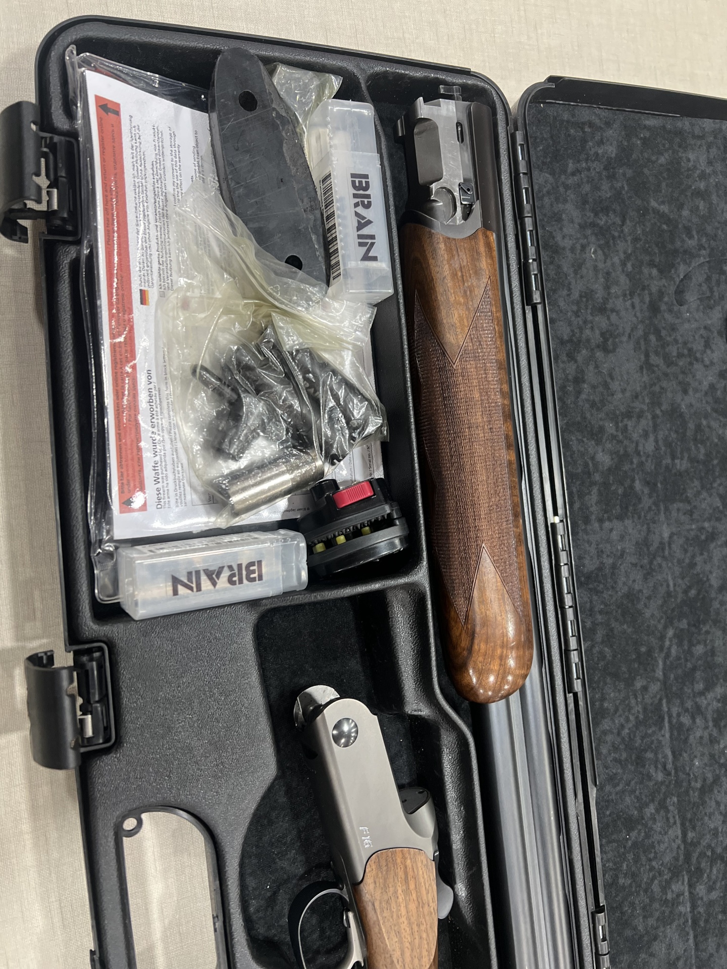 Estojo aberto com peças de espingarda e acessórios organizados no interior moldado