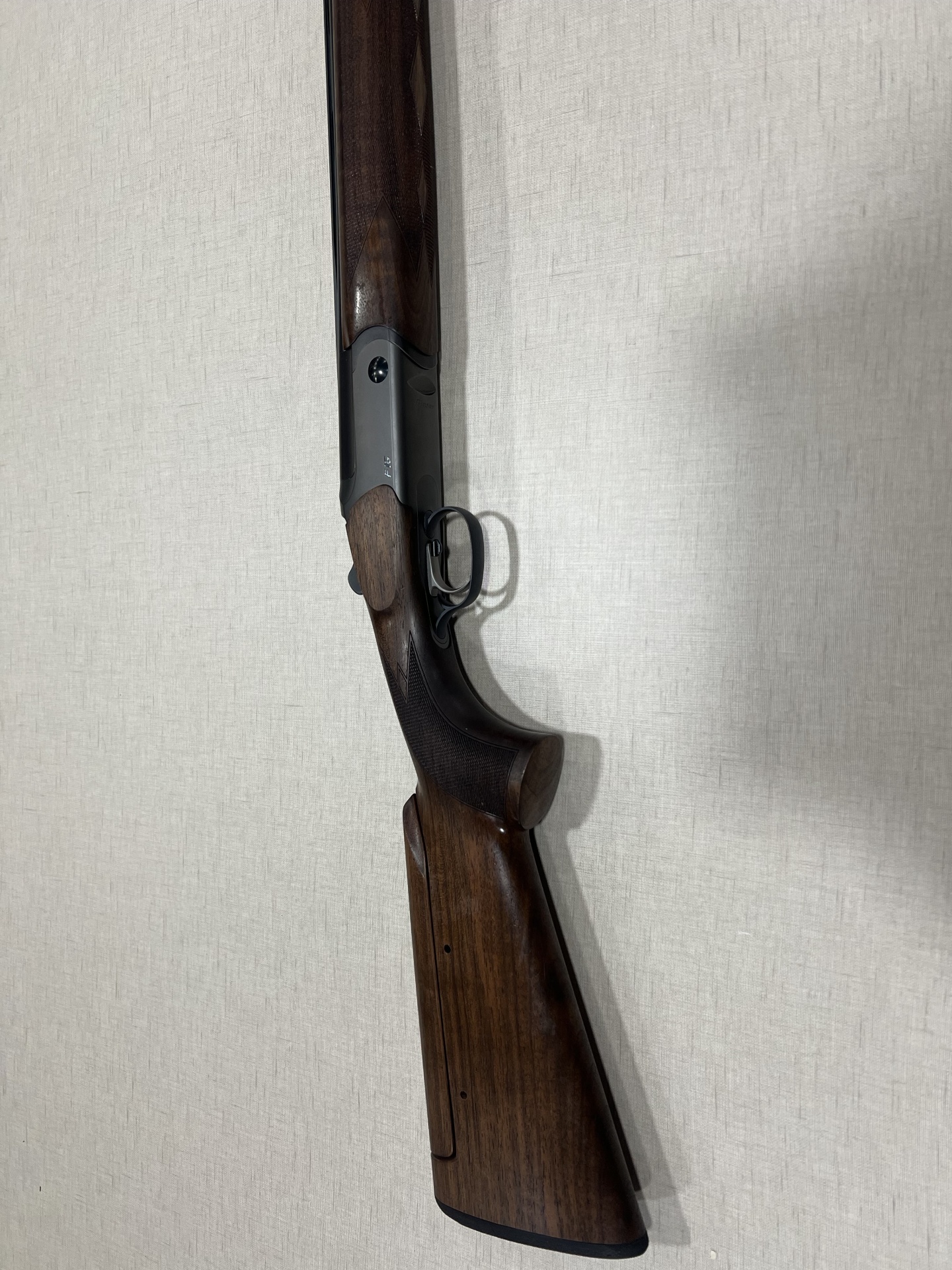 Espingarda com coronha de madeira escura e acabamento polido encostada em parede branca