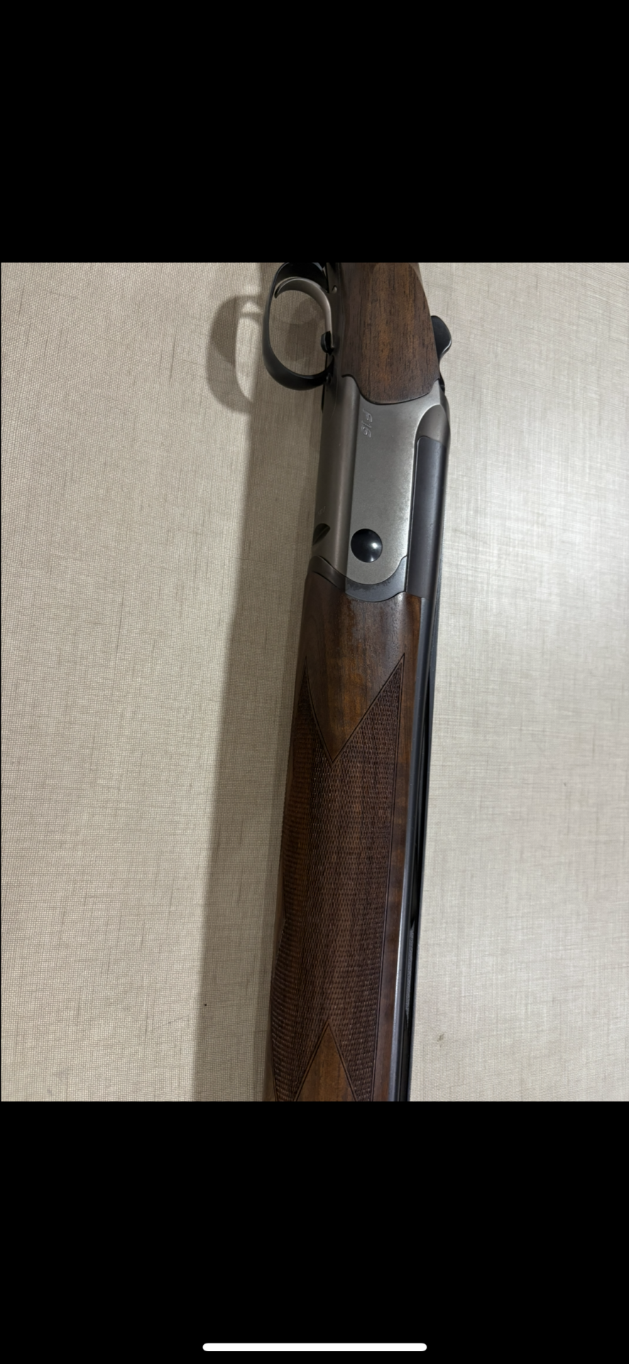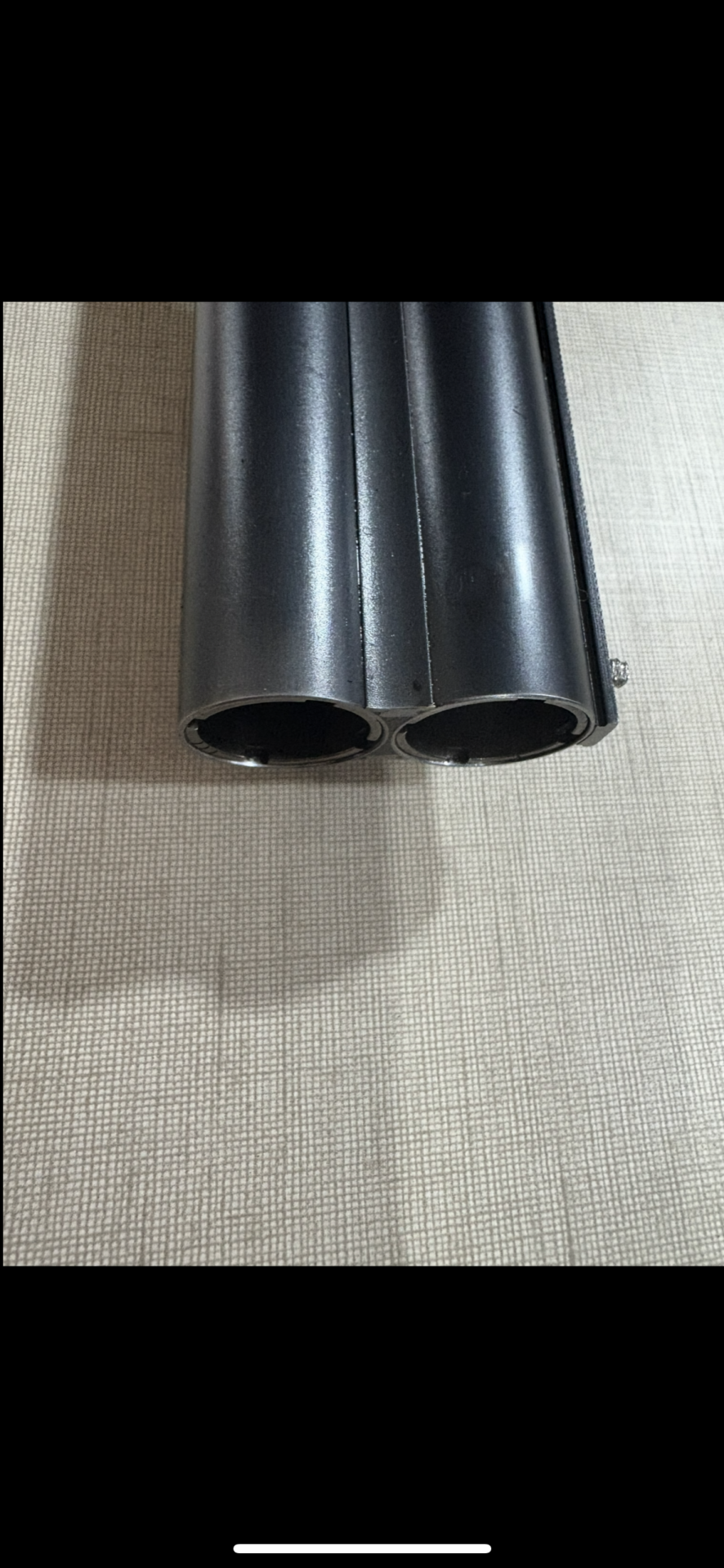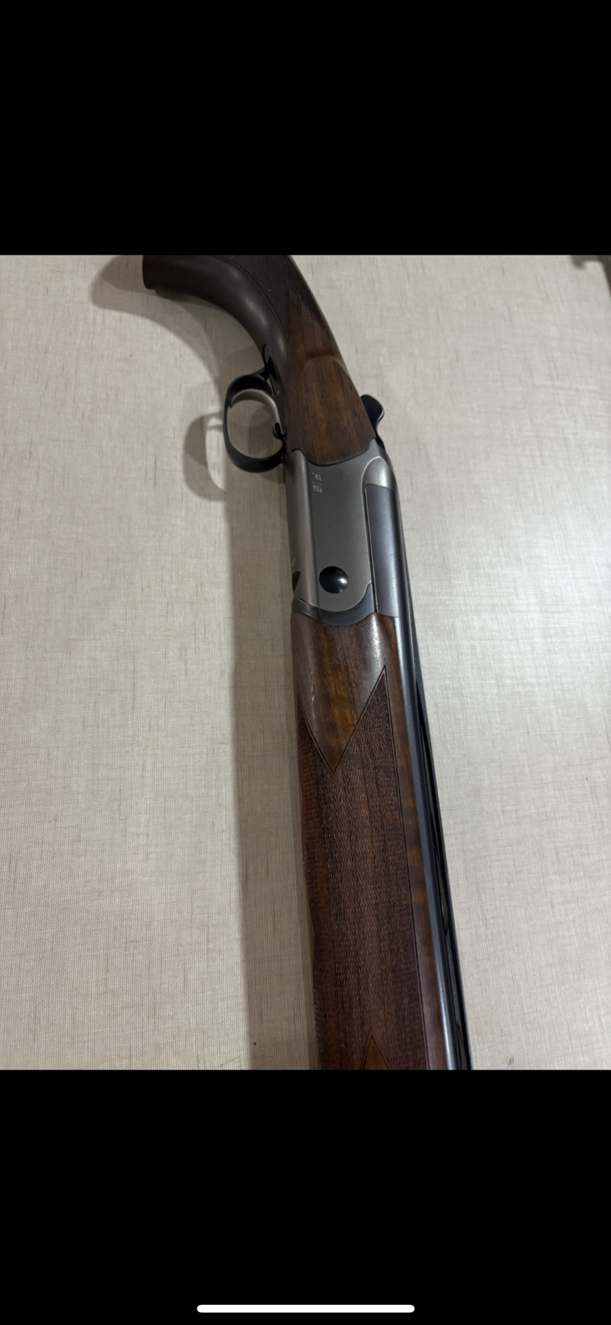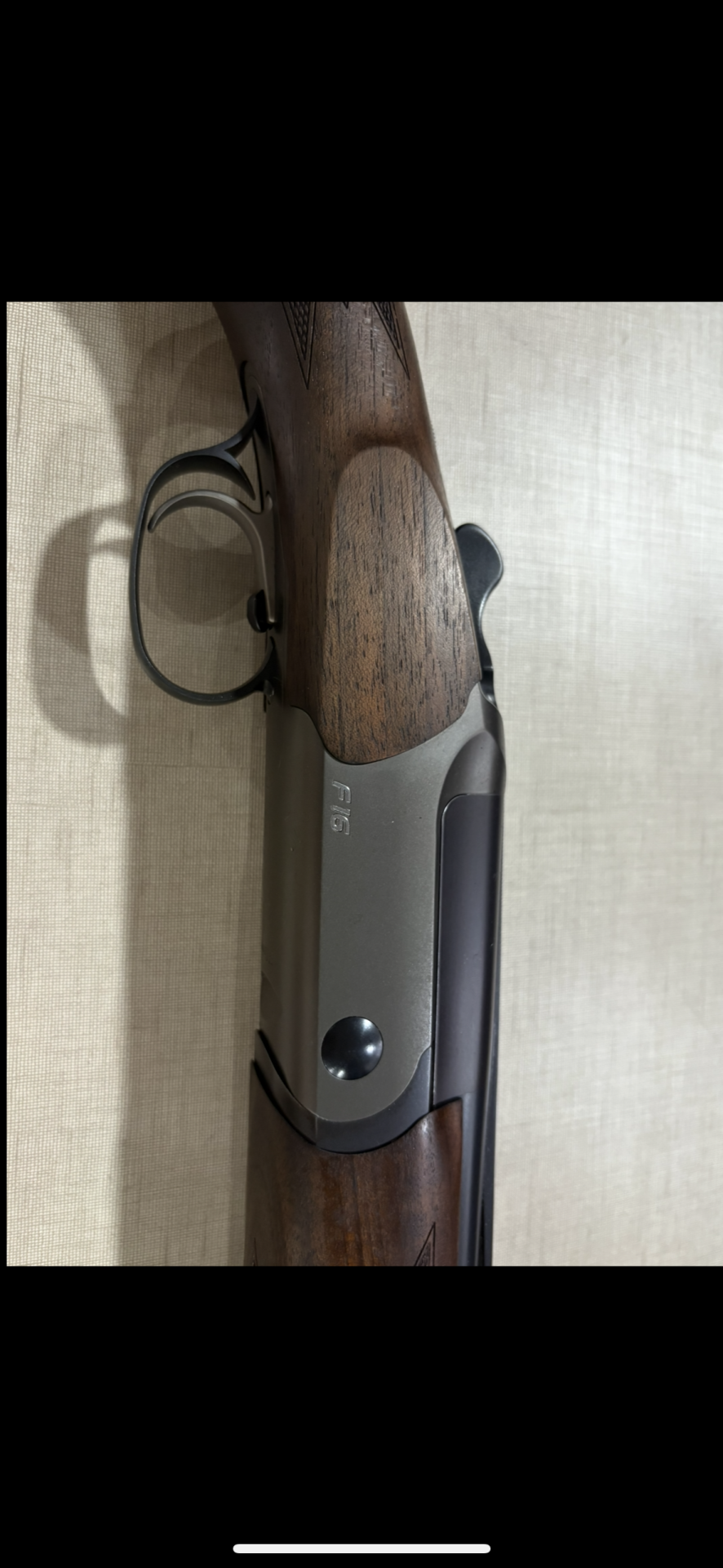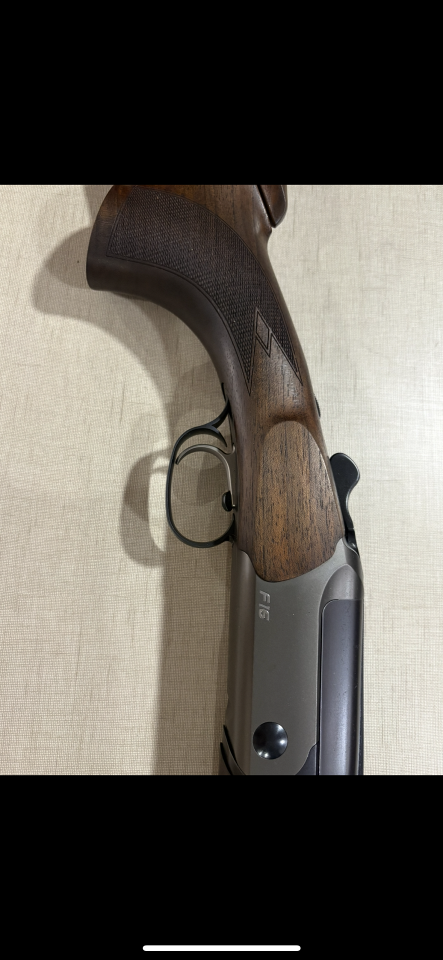 Rifle de cano duplo com coronha de madeira castanha escura e marcação F16.