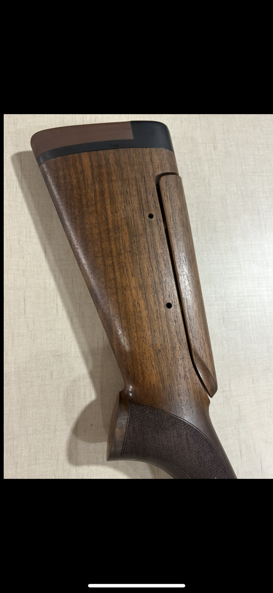 Coronha de madeira castanho-escura para espingarda com acabamento polido e detalhes emborrachados.