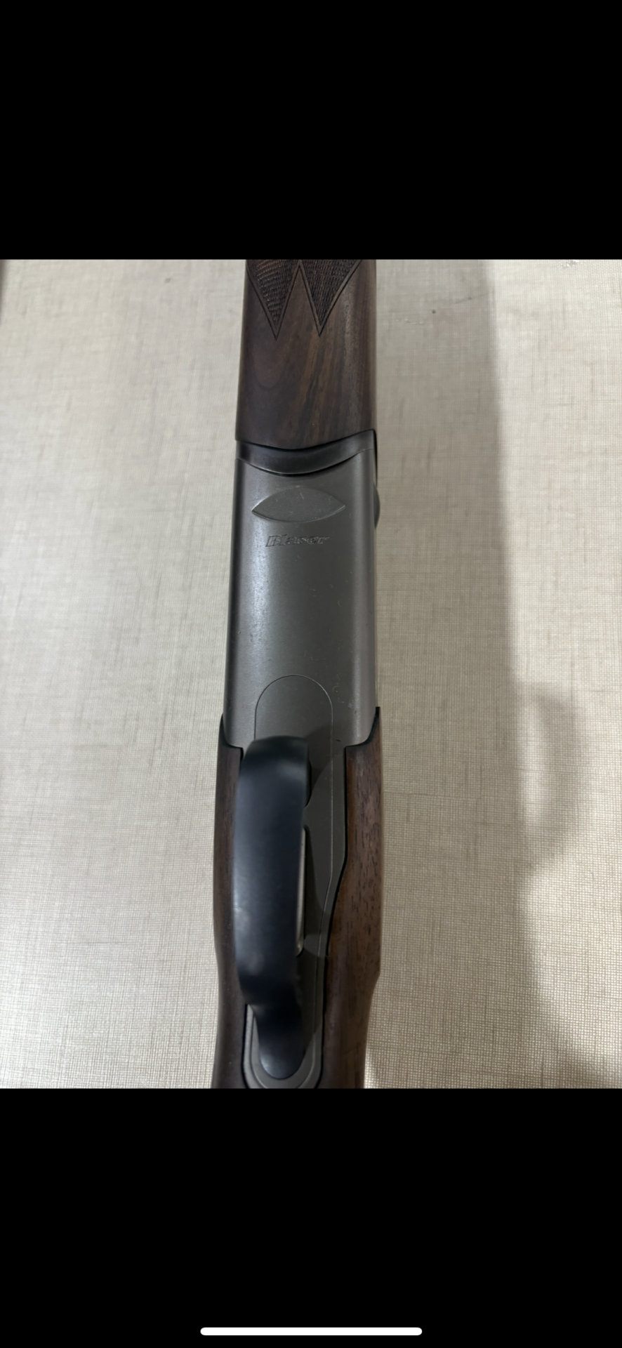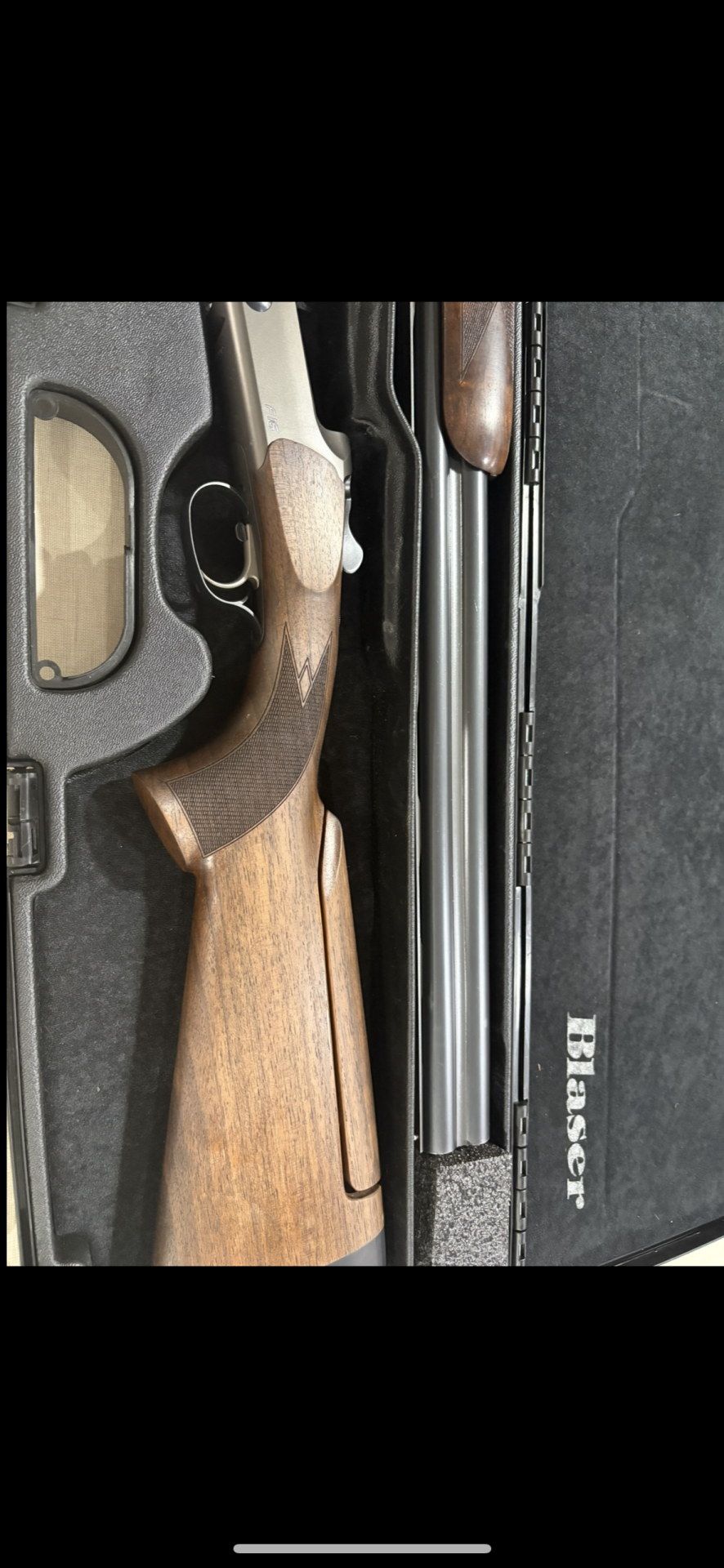 Espingarda com coronha em madeira e metal cinza com gravação Blaser