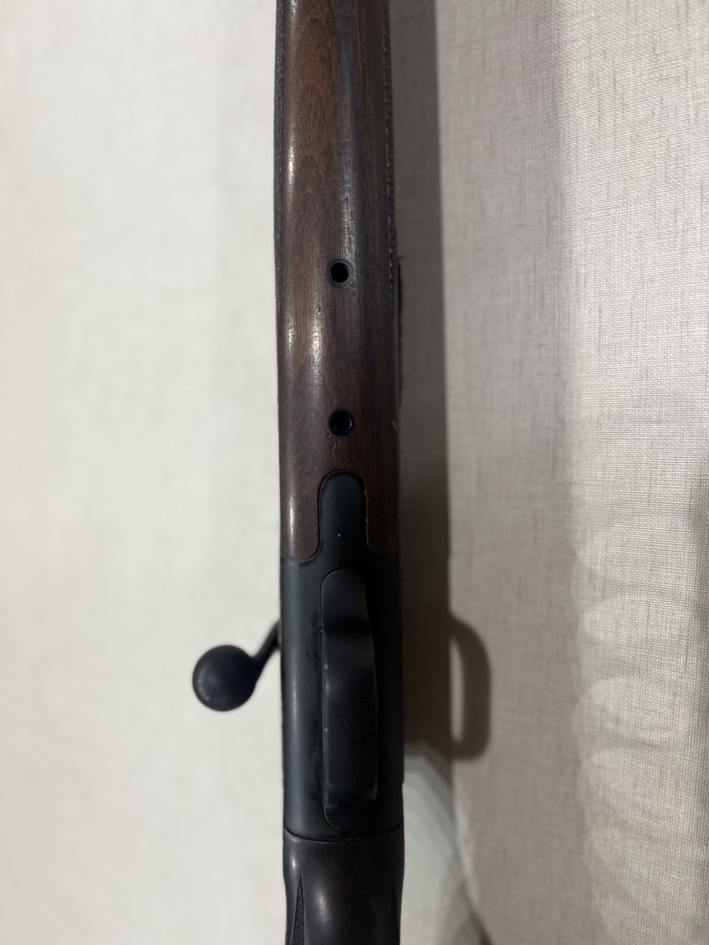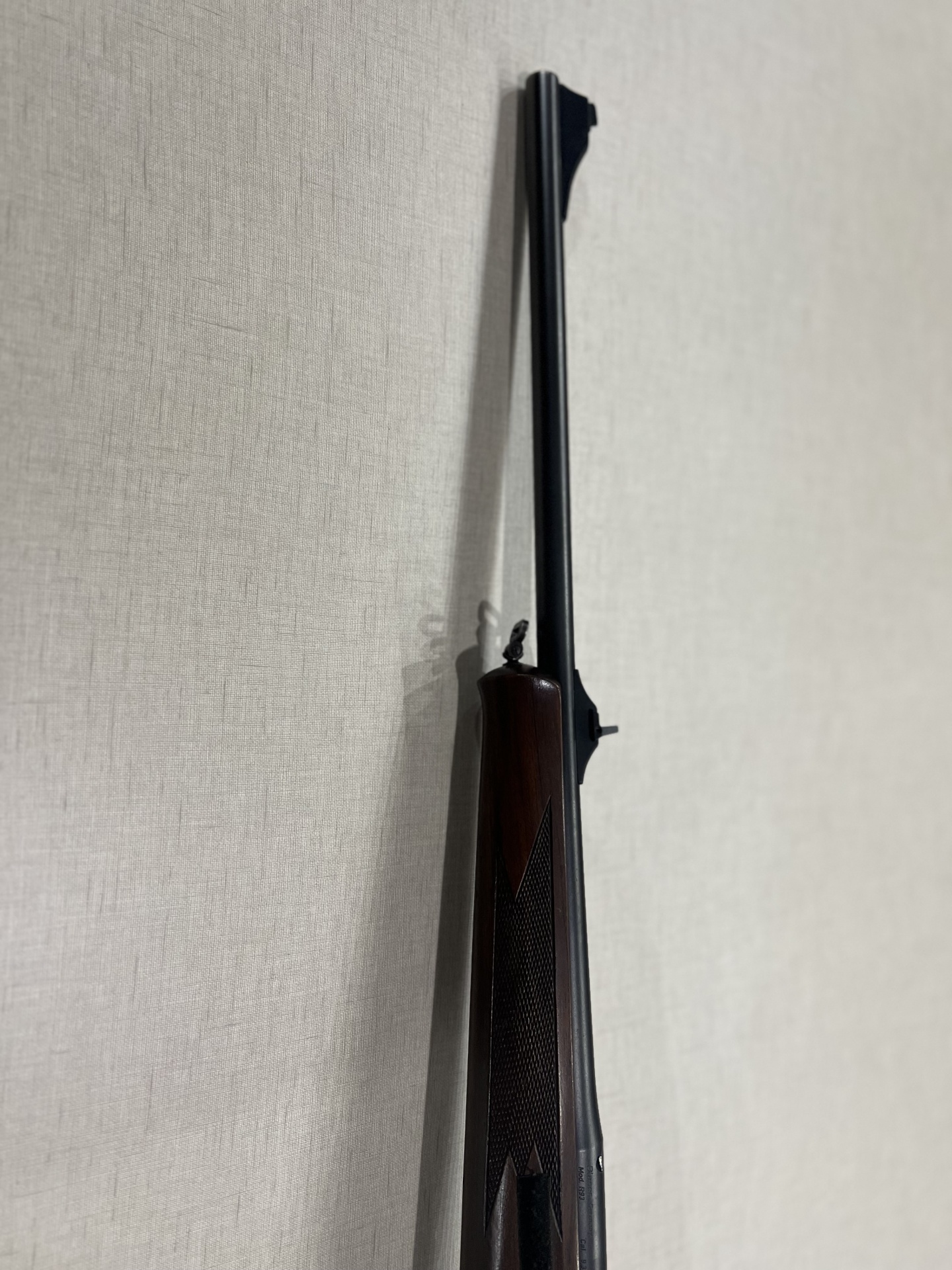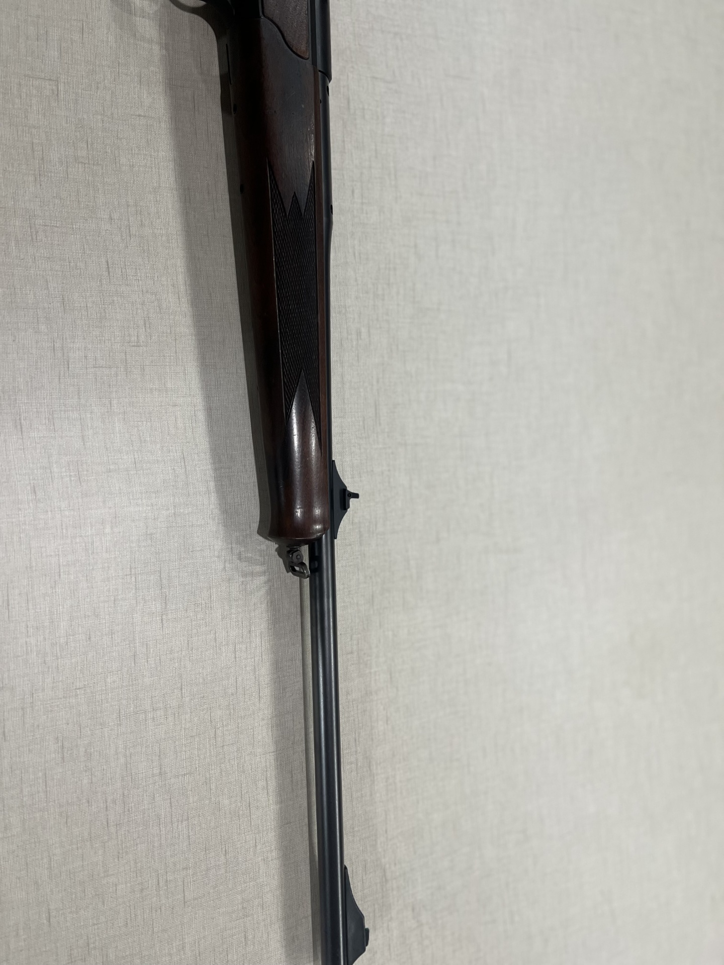Rifle com coronha em madeira escura e cano metálico preto sobre fundo claro