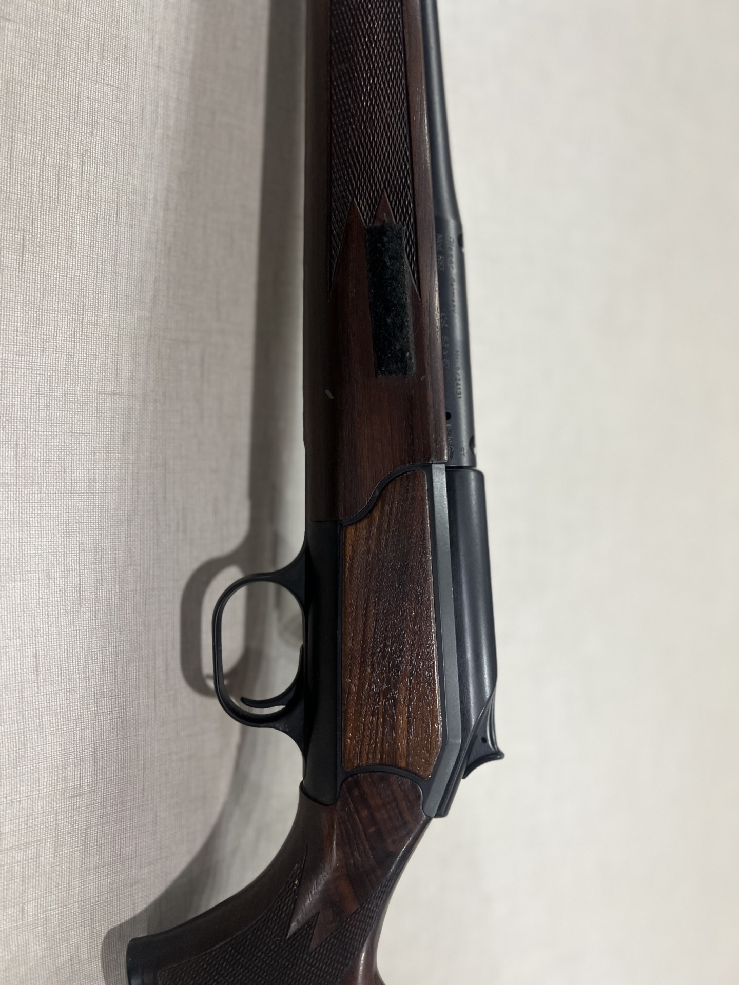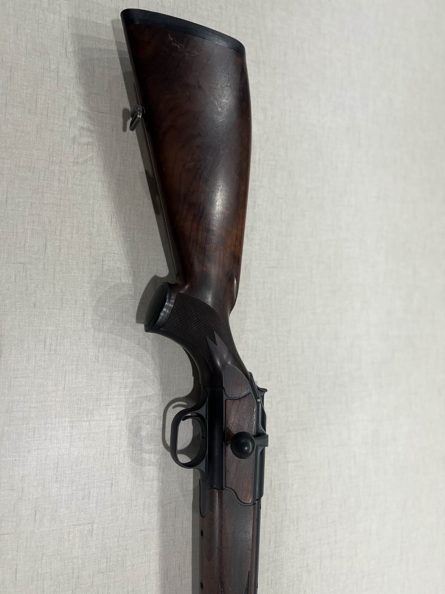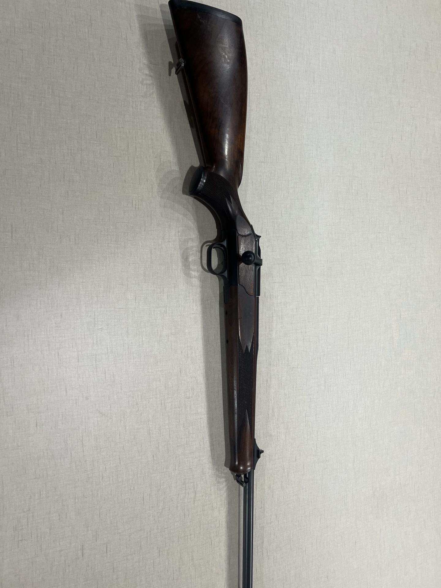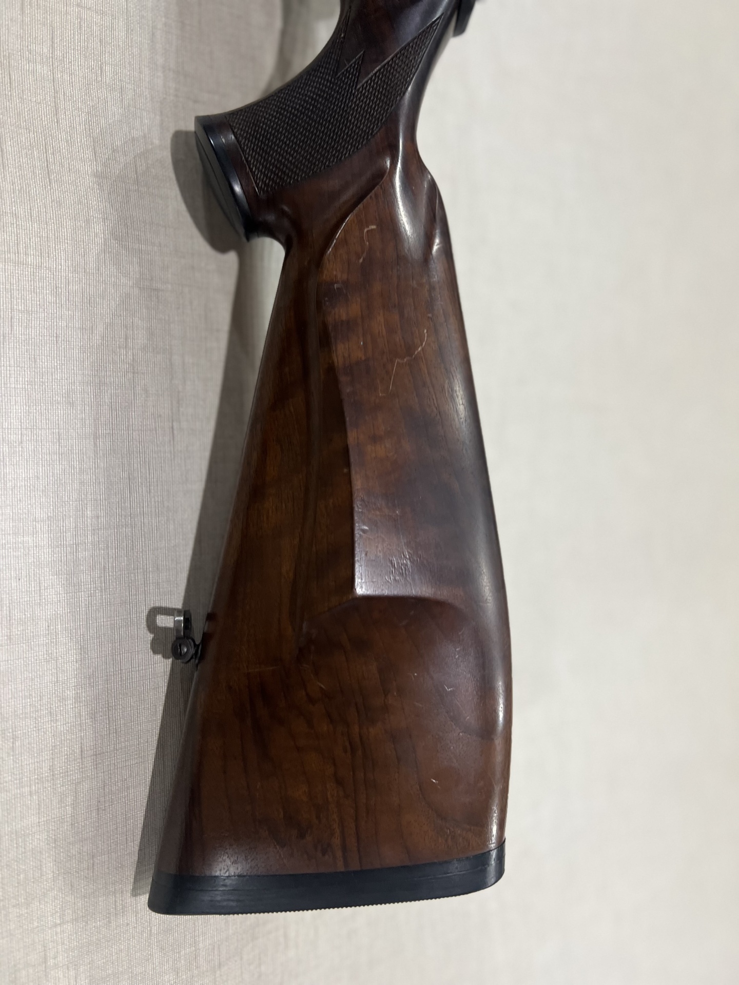 Rifle com coronha em madeira escura e cano metálico preto sobre fundo claro