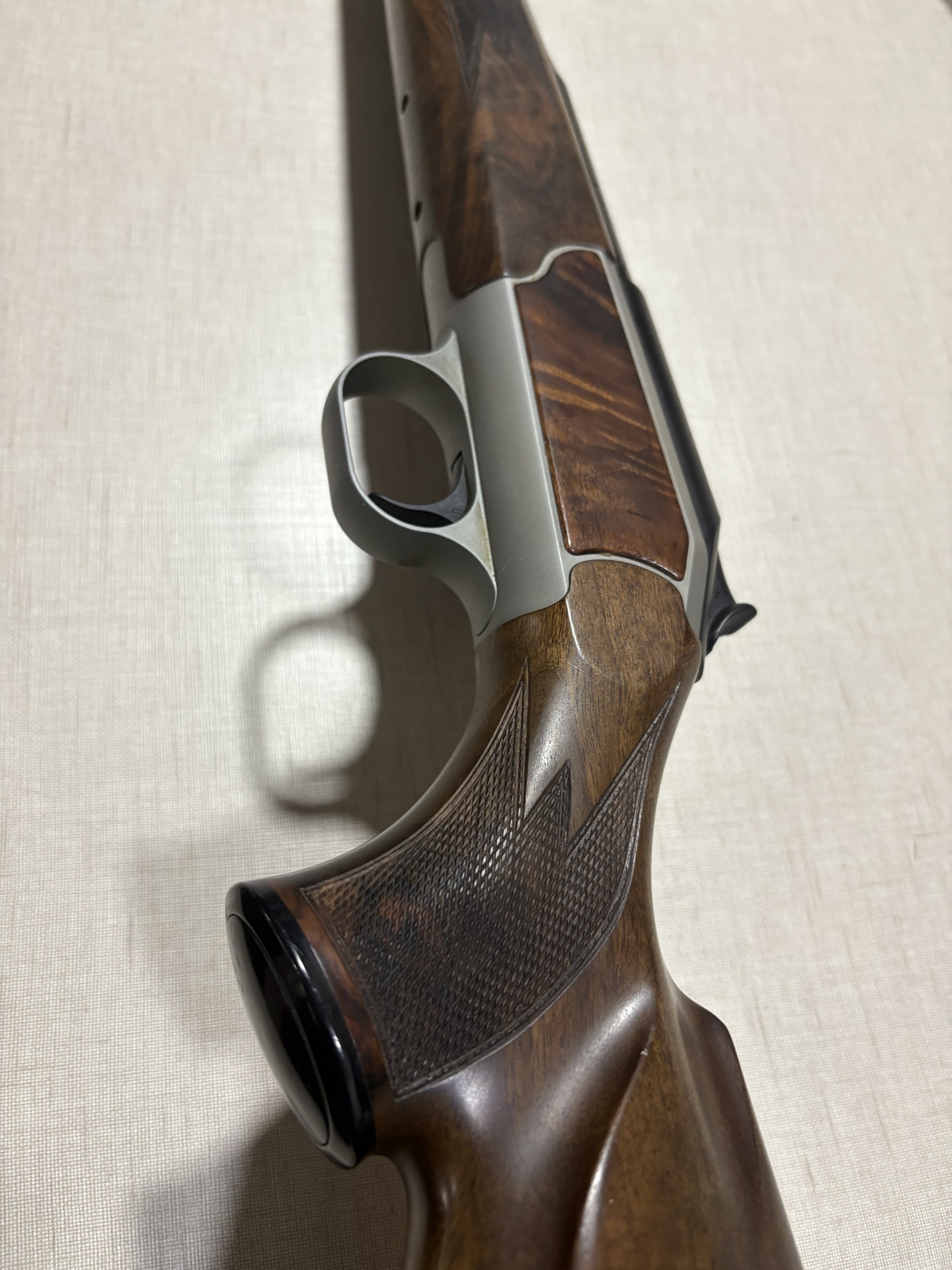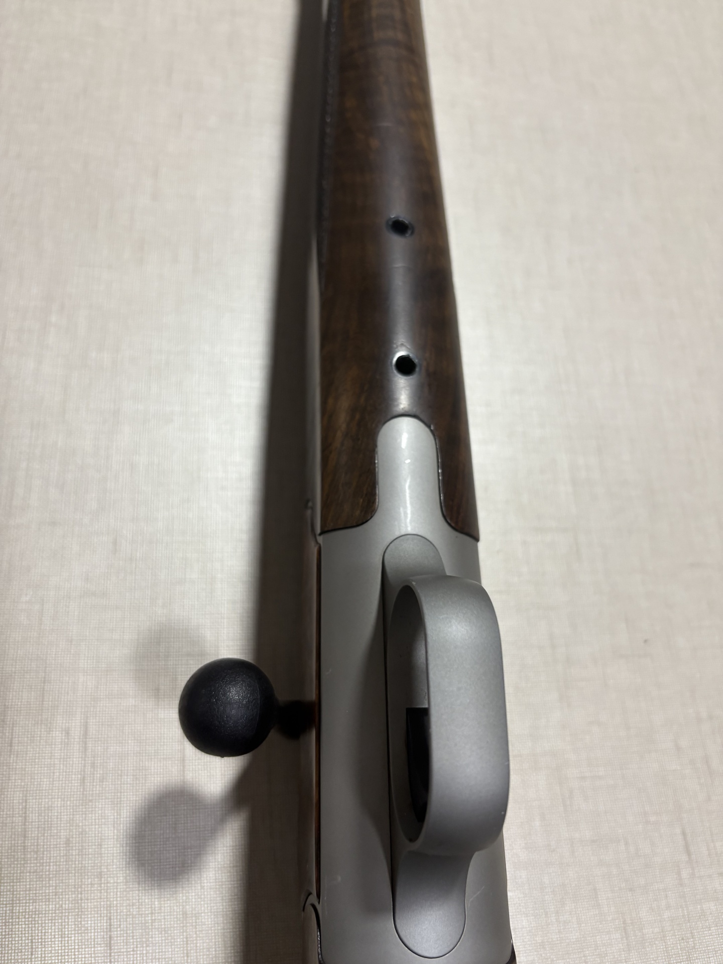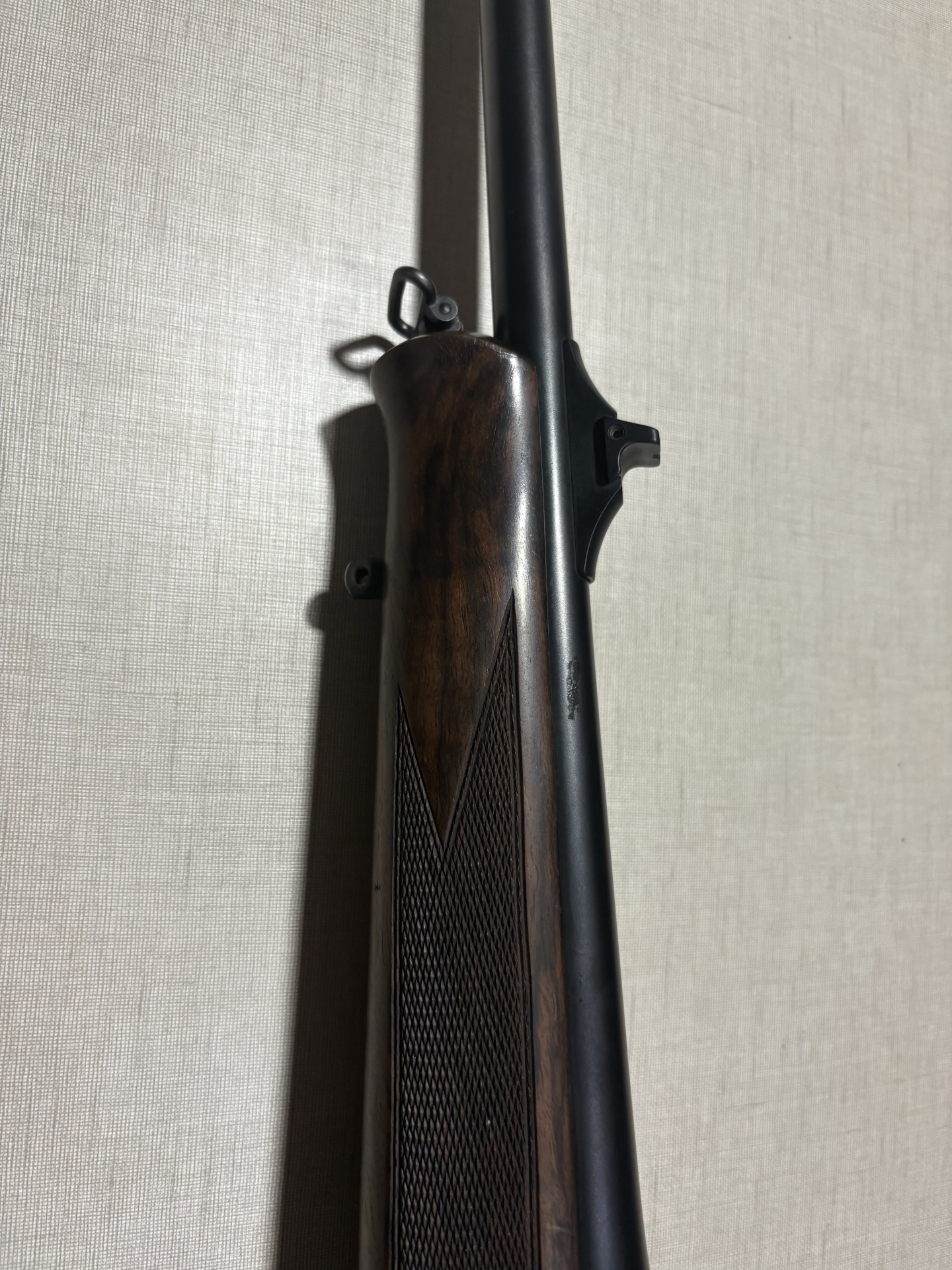 Parte traseira de espingarda ou rifle com madeira e metal cinza sobre fundo claro.