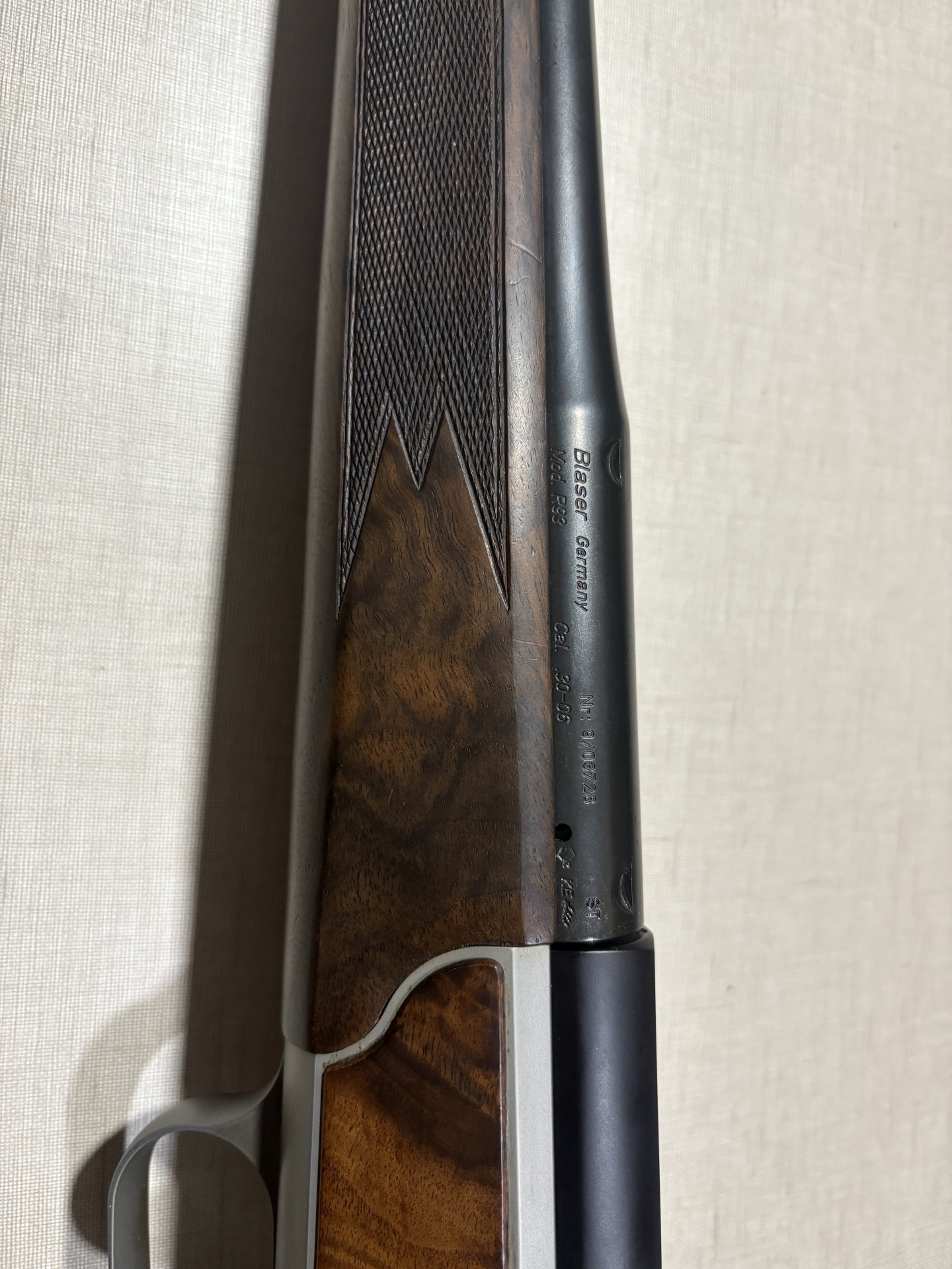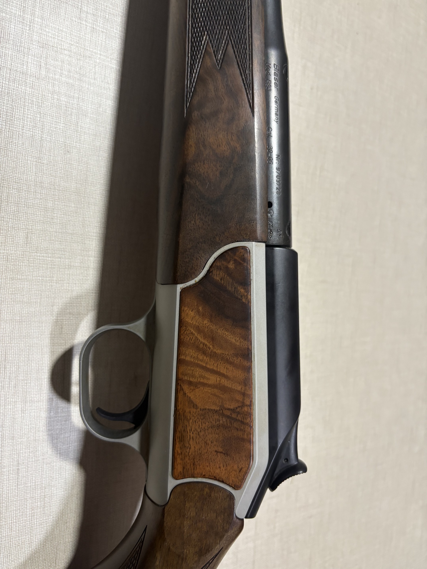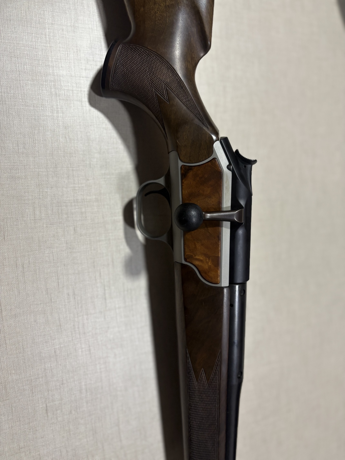 Parte traseira de espingarda ou rifle com madeira e metal cinza sobre fundo claro.