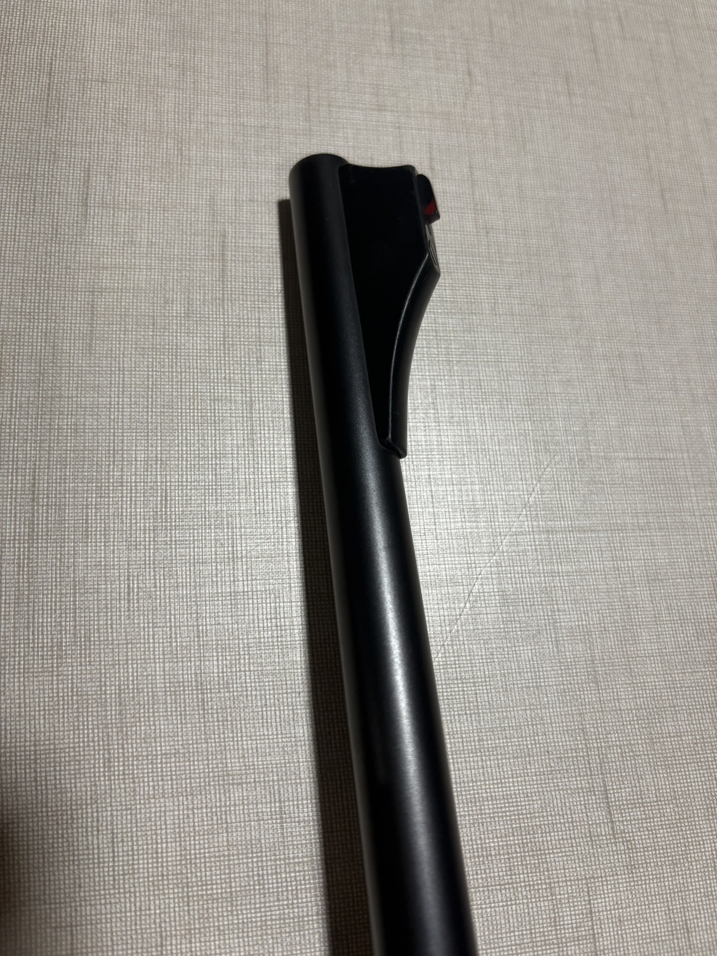 Rifle com coronha em madeira castanha e metal preto com botão vermelho
