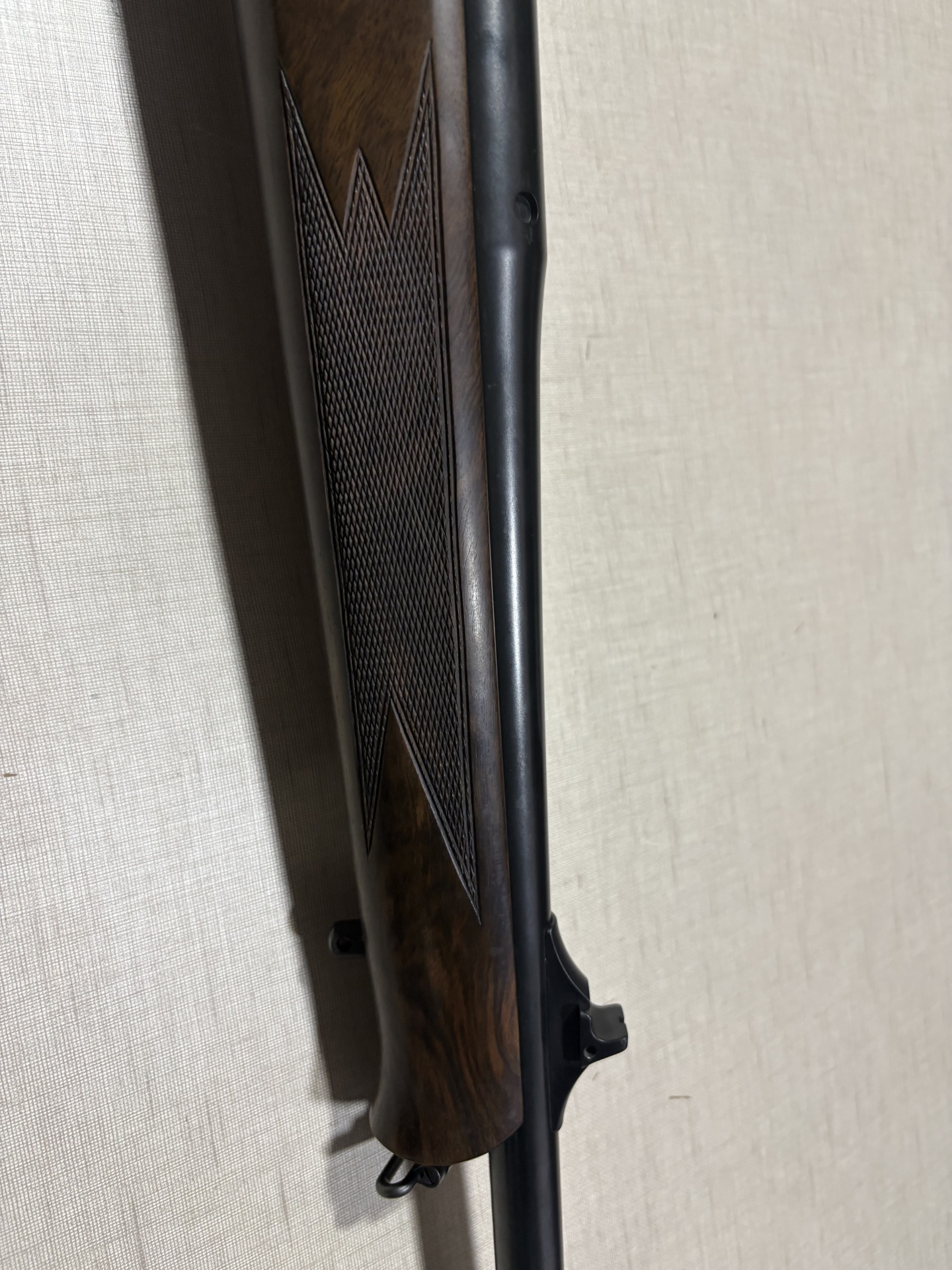 Coronha em madeira escura com padrão geométrico e cano de rifle em metal preto