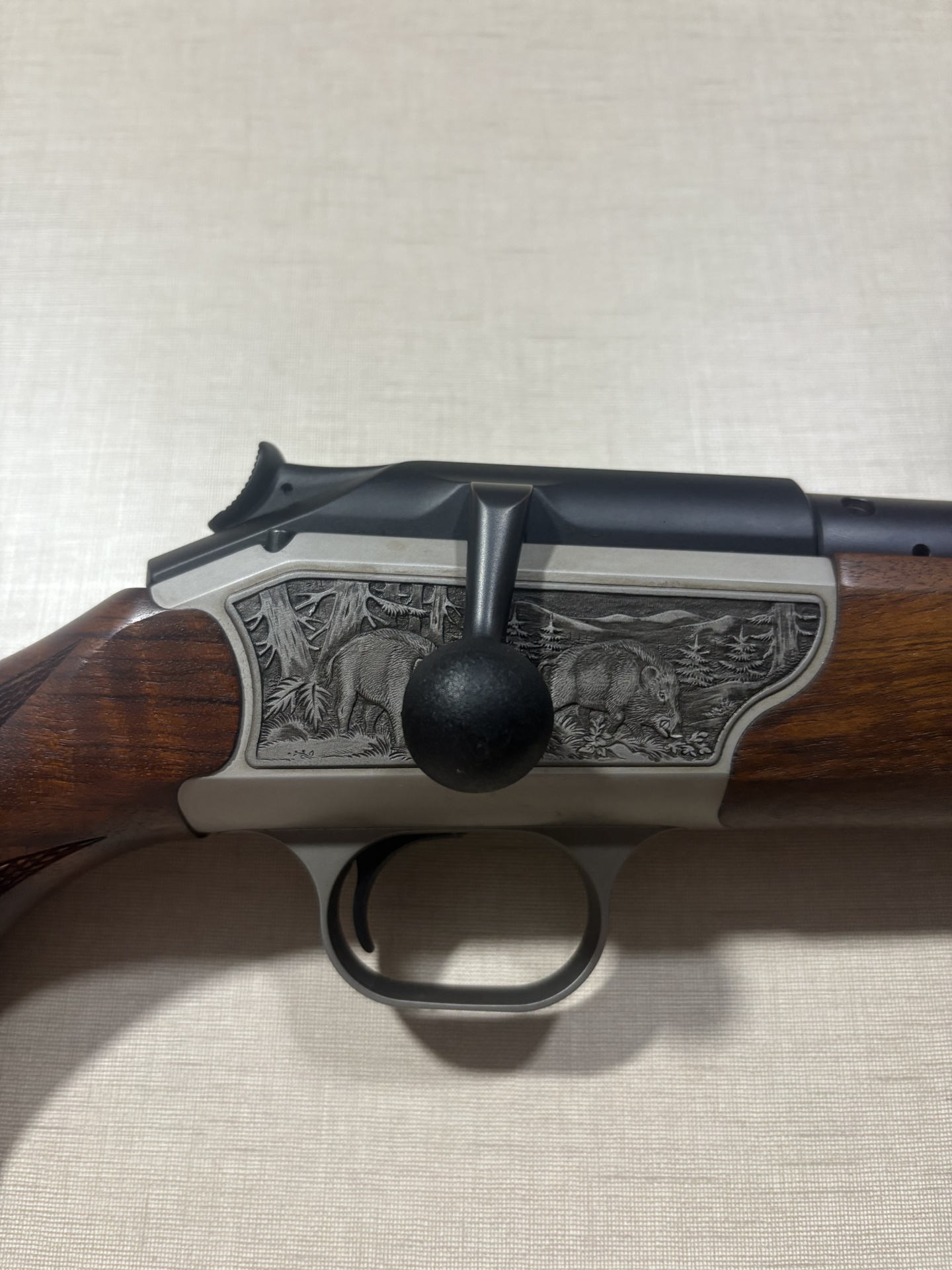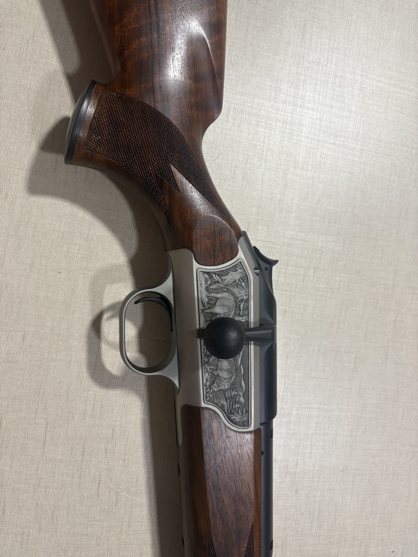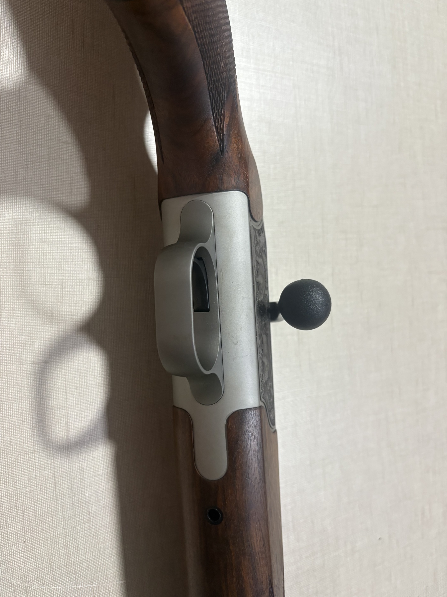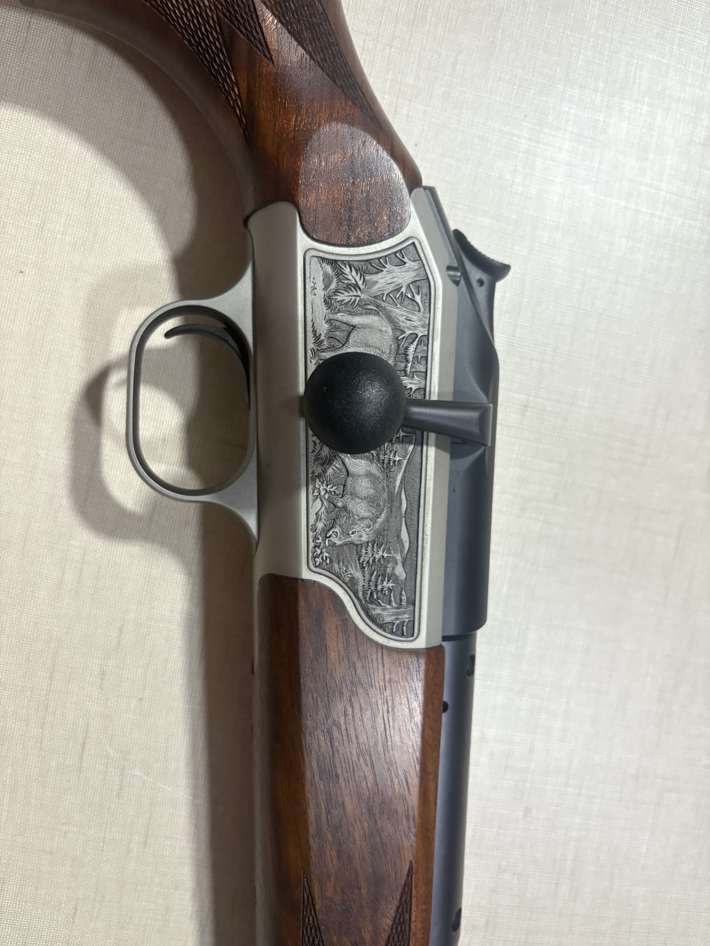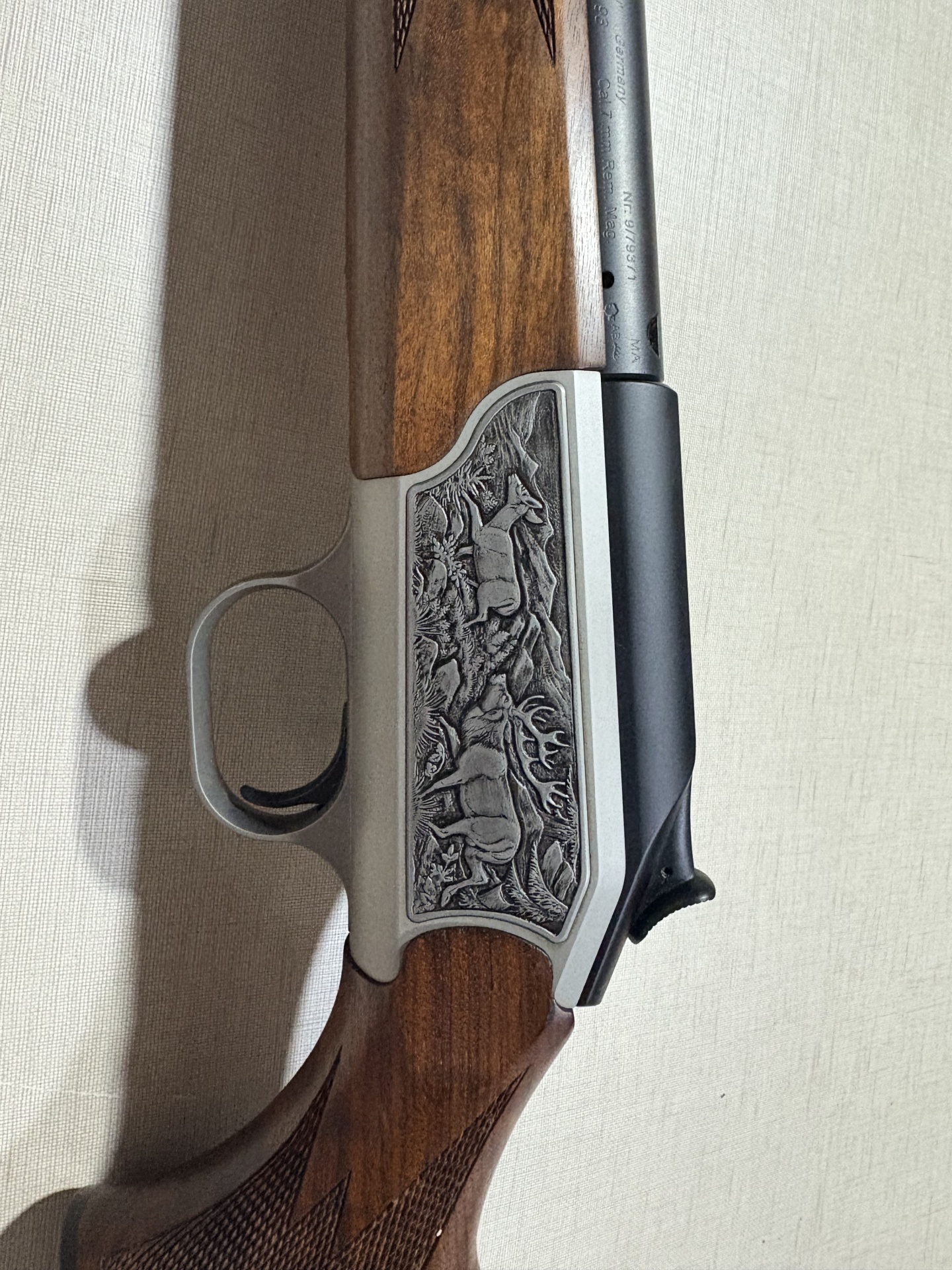 Rifle de caça com coronha em madeira castanha e caixa metálica prateada com gravuras de animais.