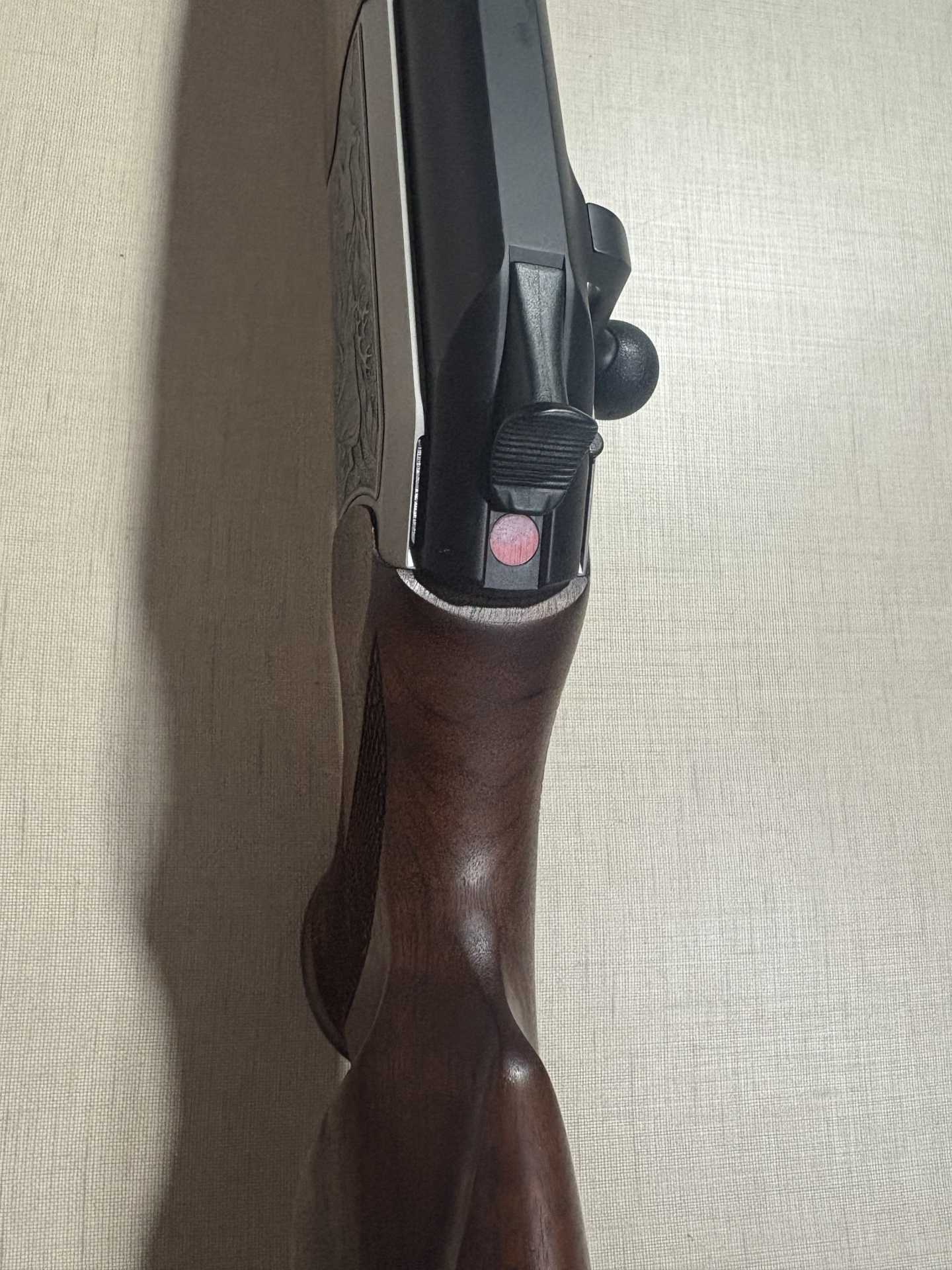 Corpo de arma de fogo com punho de madeira e gravação metálica detalhada de cervo
