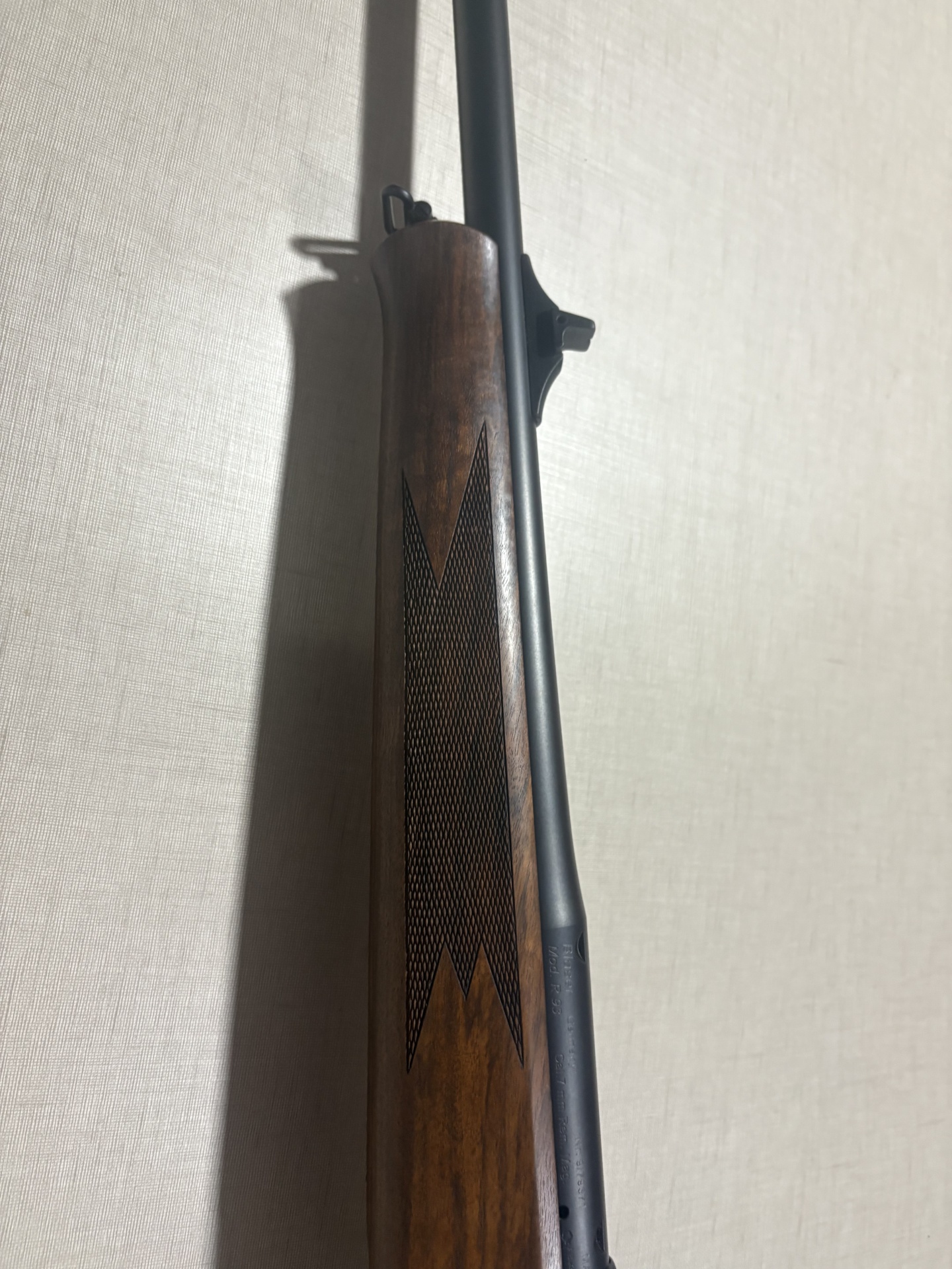 Rifle com coronha em madeira castanha e cano preto encostado a parede branca