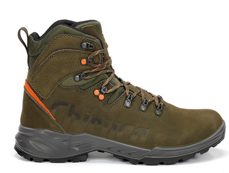 Bota de caminhada verde-oliva com detalhes laranja e sola preta