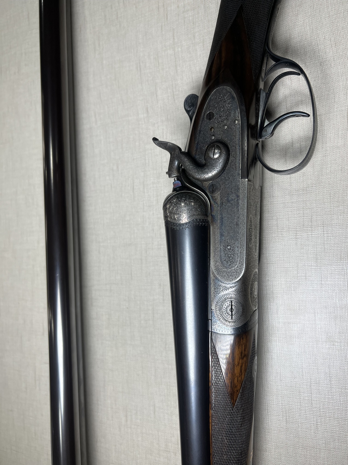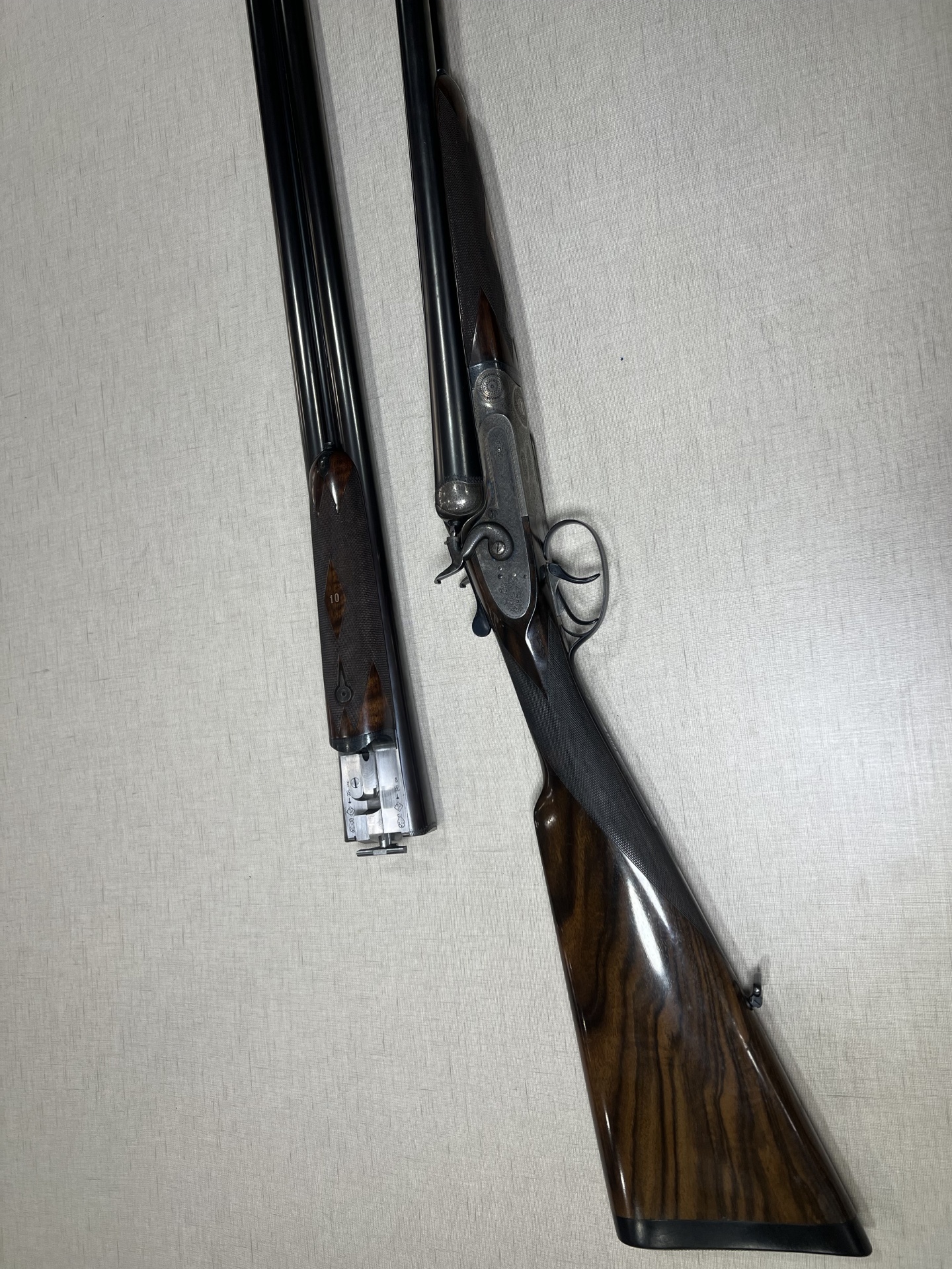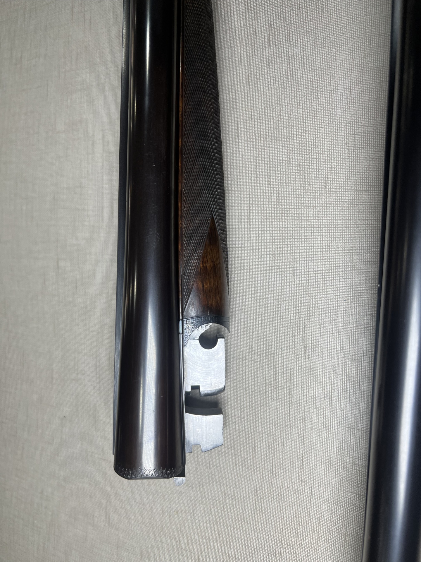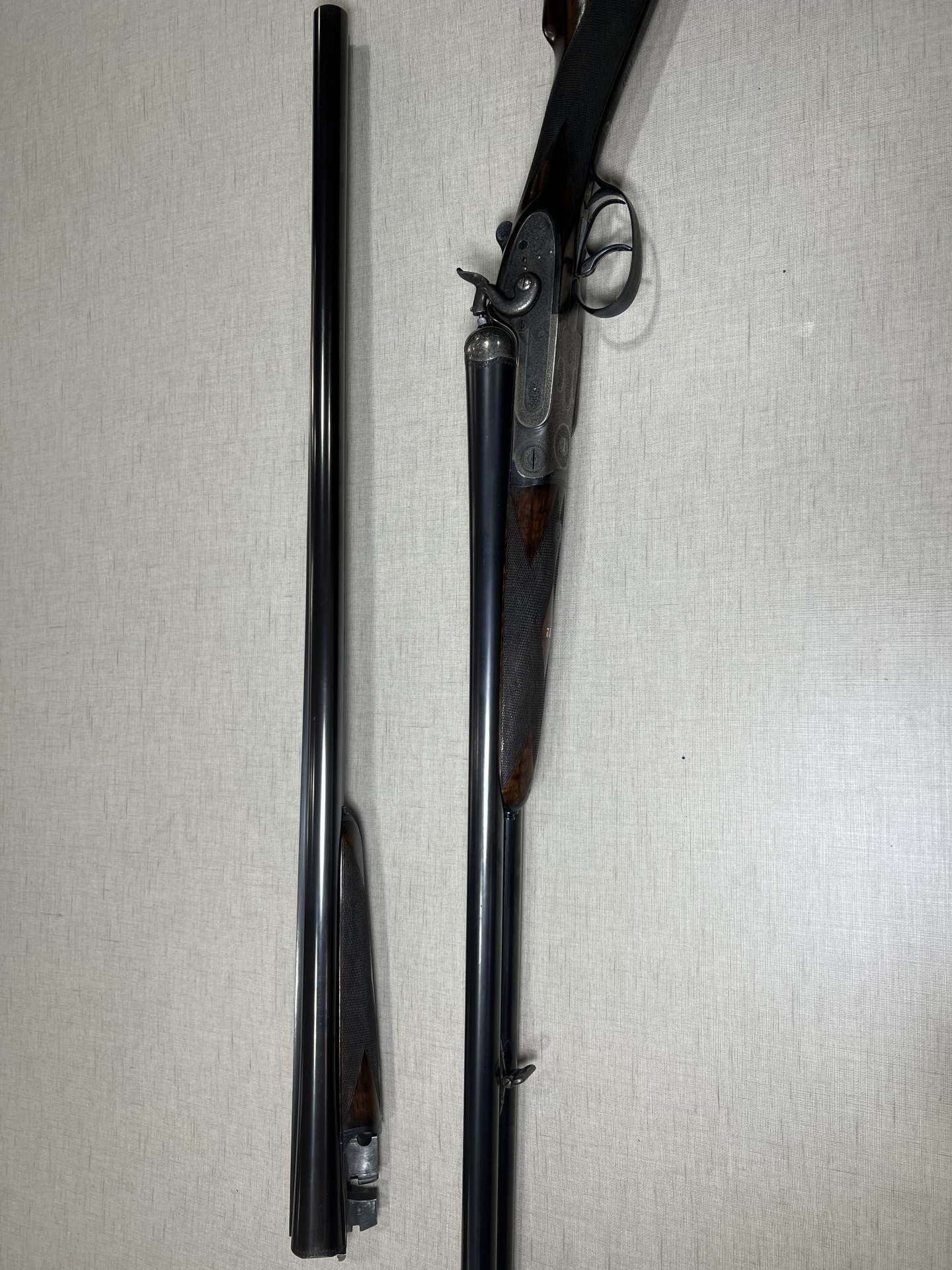 Espingarda de canos duplos desmontada sobre tecido cinzento