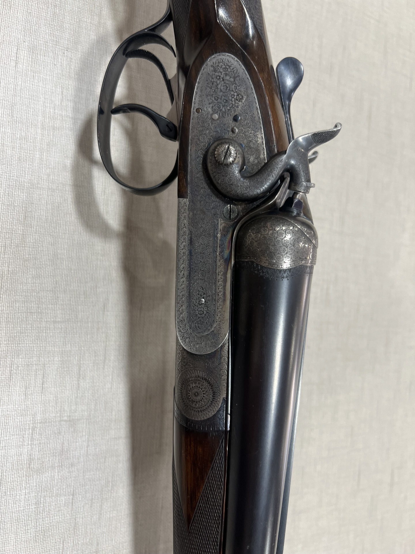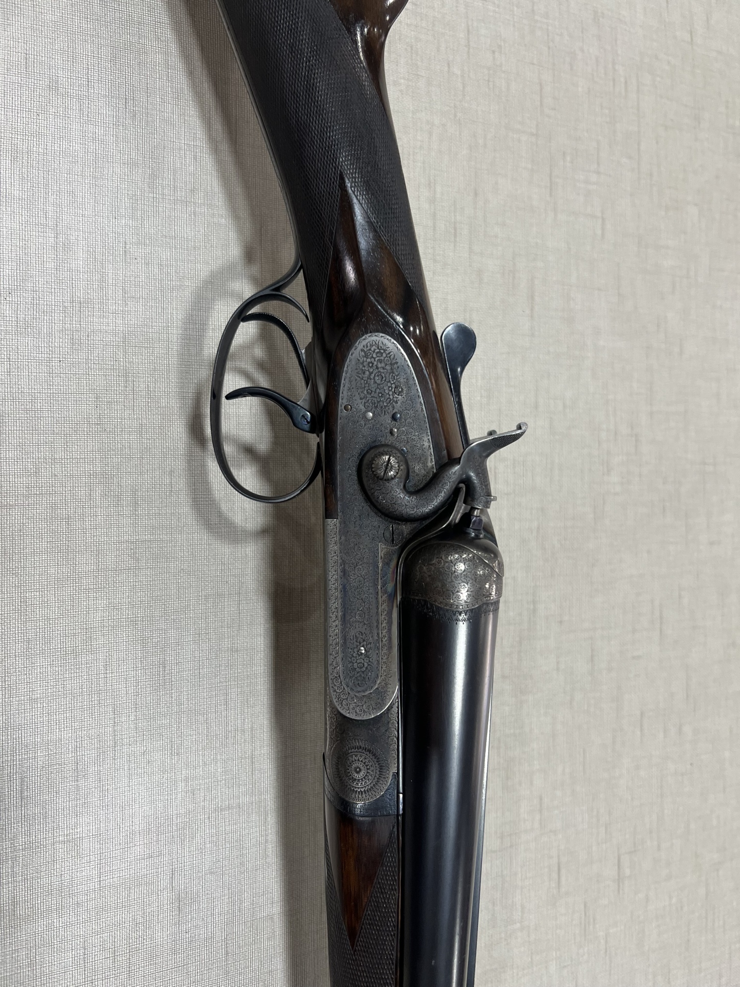 Espingarda de canos laterais em madeira e metal gravado