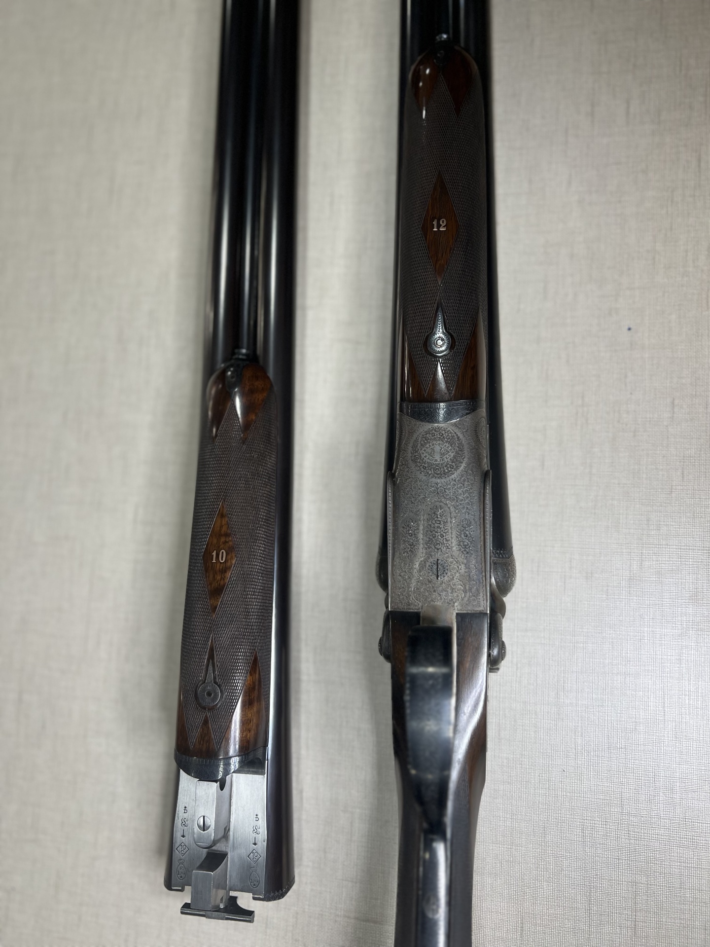 Duas armas de canos duplos com punhos de madeira e marcas numéricas