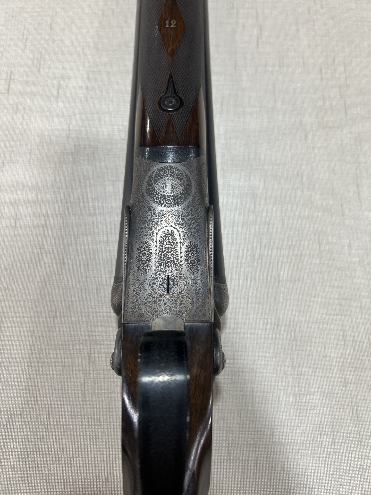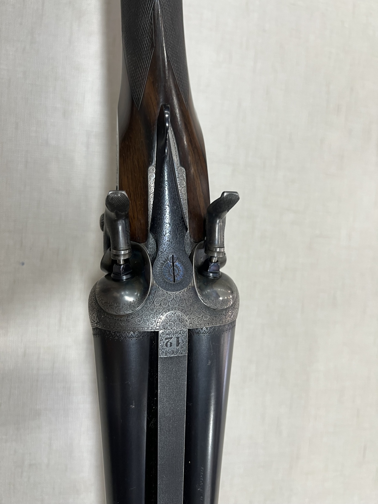 Espingarda dupla com detalhes gravados e número 61
