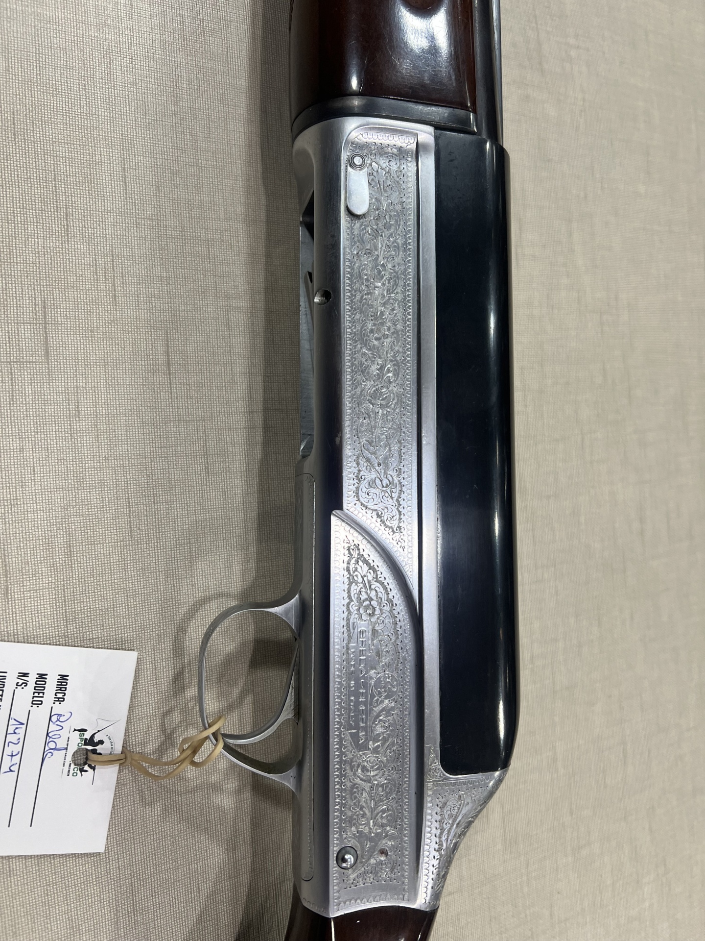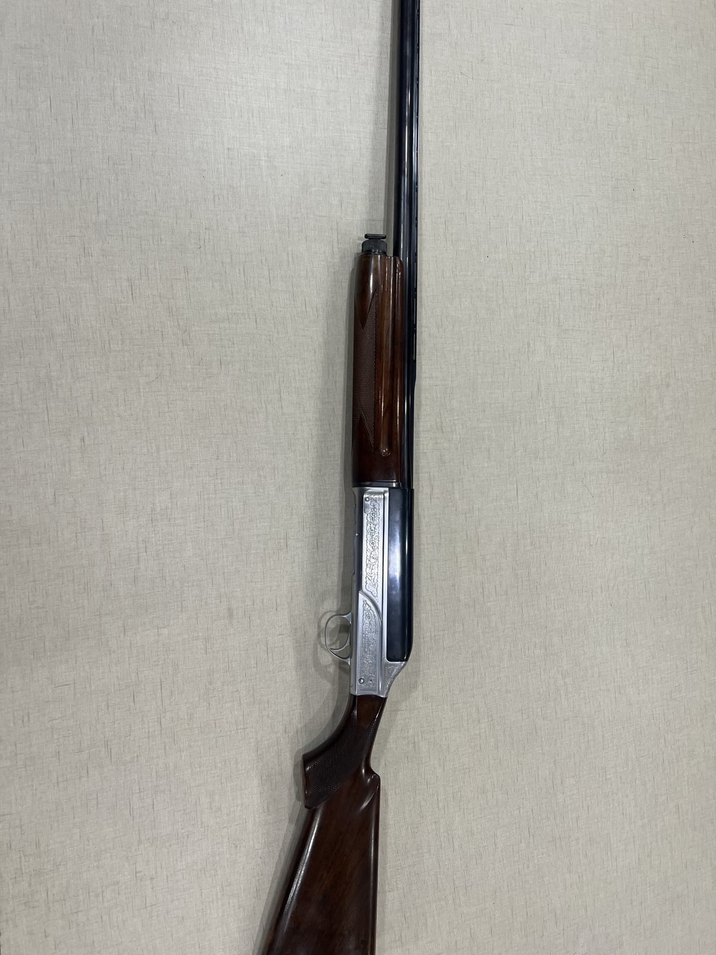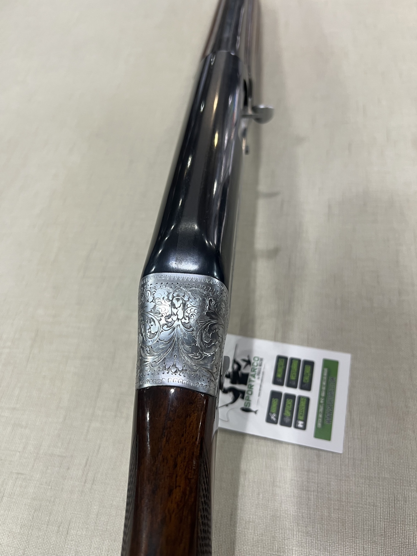 Espingarda de cano duplo com detalhes prateados e coronha em madeira