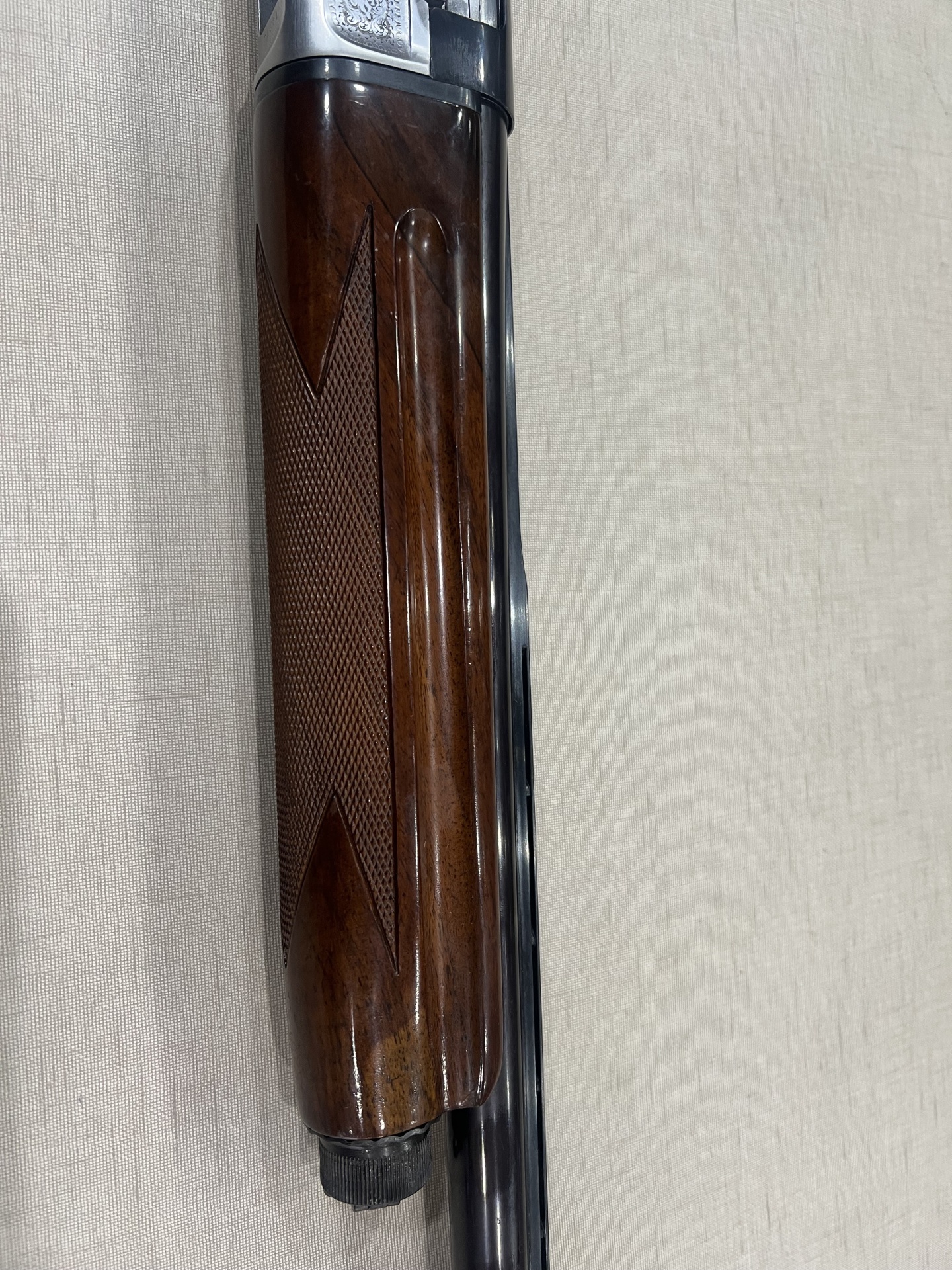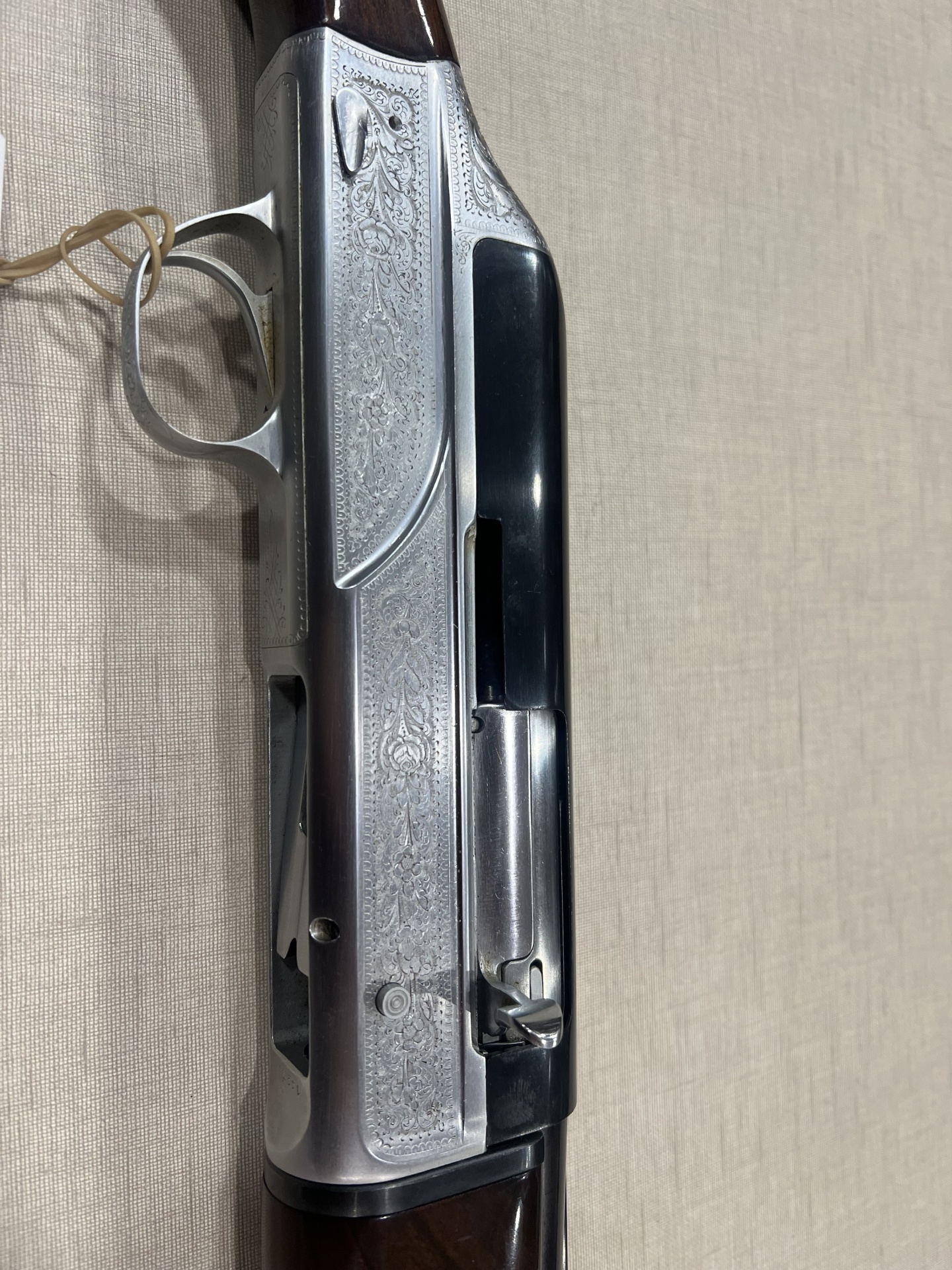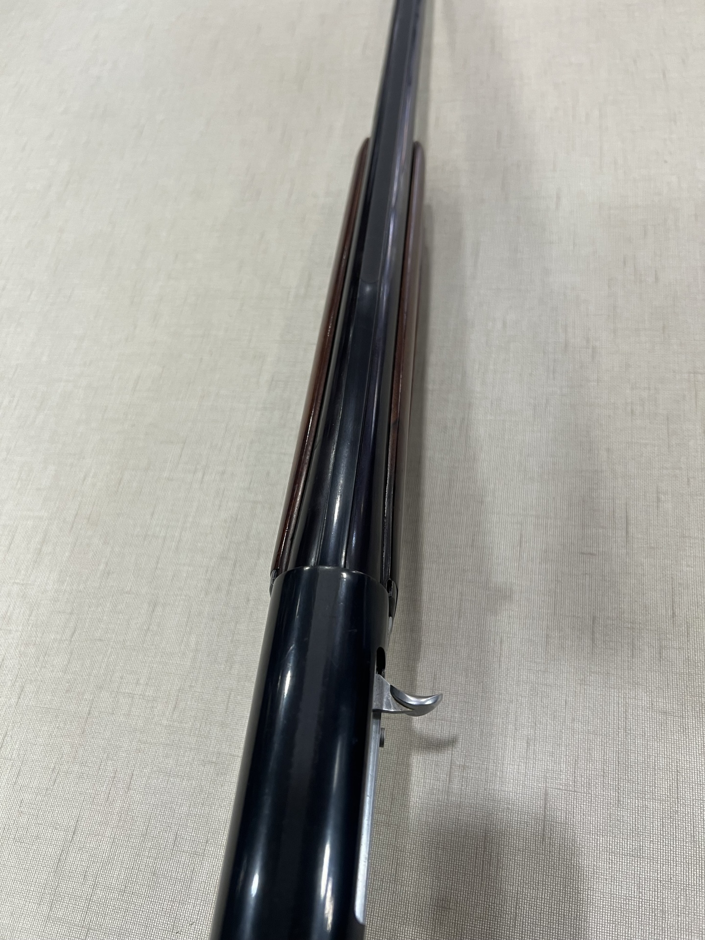 Cano de arma longa preta com gatilho prateado sobre superfície clara