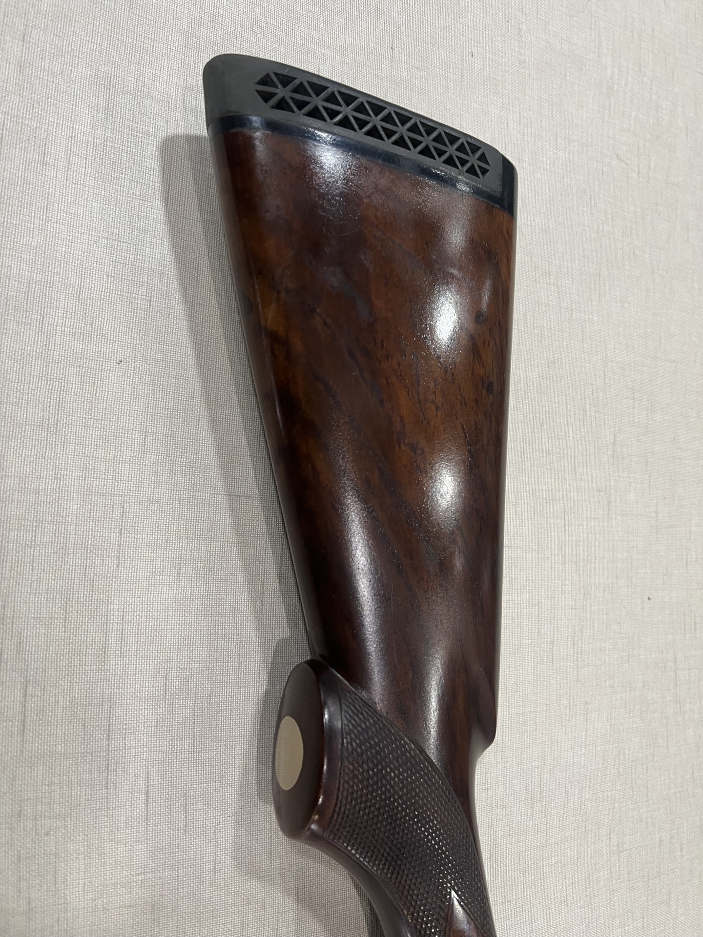 Coronha de arma de fogo em madeira castanha com acabamento em borracha preta