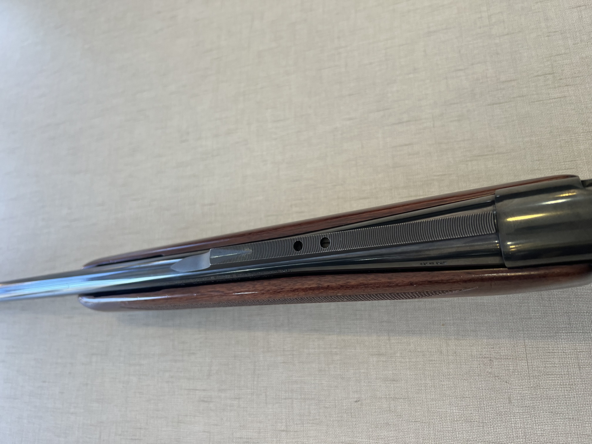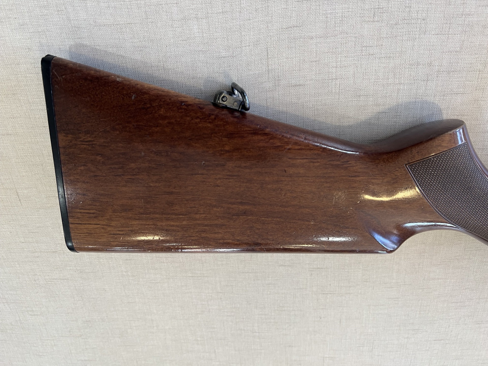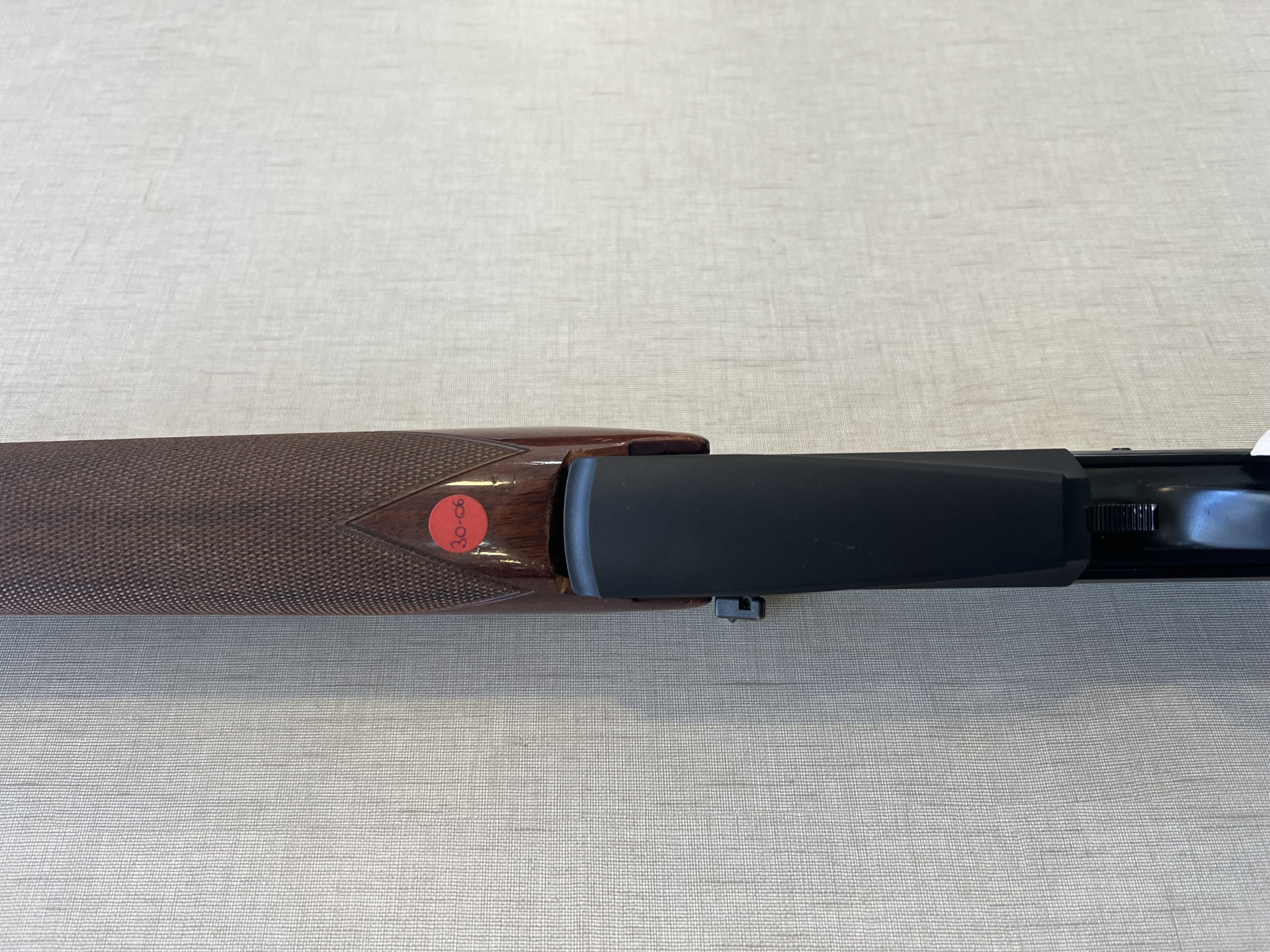 Espingarda com coronha de madeira castanha e detalhes pretos sobre tecido bege claro