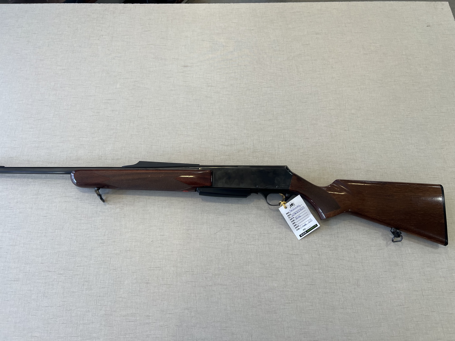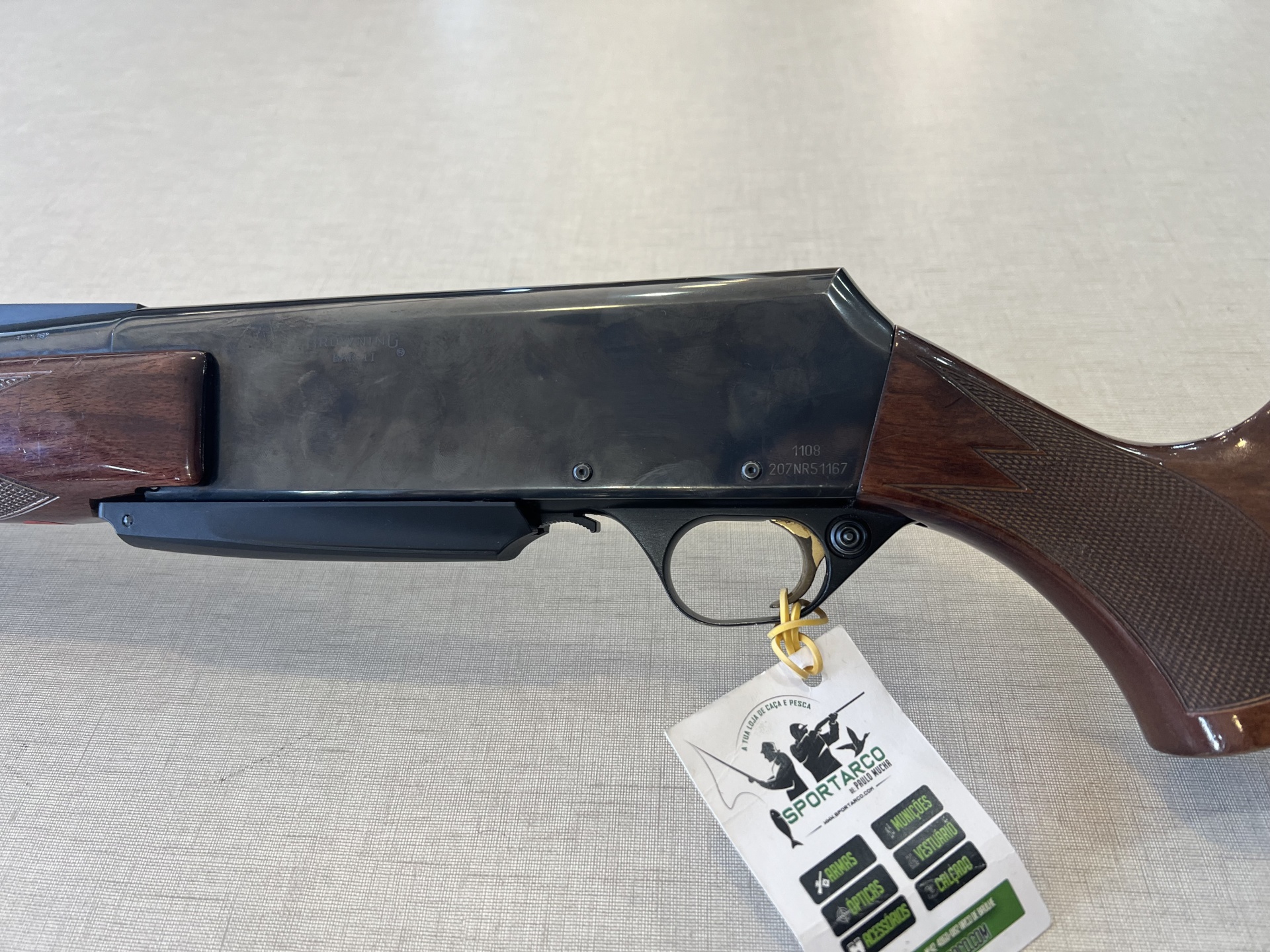Espingarda com corpo metálico preto e partes em madeira castanha com textura, com etiqueta branca pendurada