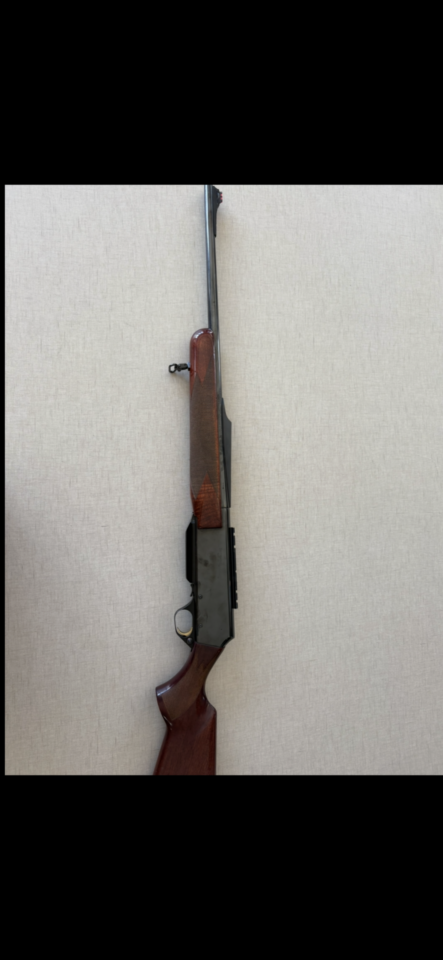 Espingarda com coronha de madeira castanha e parte superior preta com símbolo dourado