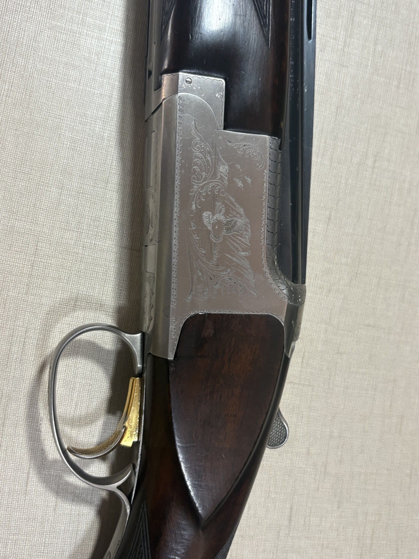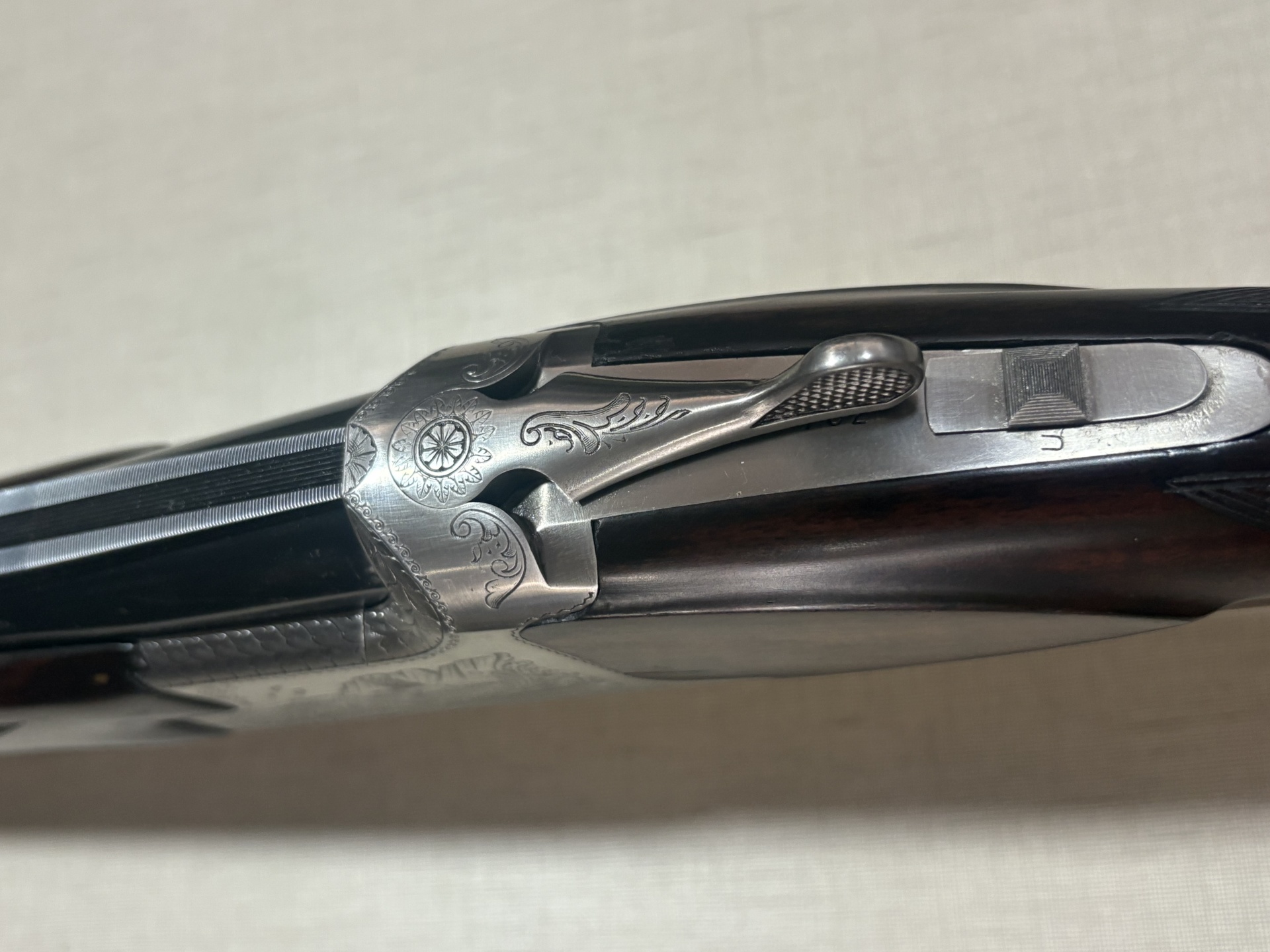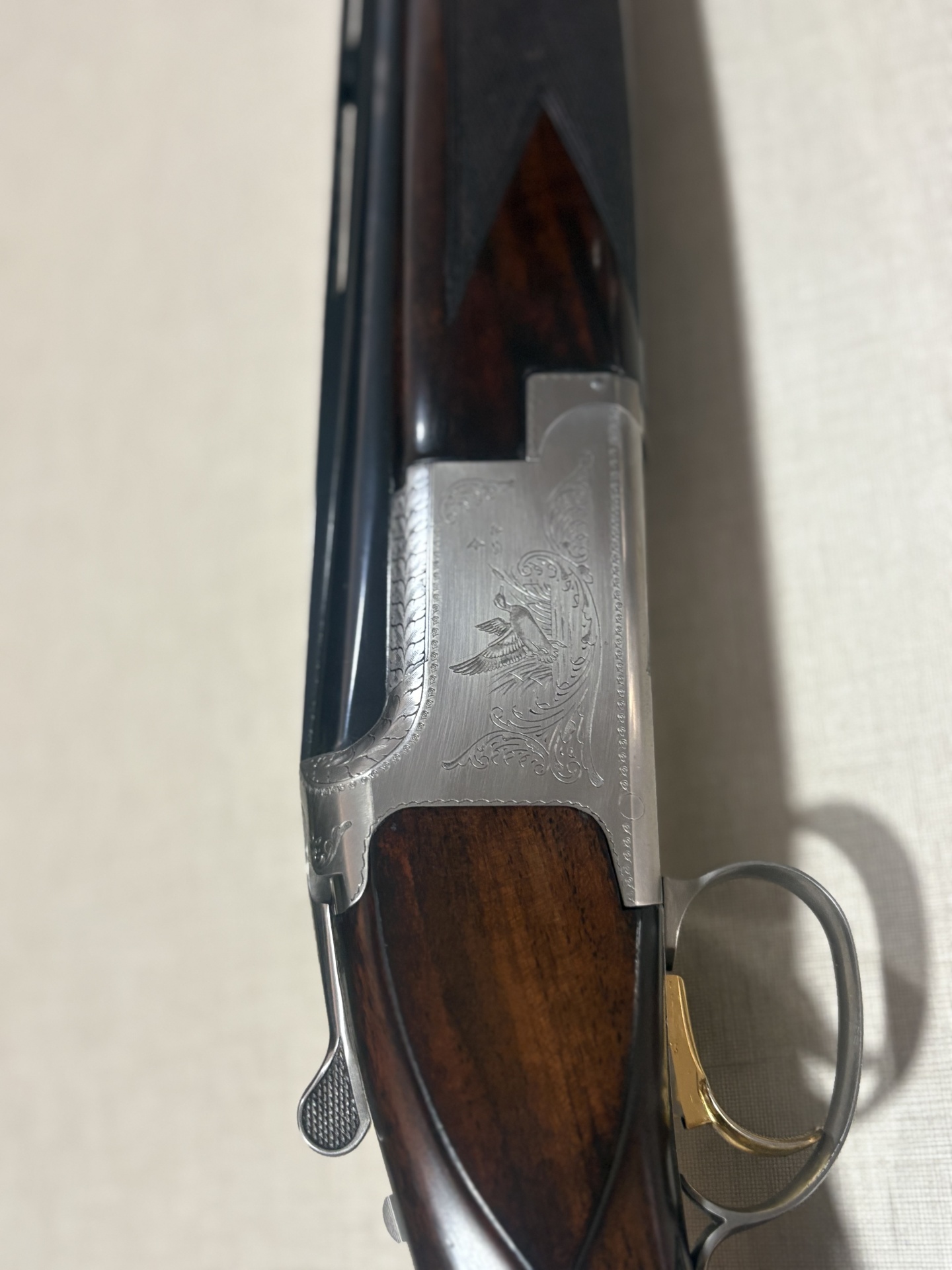 Espingarda de caça com coronha em madeira escura e gravura metálica