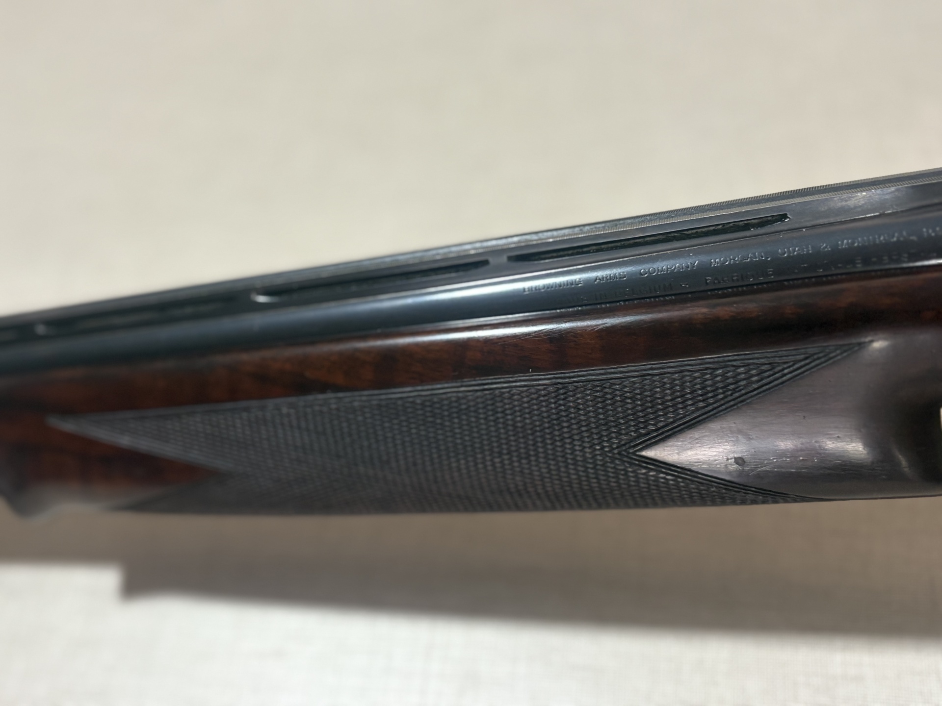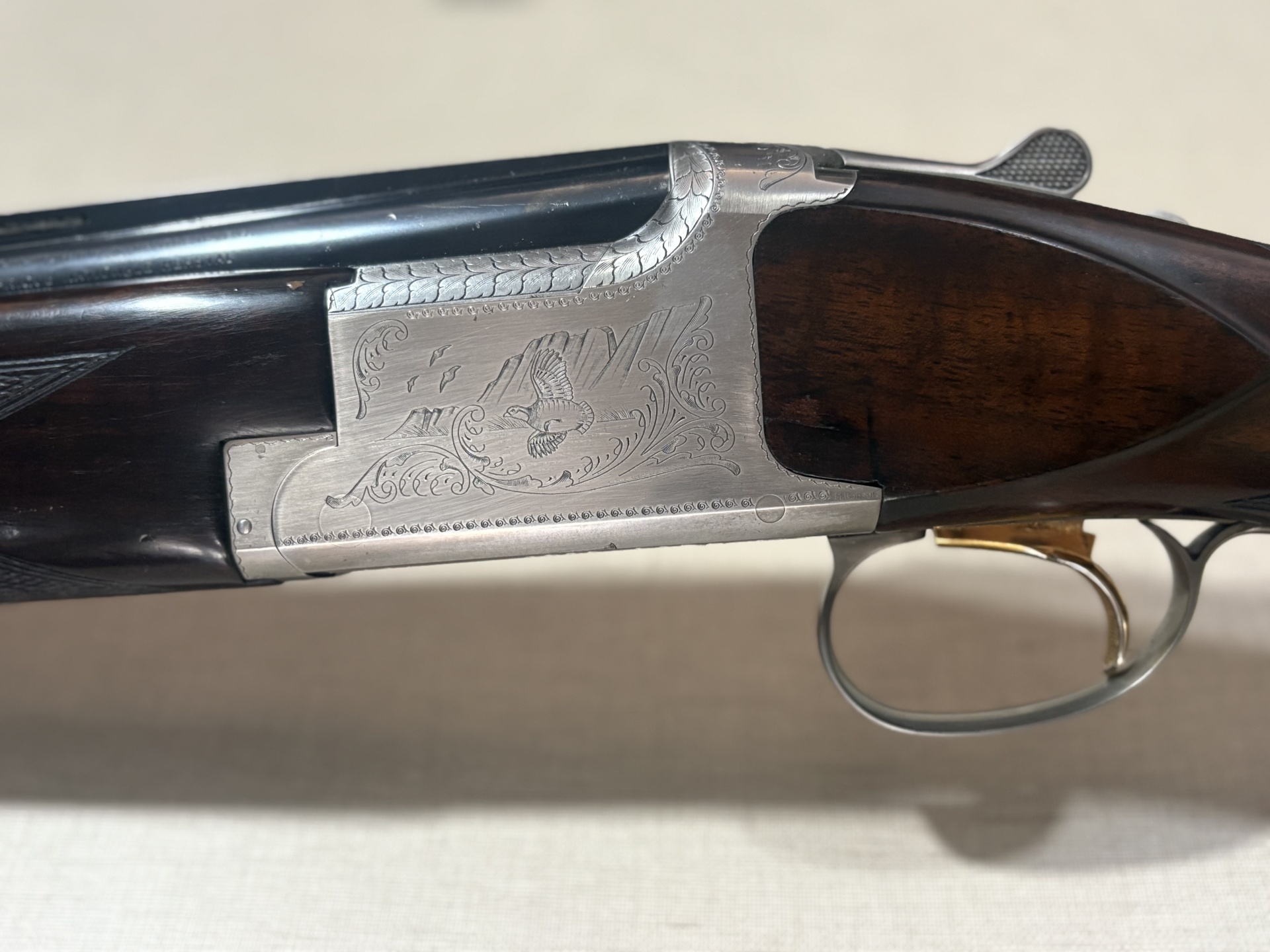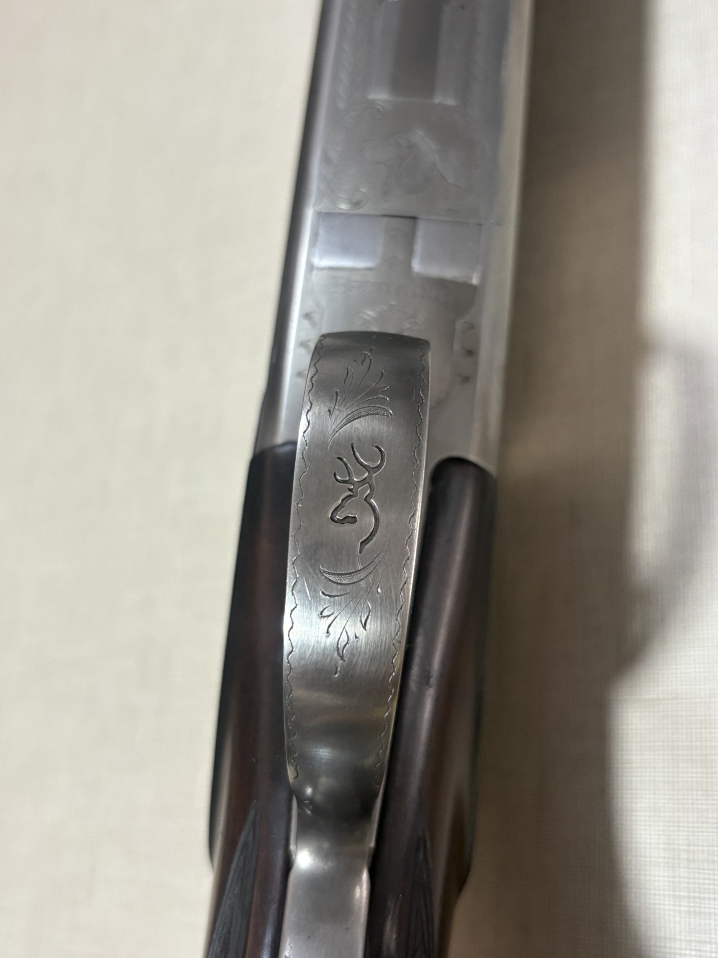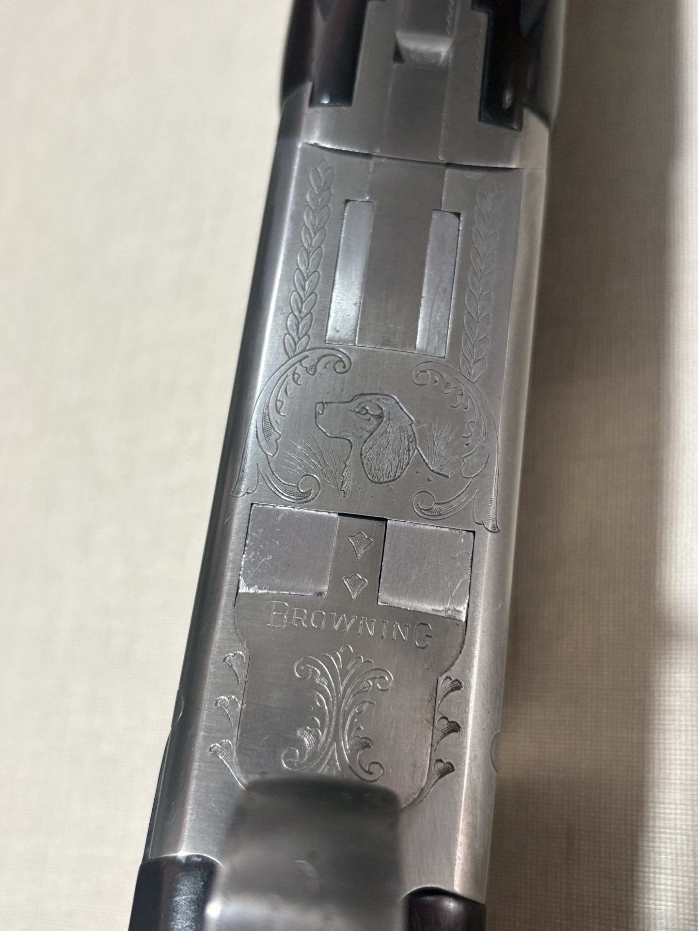 Espingarda de caça com coronha em madeira escura e gravura metálica